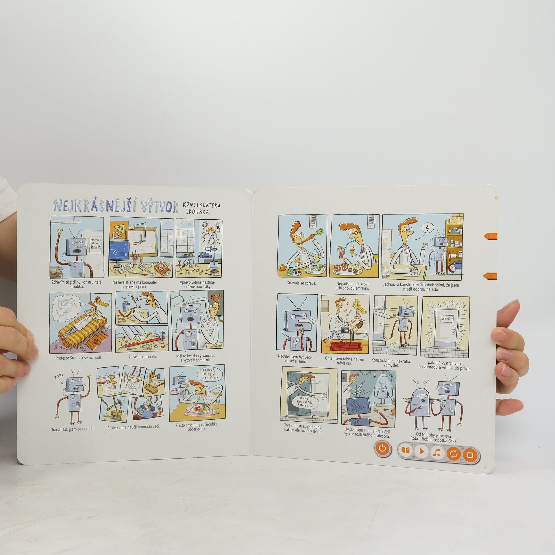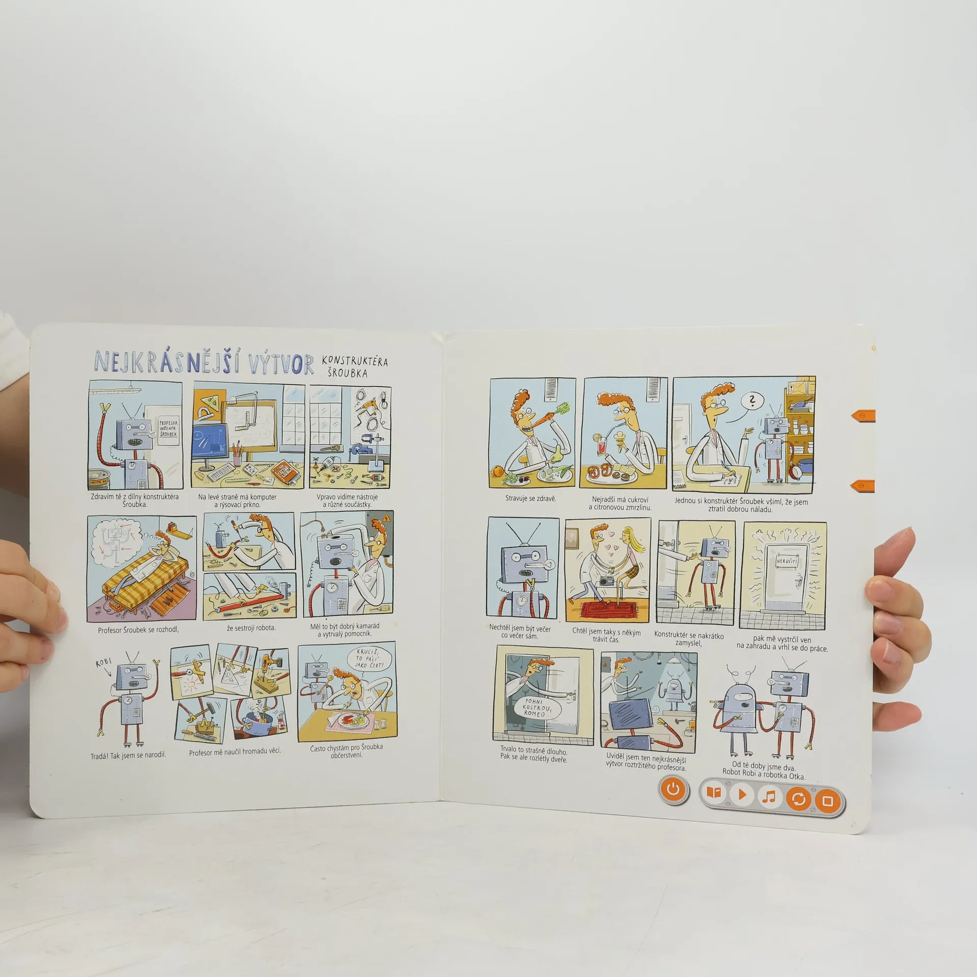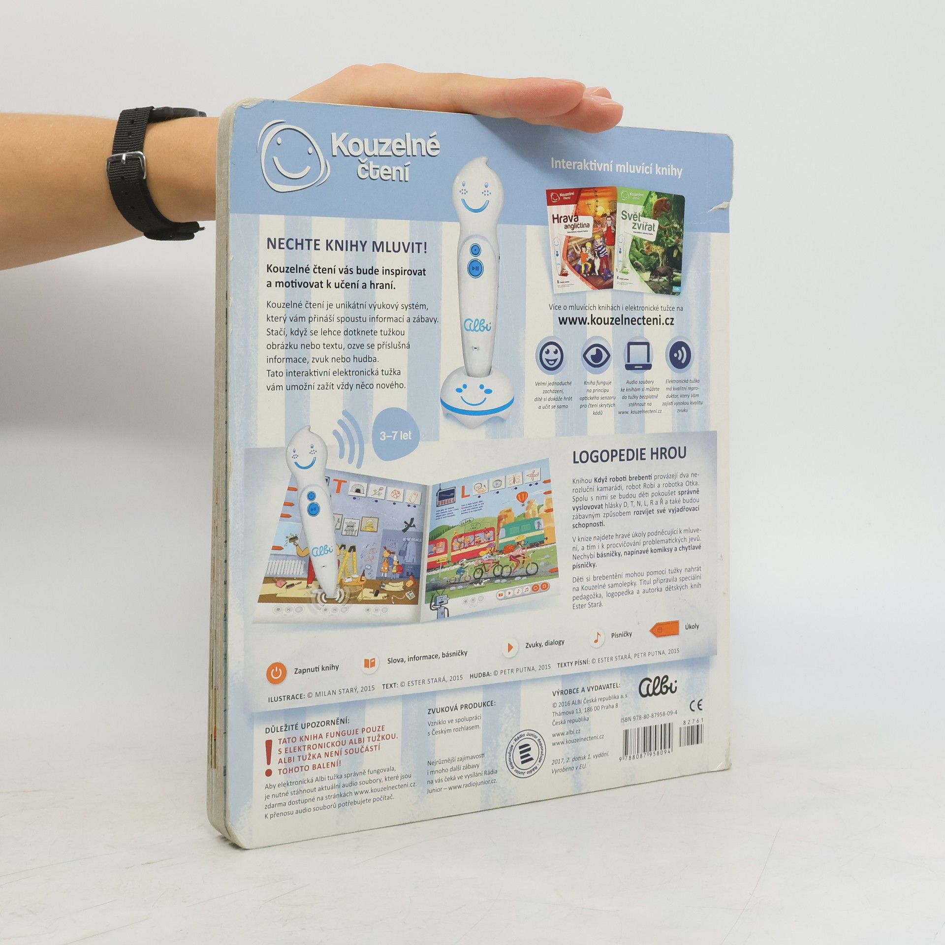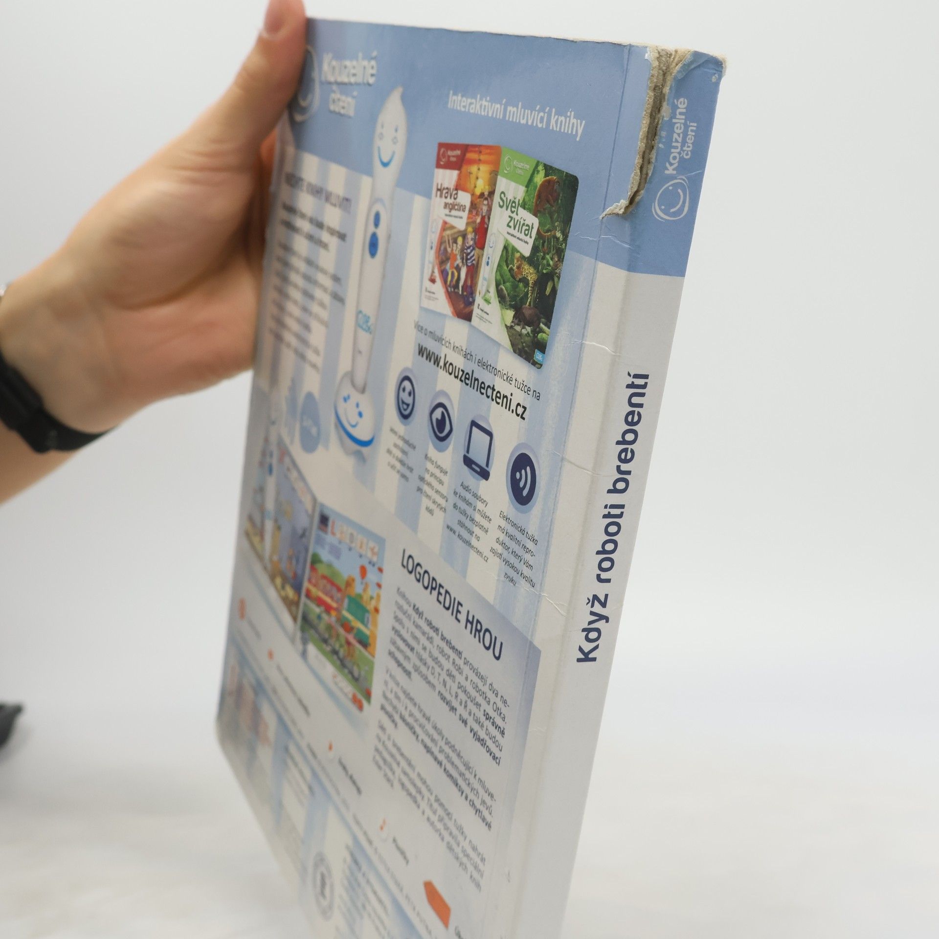 Interaktivní logopedická kniha Knihou děti provází dvě postavičky, robot Robi a robotka Otka, které jim s mluvením pomáhají. Spolu s nimi se děti pokouší správně vyslovovat hlásky D, T, N, L, R a Ř. Kniha obsahuje hravé úkoly podněcující děti k mluvení, a tím i k procvičování problematických jevů. Nechybí ani básničky, písničky a napínavé komiksy. Součástí knihy jsou i kouzelné samolepky, s nimiž si děti mohou svoji výslovnost nahrát a poslechnout. Kniha obsahuje přes 1500 zvuků a textů.