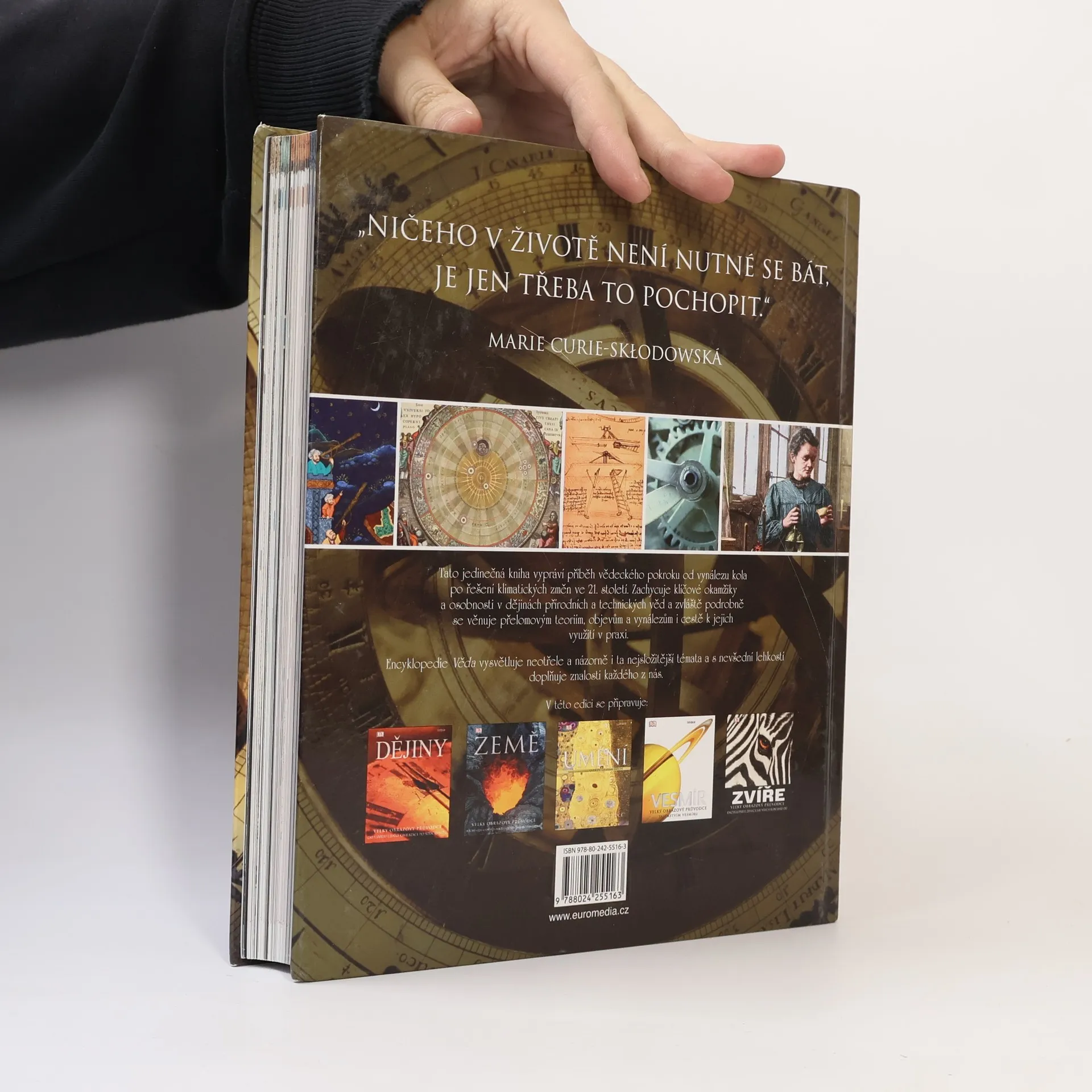 Tato jedinečná kniha vypráví příběh vědeckého pokroku od vynálezu kola až po řešení klimatických změn ve 21. století. Zachycuje všechny klíčové okamžiky nových objevů a ukazuje, jak lidé a jejich myšlenky a vynálezy měnili náš svět. Encyklopedie Věda, vybavená nádhernými fotografiemi a názornými ilustracemi, představuje i ta nejsložitější témata jednoduchým a srozumitelným způsobem, zpřístupňujícím tak lidské vědění čtenářům všech věkových kategorií.