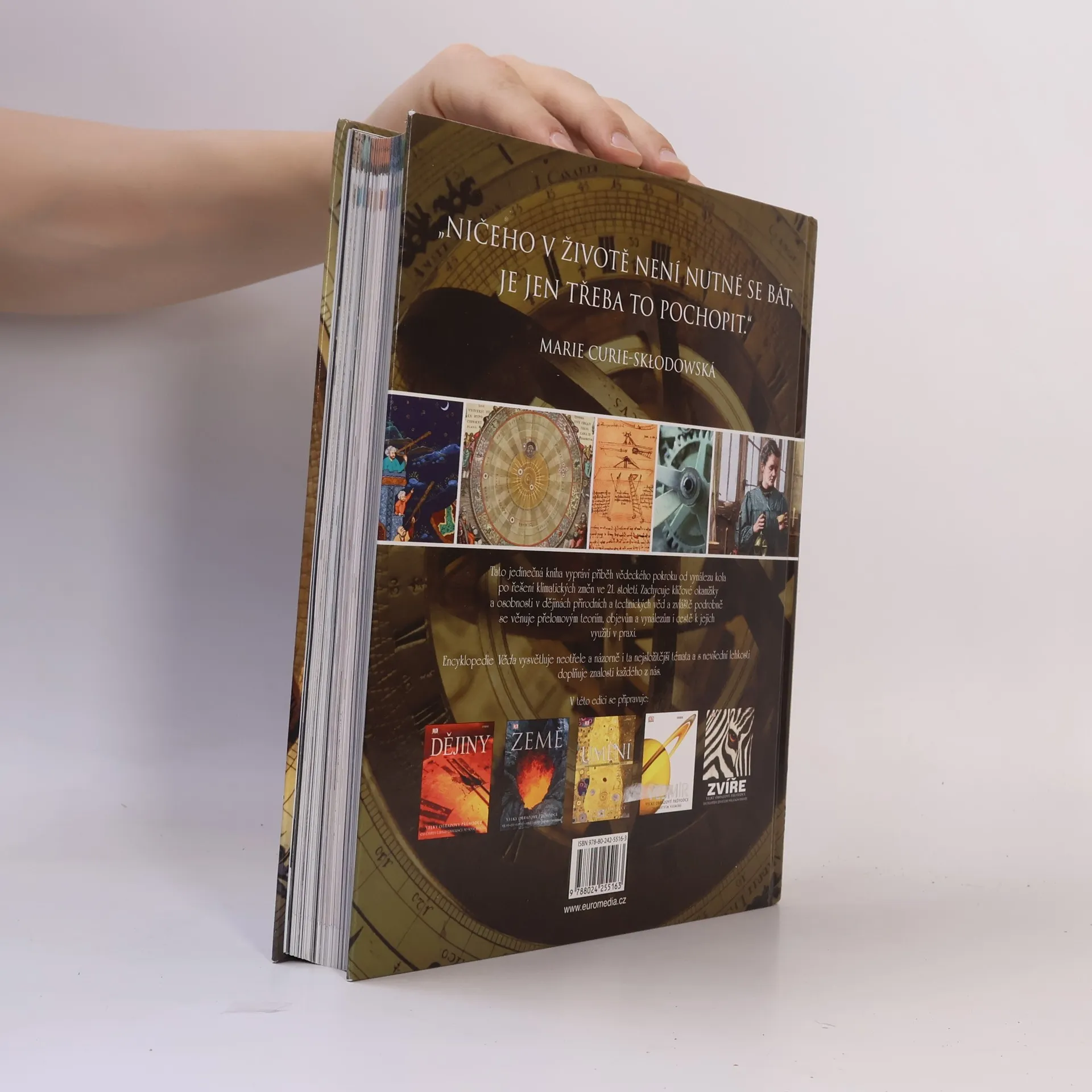 Tato jedinečná kniha vypráví příběh vědeckého pokroku od vynálezu kola až po řešení klimatických změn ve 21. století. Zachycuje všechny klíčové okamžiky nových objevů a ukazuje, jak lidé a jejich myšlenky a vynálezy měnili náš svět. Encyklopedie Věda, vybavená nádhernými fotografiemi a názornými ilustracemi, představuje i ta nejsložitější témata jednoduchým a srozumitelným způsobem, zpřístupňujícím tak lidské vědění čtenářům všech věkových kategorií.