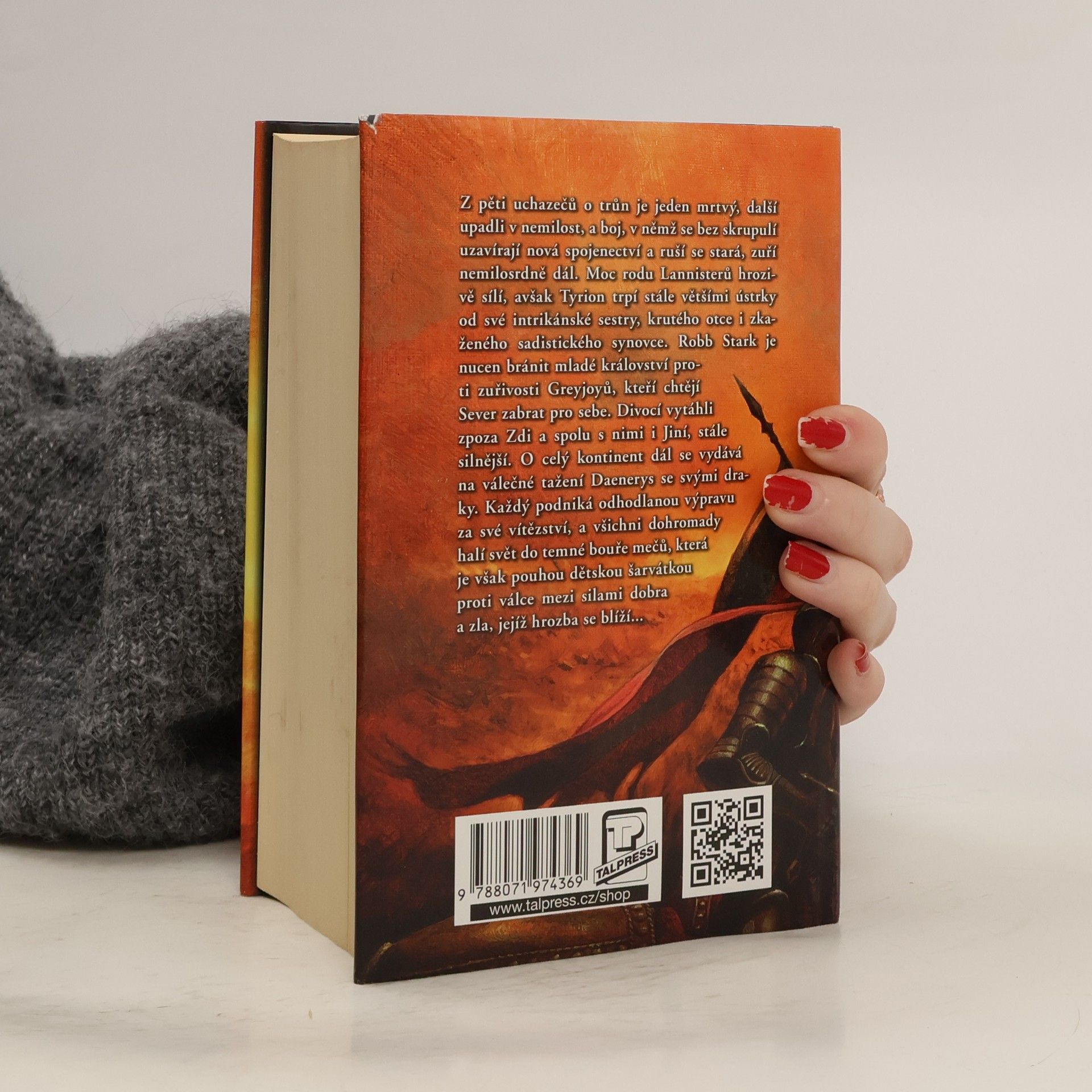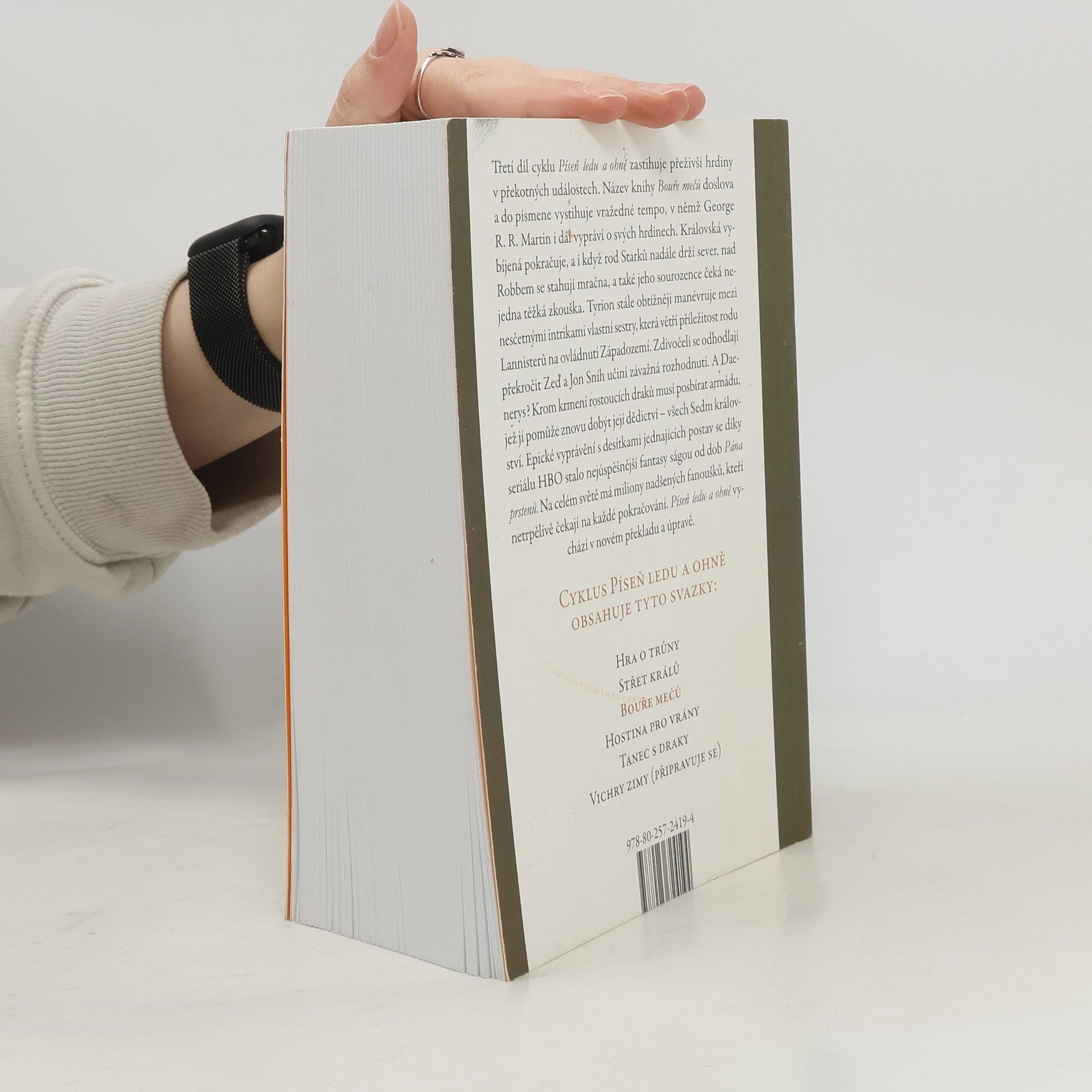 Z pěti uchazečů o trůn je jeden mrtvý, další upadli v nemilost, a boj, v němž jsou bez skrupulí uzavírána nová spojenectví a rušena stará, zuří nemilosrdně dál. Moc rodu Lannisterů hrozivě sílí, avšak Tyrion trpí stále většími ústrky od své intrikánské sestry, krutého otce i zkaženého sadistického synovce. Robb Stark je nucen bránit mladé království proti zuřivosti Greyjoyů, kteří si chtějí Sever zabrat pro sebe. Divocí vytáhli zpoza Zdi a spolu s nimi nabývají na síle Jiní. O celý kontinent dál se vydává na válečné tažení Daenerys a její draci nebezpečně rostou.Každý podniká odhodlanou výpravu za své vítězství, a všichni dohromady halí svět do temné bouře mečů, která je však pouhou dětskou šarvátkou ve srovnání s válkou mezi silami dobra a zla, jejíž hrozba se blíží…