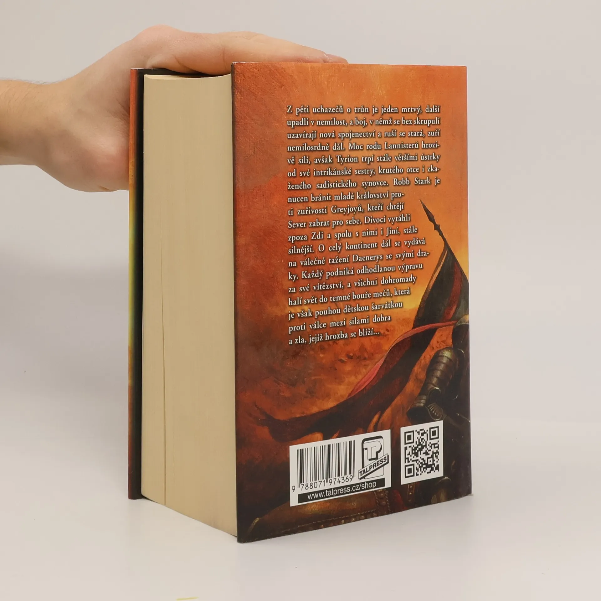 Z pěti uchazečů o trůn je jeden mrtvý, další upadli v nemilost, a boj, v němž jsou bez skrupulí uzavírána nová spojenectví a rušena stará, zuří nemilosrdně dál. Moc rodu Lannisterů hrozivě sílí, avšak Tyrion trpí stále většími ústrky od své intrikánské sestry, krutého otce i zkaženého sadistického synovce. Robb Stark je nucen bránit mladé království proti zuřivosti Greyjoyů, kteří si chtějí Sever zabrat pro sebe. Divocí vytáhli zpoza Zdi a spolu s nimi nabývají na síle Jiní. O celý kontinent dál se vydává na válečné tažení Daenerys a její draci nebezpečně rostou.Každý podniká odhodlanou výpravu za své vítězství, a všichni dohromady halí svět do temné bouře mečů, která je však pouhou dětskou šarvátkou ve srovnání s válkou mezi silami dobra a zla, jejíž hrozba se blíží…
