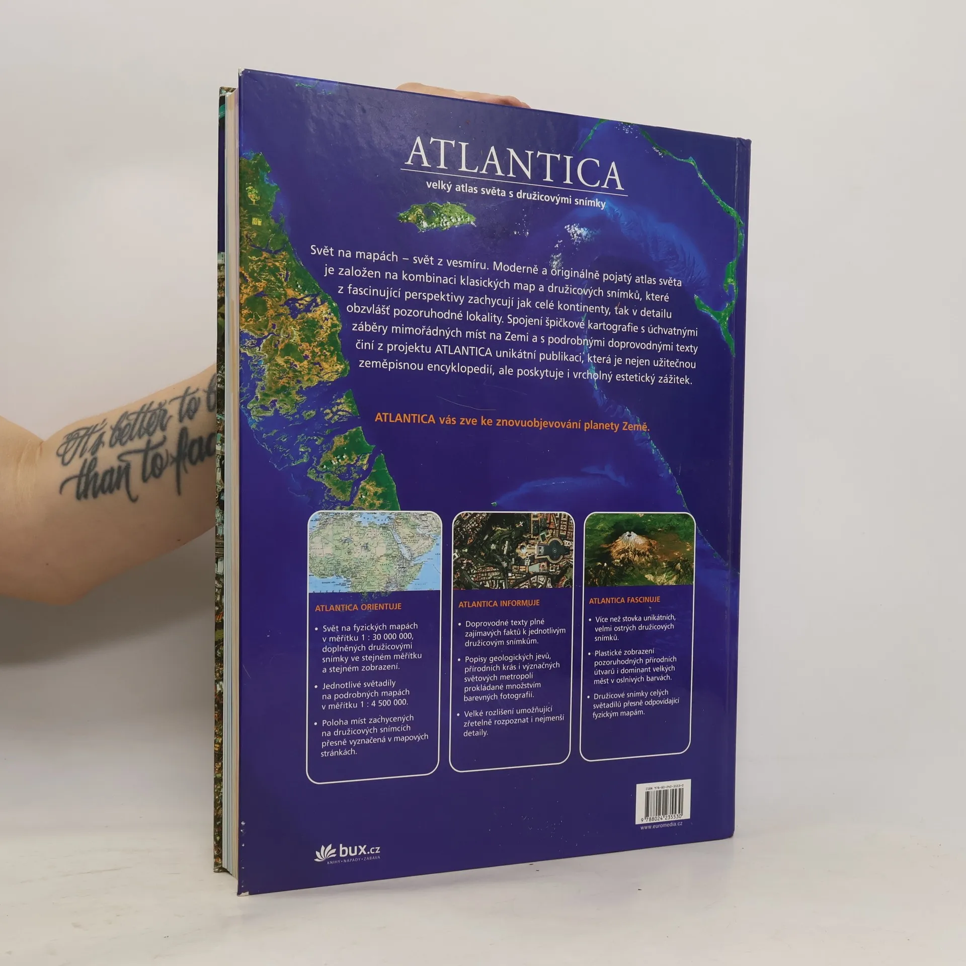 ATLANTICA vás zve ke znovuobjevování planety Země. Moderně a originálně pojatý atlas světa je založen na kombinaci klasických map a družicových snímků, které zachycují z fascinující perspektivy jak celé kontinenty, tak v detailu obzvlášť pozoruhodné lokality. Spojení špičkové kartografie s úchvatnými záběry mimořádných míst na Zemi a s podrobnými doprovodnými texty činí z projektu ATLANTICA unikátní publikaci, která je nejen vynikající zeměpisnou příručku, ale zároveň poskytuje i vrcholný estetický zážitek.