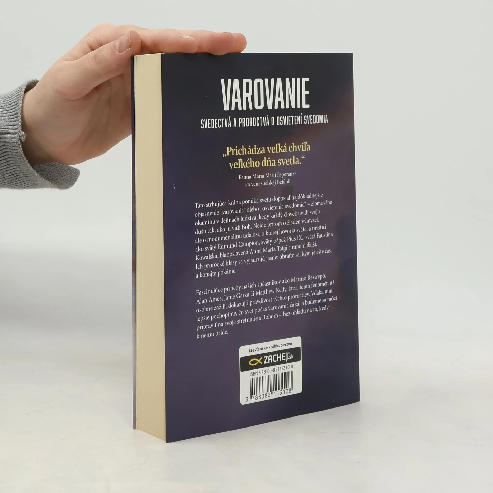 Táto strhujúca kniha ponúka svetu doposial' najdôkladnejšie objasnenie "varovania" alebo "osvetenia svedomia" - zlomového okamihu v dejinách ľudstva, kedy každý človek uvidí svoju dušu tak, ako ju vidí Boh. Nejde pritom o žiaden výmysel, ale o monumentálnu udalosť, o ktorej hovoria svätci a mystici ako svätý Edmund Campion, svätý pápež Pius IX., svätá Faustína Kowalská, blahoslavená Anna Maria Taigi a mnohí ďalší. Ich prorocké hlasy sa vyjadrujú jasne: obráťte sa, kým je ešte čas, a konajte pokánie. Fascinujúce príbehy našich súčasníkov ako Marino Restrepo, Alan Ames, Janie Garza či Matthew Kelly, ktorí tento fenomén už osobne zažili, dokazujú pravdivosť týchto proroctiev. Vďaka nim lepšie pochopíme, čo svet počas varovania čaká, a budeme sa môcť pripraviť na svoje stretnutie s Bohom - bez ohľadu na to, kedy k nemu dôjde.