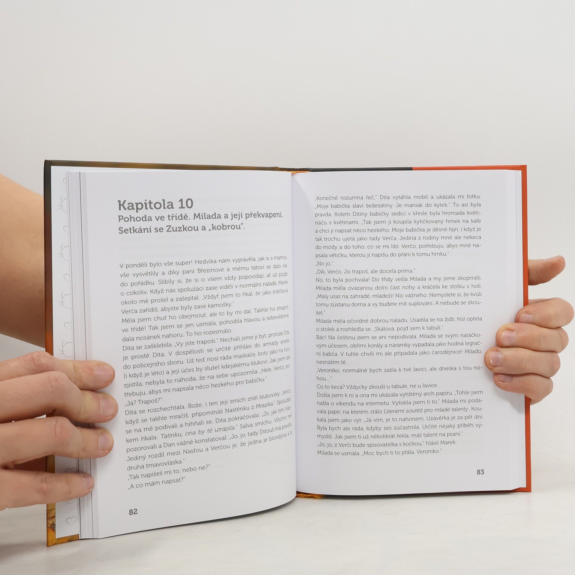 Mezi srdíčky, kočkami a růžovou. Kamarádky jsou pro Veroniku super důležitá věc. No a taky kočky, oblečení, ve kterém vám to sekne, srdíčka, růžové cokoli, prima rodina, a když vás kluci a ostatní ve třídě berou. Uhájit si svůj pohodový svět je ale někdy strašná dřina. Veronika musí vypátrat příčinu divného chování kamarádky Hedviky a z pořádné bryndy musí vytáhnout i Dana, kterému to sice strašně sluší (promiň Marku), ale občas by potřeboval vytahat za uši.
