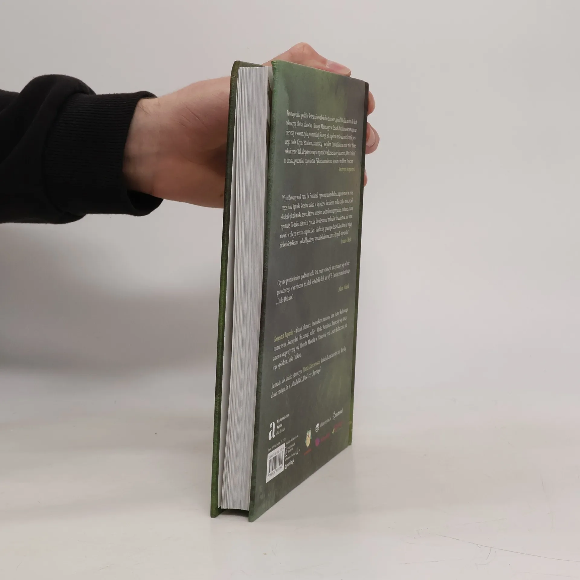 Pewnego dnia spokój w lesie zrujnowało jedno donośne „apsik”! W ślad za nim do akcji wkroczyły plotka, kłamstwo i intryga. Mieszkające w Lesie Kabackim zwierzęta po raz pierwszy w swoim życiu posmutniały. Zaczęły też, zupełnie nieświadomie, karmić pewnego trolla. Czym? Strachem, zazdrością i wstydem. Czy ta historia może mieć dobre zakończenie? Tak, ale potrzebna jest mądrość, wielkie serce i wybaczenie. „Dzik Dzikus” to urocza, pouczająca opowiastka. Pięknie namalowana słowem i pędzlem. Polecam.Katarzyna StoparczykWypróbowany myk pana La Fontaine’a z przebieraniem ludzkich problemów w zwierzęce futra i piórka świetnie działa w tej bajce o karmieniu trolla, czyli o niszczycielskiej sile plotki i fake newsa, które z impetem lawiny burzą przyjaźnie, zaufanie, cudzą reputację. To także historia o tym, że kto nie zaznał miłości w dzieciństwie, nie umie mówić w obcym języku empatii. No i niedzielny spacer po Lesie Kabackim już nigdy nie będzie taki sam – odtąd będziemy szukali śladów raciczek i bosych stóp trolla!Joanna OlechCzy nie pomówieniem godnym trolla jest znany wierszyk zaczynający się od nieprawdziwego stwierdzenia, że „dzik jest dziki, dzik jest zły”? Czytajcie znakomitego „Dzika Dzikusa”!Adam Wajrak