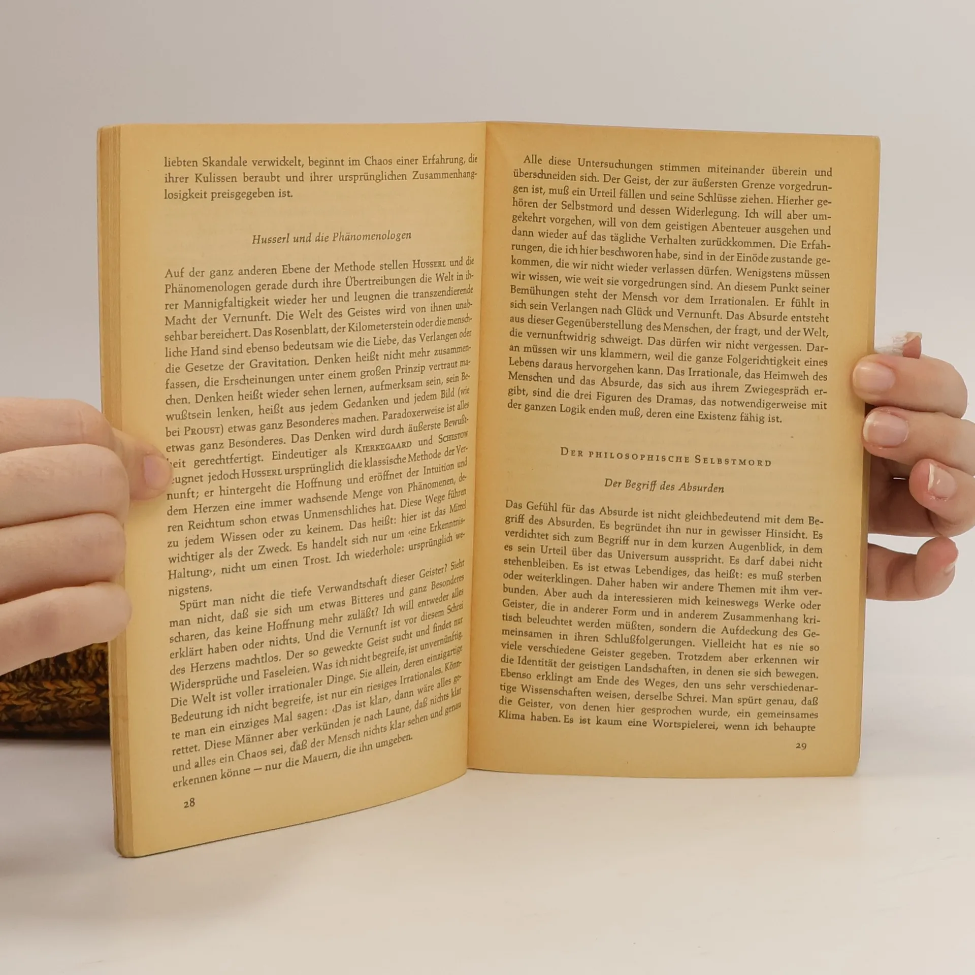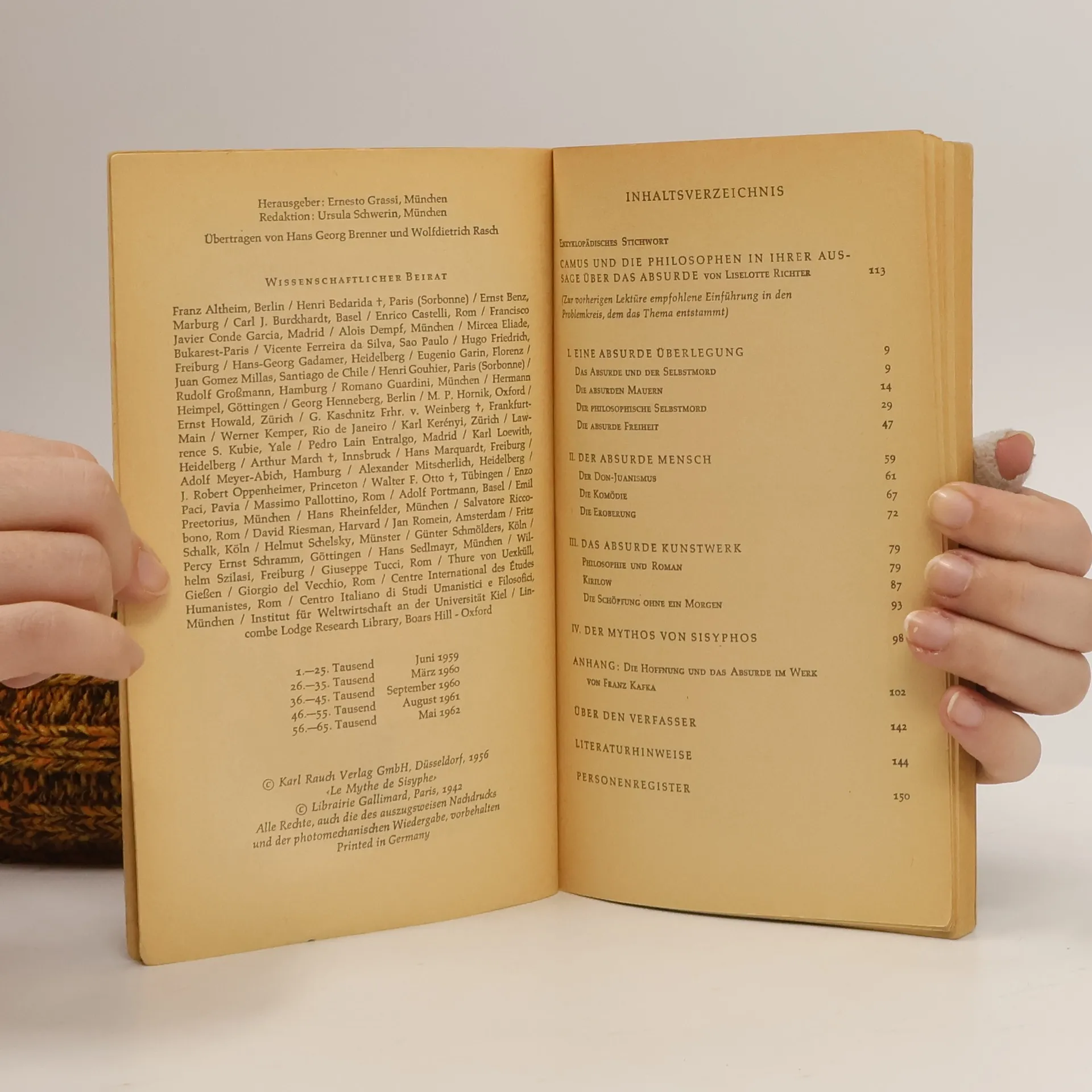 «Der Mythos von Sisyphos» kreist um die zentrale Frage, die Grundfrage auch aller Philosophie, «ob das Leben die Mühe, gelebt zu werden, lohnt oder nicht». Sisyphos steht für den Menschen, der sich seiner wahren Stellung in der Welt und das heißt: seiner absurden Situation bewußt ist. Das «Absurde» bezeichnet die Diskrepanz zwischen dem Menschen und seiner Sehnsucht nach Sinn und Verstehen und dem Schweigen der Welt, ihrer Undurchdringlichkeit und Gleichgültigkeit. Mit dieser Erfahrung stellt Camus die Forderung an den Menschen, dieses Leben und diese Situation ohne Illusionen auszuhalten, aller Transzendenz und allen Trostes zu entraten und eine sich ganz im Diesseits ihren «Sinn» gebende Existenz auf sich zu nehmen, deren «Reich ganz von dieser Welt ist». Allein diese geistige Haltung so Camus verleiht dem Menschen in seiner absurden Situation Würde und Wert: «Wir müssen uns Sisyphos als einen glücklichen Menschen vorstellen.» «Der Mythos von Sisyphos» entstand einige Monate nach dem «Fremden». Camus kommentiert hier philosophisch, was er dort künstlerisch zu fassen versuchte, und vollzieht in diesem frühen Essay den ersten Schritt von der Erfahrung der Absurdität zur mitmenschlichen Revolte, die in seinen folgenden Werken im Mittelpunkt seines Denkens und Gestaltens steht.