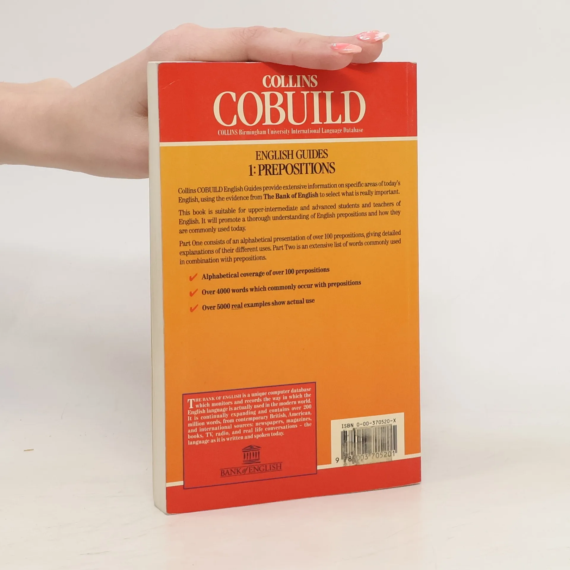 Derived from the COBUILD database, each book in this series provides clear and detailed explanations, supported by numerous English examples, on specific areas of English. Integrated language activity work reinforces the reference material, checking understanding and exploiting important vocabulary and usage. They are in a pocket format, and include an answer key. The first two titles are "Prepositions" and "Word Formations".