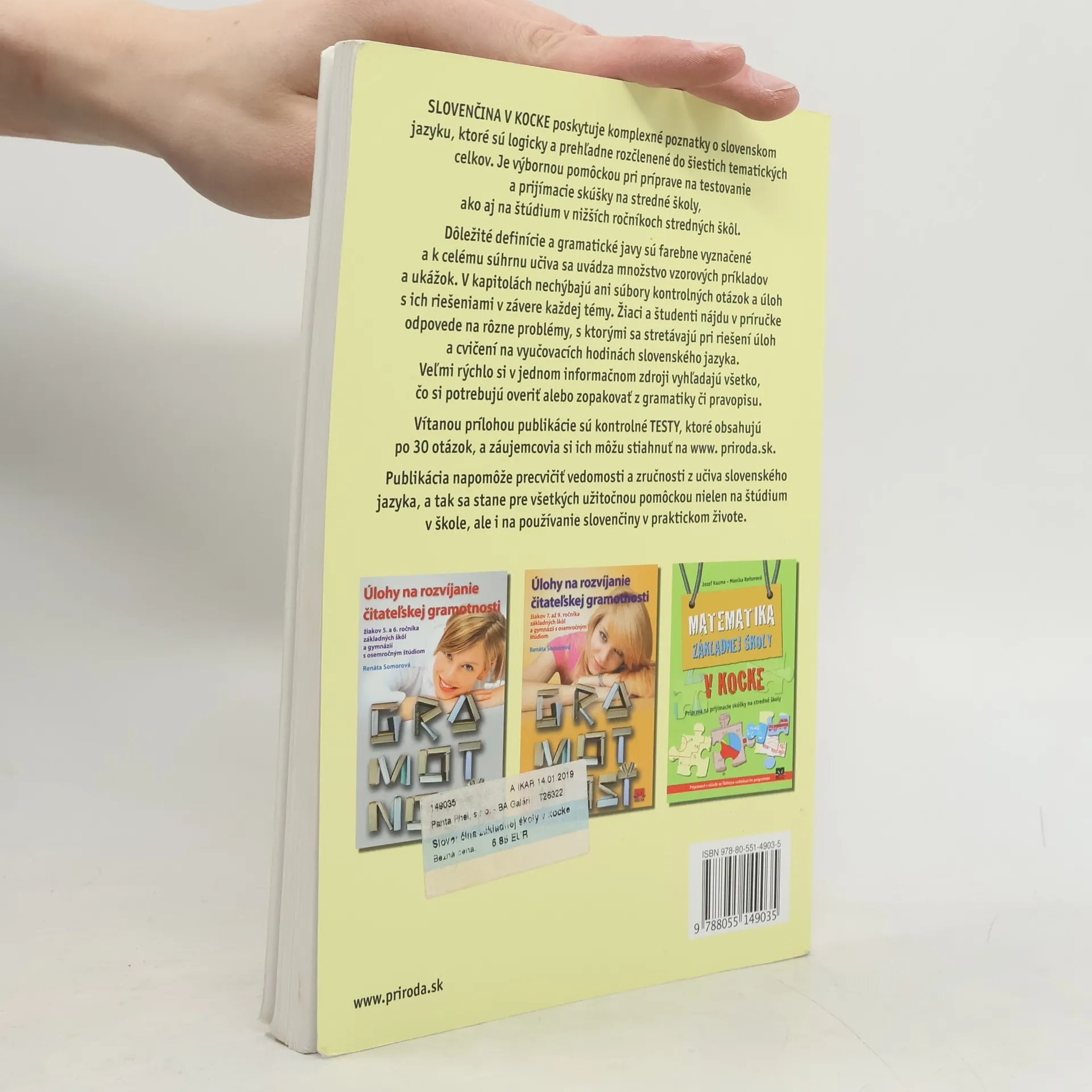 Publikácia predstavuje ucelený prehľad učiva zo slovenského jazyka v rámci základnej školy a nižších ročníkov gymnázií aj stredných škôl. Dôležité definície a gramatické javy sú farebne vyznačené a k učivu sa uvádzajú vzorové príklady a ukážky. Kapitoly obsahujú aj kontrolné otázky, úlohy a ich riešenia v závere každej témy. Praktickou prílohou sú Testy s otázkami, ktoré si žiaci a učitelia môžu stiahnuť na www.priroda.sk.