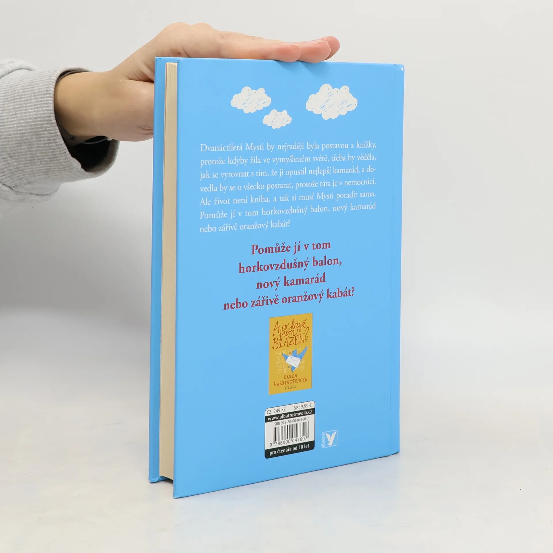 Najde Mysti odvahu změnit svůj život? Dvanáctiletá Mysti by nejraději byla postavou z knížky, protože kdyby žila ve vymyšleném světě, třeba by věděla, jak se vyrovnat s tím, že ji opustil nejlepší kamarád, a dovedla by se o všecko postarat, protože táta je v nemocnici. Ale život není kniha, a tak si musí Mysti poradit sama. Pomůže jí v tom horkovzdušný balon, nový kamarád nebo zářivě oranžový kabát?