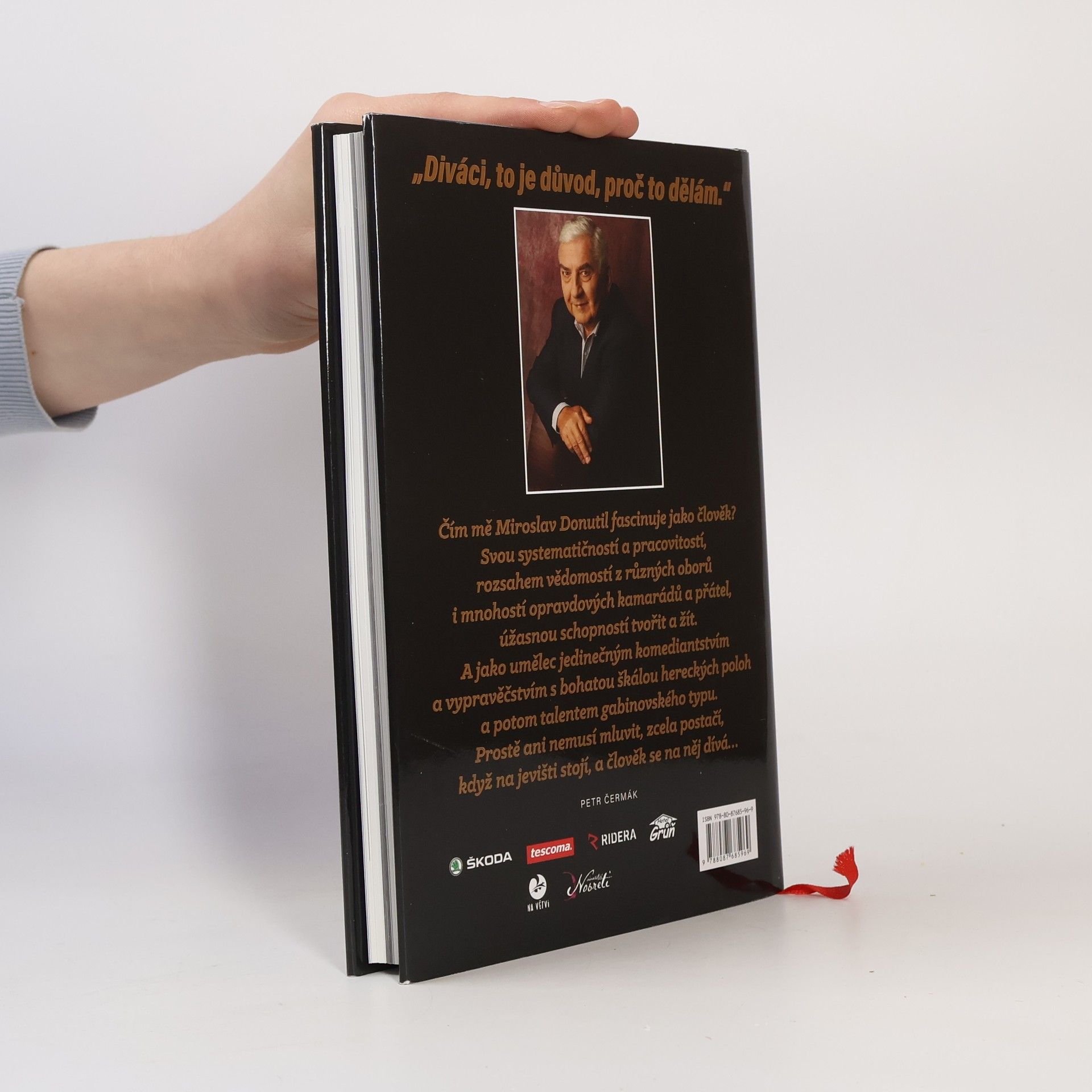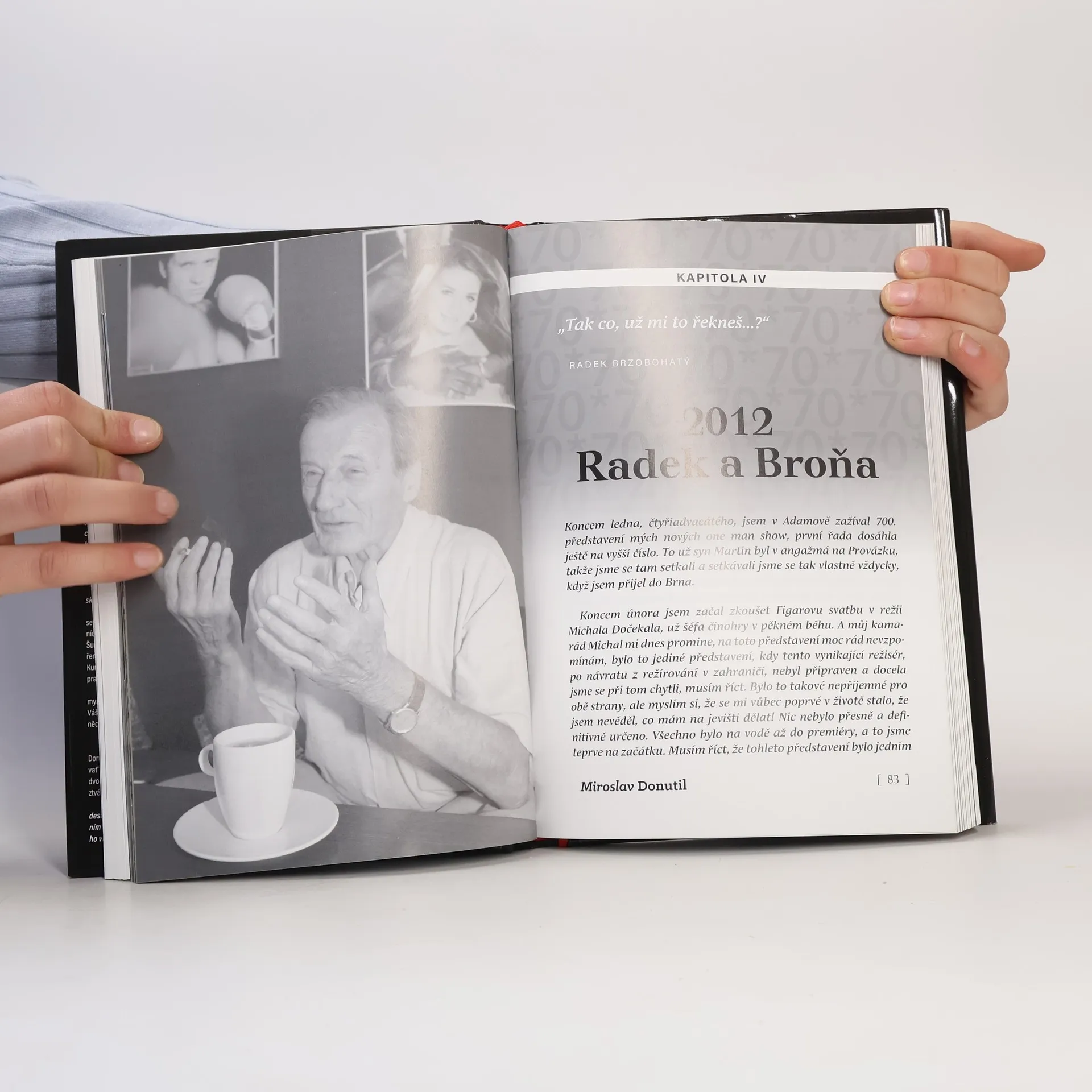 Autorizovaná kniha. Mnozí tvrdí, že dnešní doba postrádá herecké osobnosti, jaké jsme měli dříve. Přesto existuje jeden, o kterém jsem přesvědčen – Miroslav Donutil. Na jevišti exceluje nejen jako herec, ale také jako zpěvák a tanečník, dokáže diváky rozesmát i rozesmutnit. Jeho výkon si diváci užívají a kochají se jím. Donutil, rodák z Třebíče, navazuje na tradici komediálních talentů jako byli Vlasta Burian nebo Jan Werich. Miroslav říká: „Nejlepší, co může herec zažít, je vyprávět přímo divákům.“ I když někteří kritizovali jeho cestování s pořadem, on to považuje za krásné. Jiří Suchý, nestor Semaforu, ho označuje za skvělého vypravěče a výjimečného herce. Donutil, dříve bohémsky vyhlížející, se ukazuje jako systematický umělec, který pracuje s velkou odpovědností. Osobnosti jako Karel Gott či Milan Lasica mají na něj pozitivní názory. Emília Vášáryová ho přirovnává k Jeanovi Gabinovi. Donutilova herecká paleta je mnohobarevná, jeho nejslavnější rolí je Truffaldino v „Sluhovi dvou pánů“, kterou ztvárnil v Národním divadle v rekordních 600 vyprodaných představeních. Kniha, vydaná k jeho sedmdesátinám, zachycuje poslední desetiletí jeho kariéry a pohled 70 osobností na jeho umění.