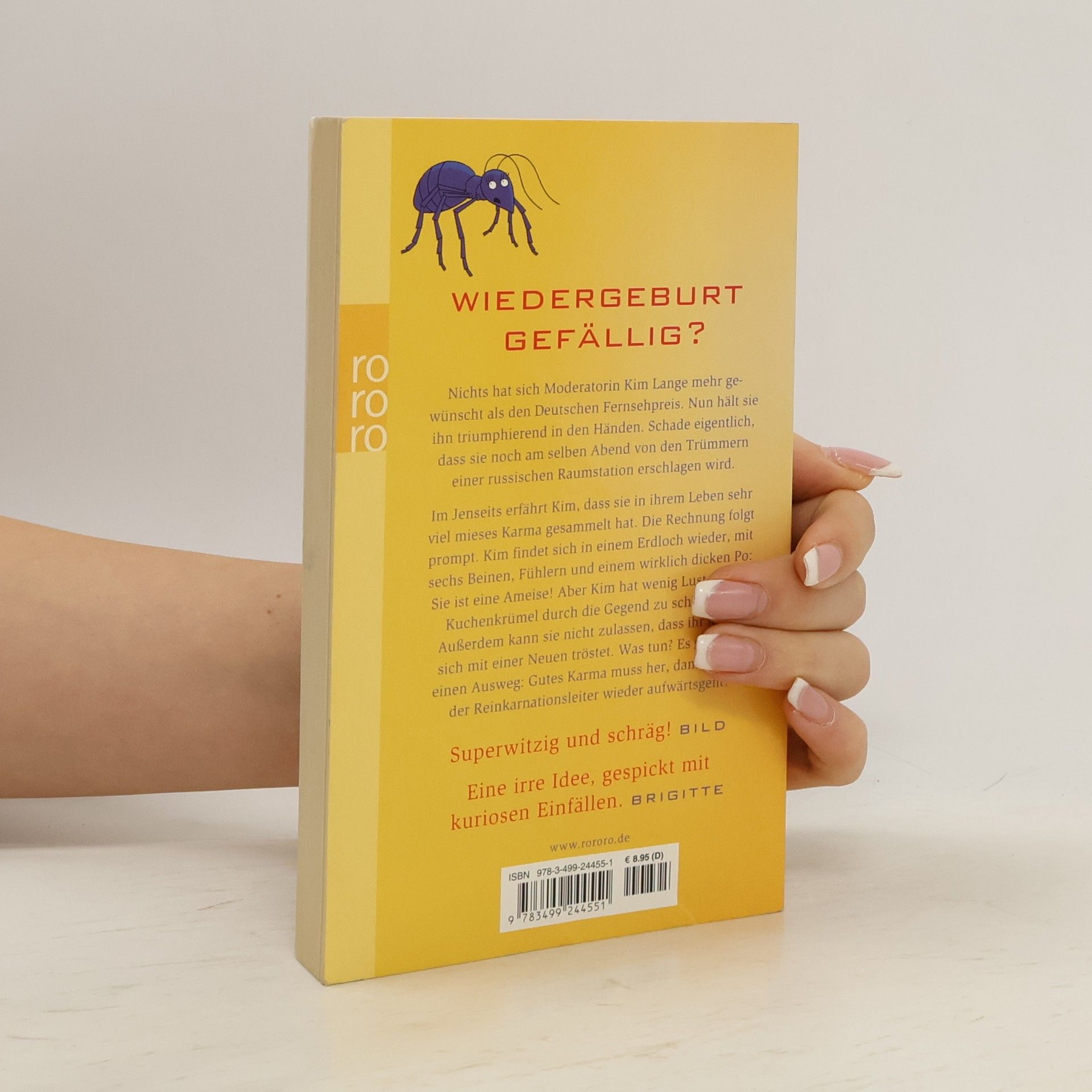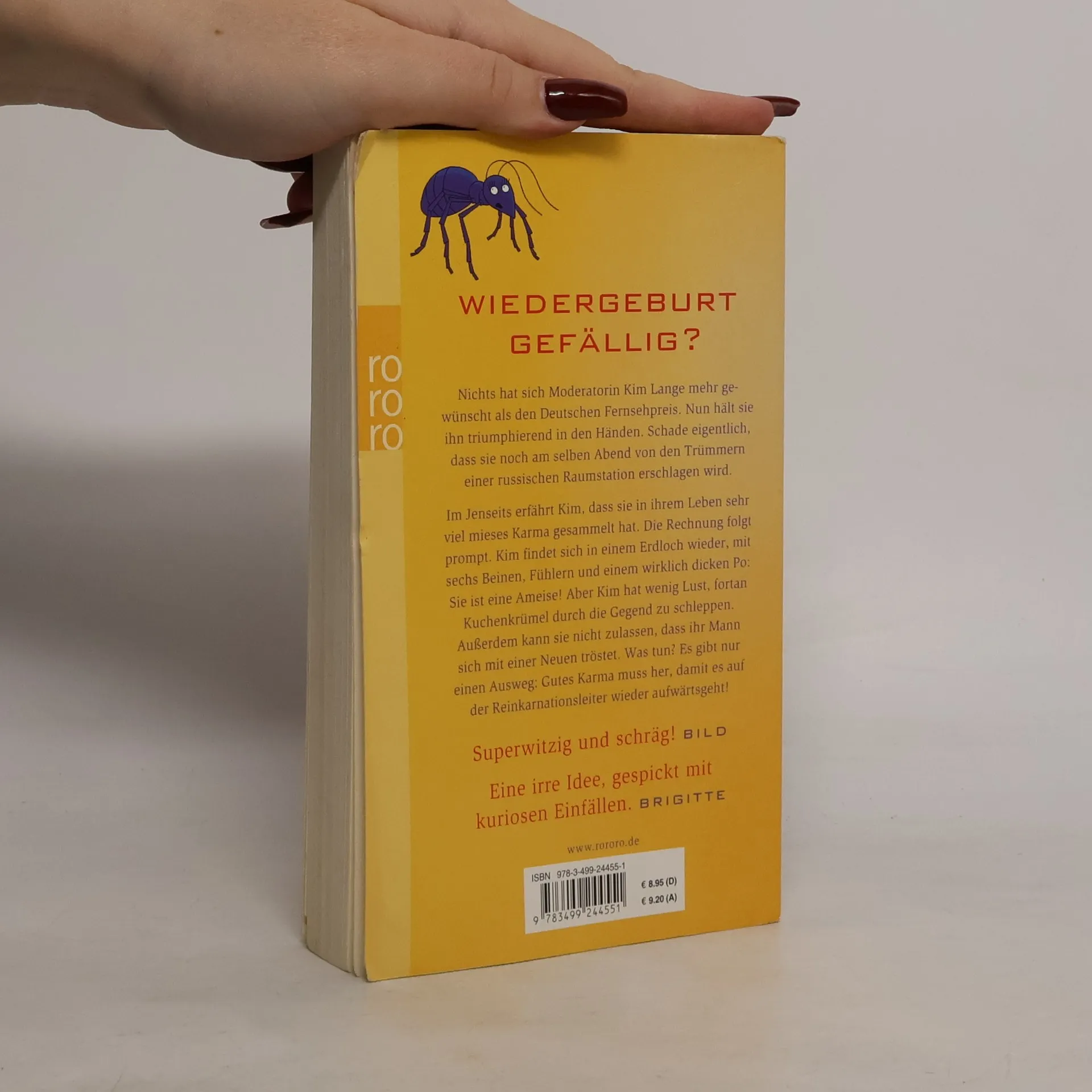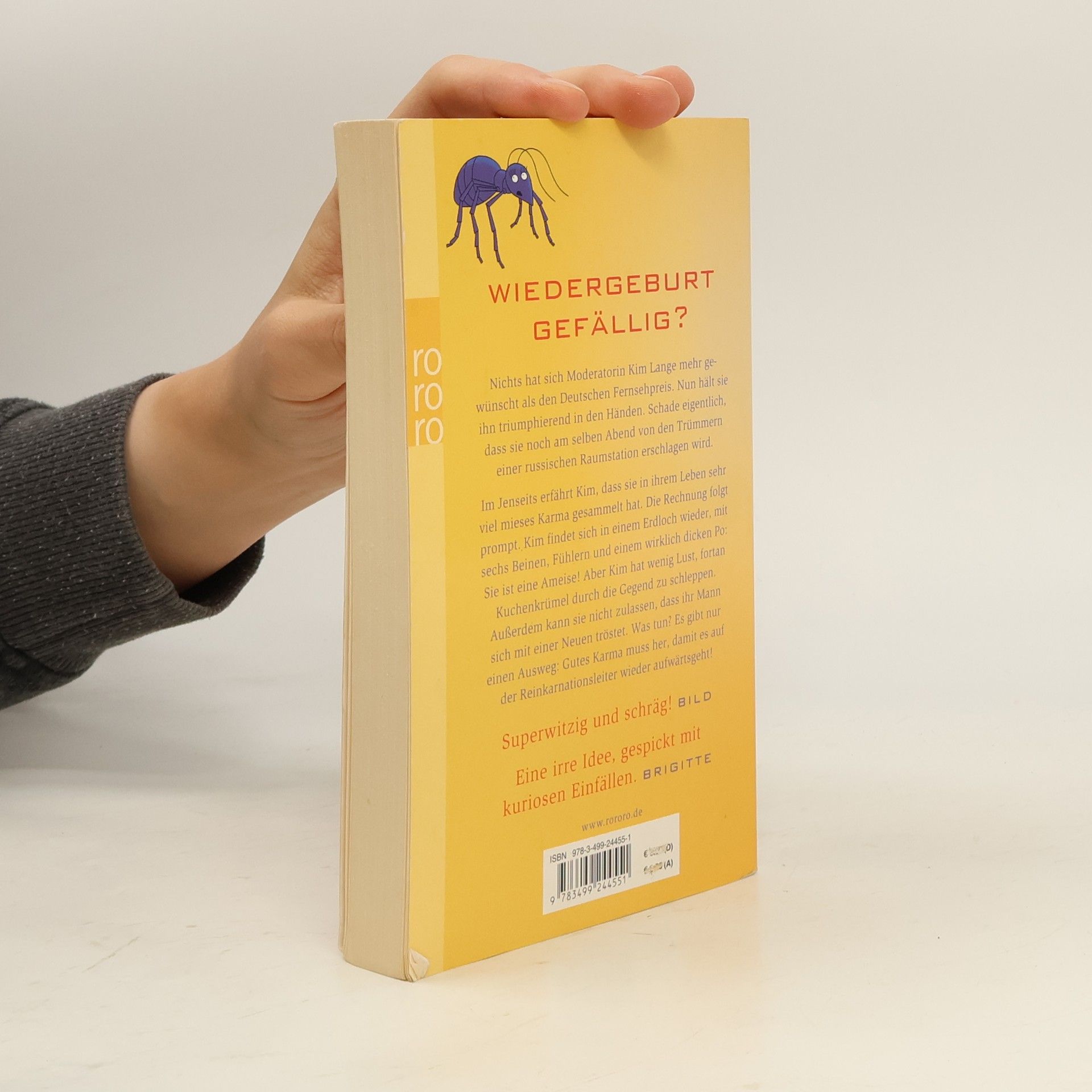 Wiedergeburt gefällig? Nichts hat sich Moderatorin Kim Lange mehr gewünscht als den deutschen Fernsehpreis. Nun hält sie ihn triumphierend in den Händen. Schade eigentlich, dass sie noch am selben Abend von den Trümmern einer russischen Raumstation erschlagen wird.Im Jenseits erfährt Kim, dass sie in ihrem Leben sehr viel mieses Karma gesammelt hat. Die Rechnung folgt prompt. Kim findet sich in einem Erdloch wieder, mit sechs Beinen, Fühlern und einem wirklich dicken Po: Sie ist eine Ameise! Aber Kim hat wenig Lust, fortan Kuchenkrümel durch die Gegend zu schleppen. Außerdem kann sie nicht zulassen, dass ihr Mann sich mit einer Neuen tröstet. Was tun? Es gibt nur einen Ausweg: Gutes Karma muss her, damit es auf der Reinkarnationsleiter wieder aufwärts geht! «Superwitzig und schräg!» (Bild) «Eine irre Idee, gespickt mit kuriosen Einfällen.» (Brigitte)