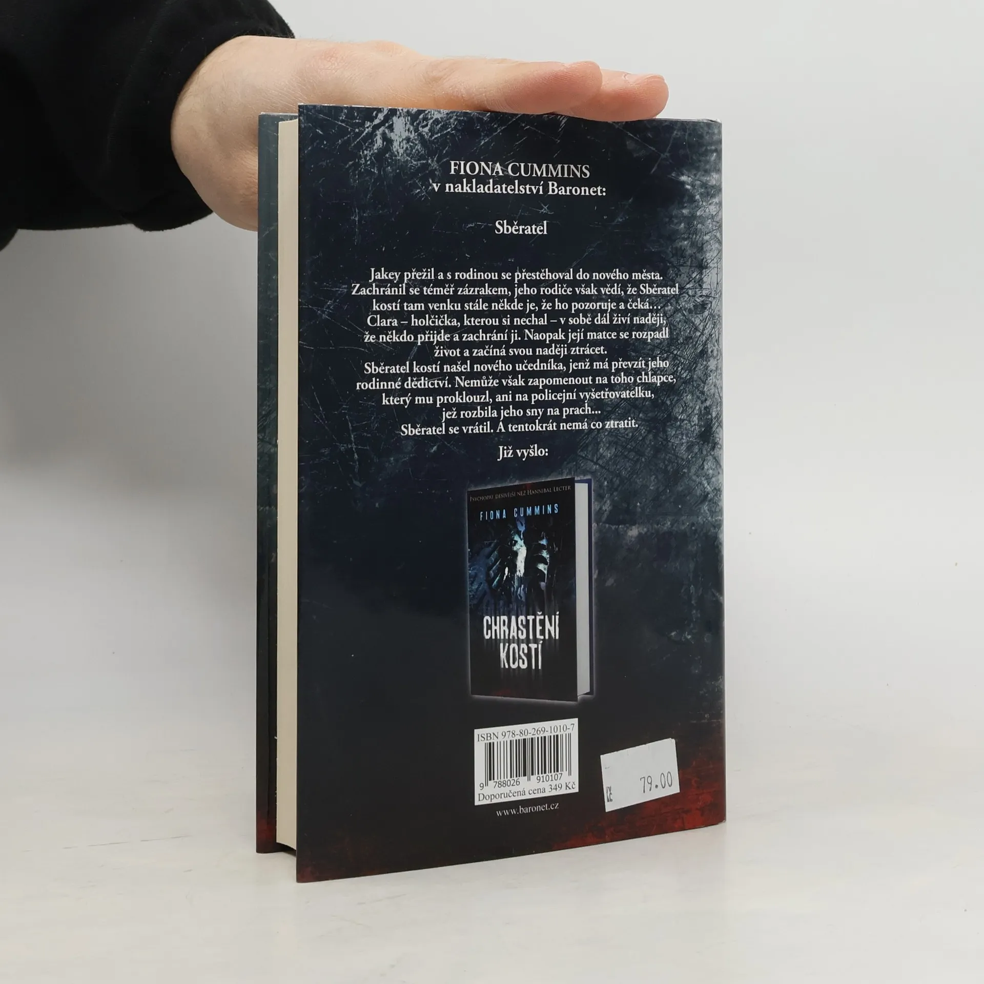 Sběratel Fiony Cummins je napínavým pokračováním knihy Chrastění kostí. Jakey přežil a přestěhoval se do nového města. Zachránil se téměř zázrakem, jeho rodiče však vědí, že Sběratel kostí tam venku stále někde je, že ho pozoruje a čeká… Clara - holčička, kterou si nechal – v sobě dál živí naději, že někdo přijde a zachrání ji. Naopak její matce se rozpadl život a začíná svou naději ztrácet. Sběratel kostí našel nového učedníka, jenž má převzít jeho rodinné dědictví. Nemůže však zapomenout na toho chlapce, který mu proklouzl, ani na policejní vyšetřovatelku, rozbila jeho sny na prach. Když Sběratel unikl, seržantce Ettě Fitzroyové se všechno zhroutilo. Clara je stále nezvěstná, navíc se rozjíždí nová vlna podobně záhadných vražd. Dokáže toho muže z temnot najít znovu? Sběratel se vrátil. A tentokrát nemá co ztratit.