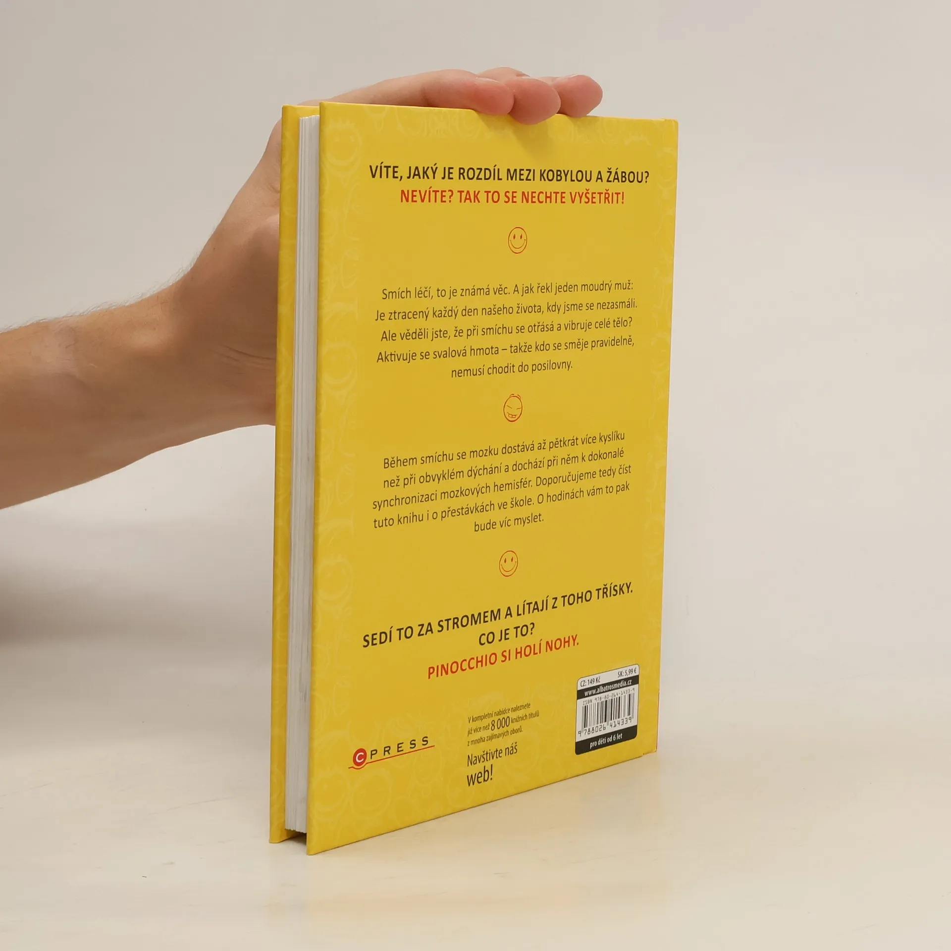 Víte, jaký je rozdíl mezi kobylou a žábou? Nevíte? Tak to se nechte vyšetřit! Smích léčí, to je známá věc. A jak řekl jeden moudrý muž: Je ztracený každý den našeho života, kdy jsme se nezasmáli. Ale věděli jste, že při smíchu se otřásá a vibruje celé tělo? Aktivuje se svalová hmota – takže kdo se směje pravidelně, nemusí chodit do posilovny. Během smíchu se mozku dostává až 5 x více kyslíku než při obvyklém dýchání a dochází při něm k dokonalé synchronizaci mozkových hemisfér. Doporučujeme tedy číst tuto knihu i o přestávkách ve škole. O hodinách vám to pak bude víc myslet.