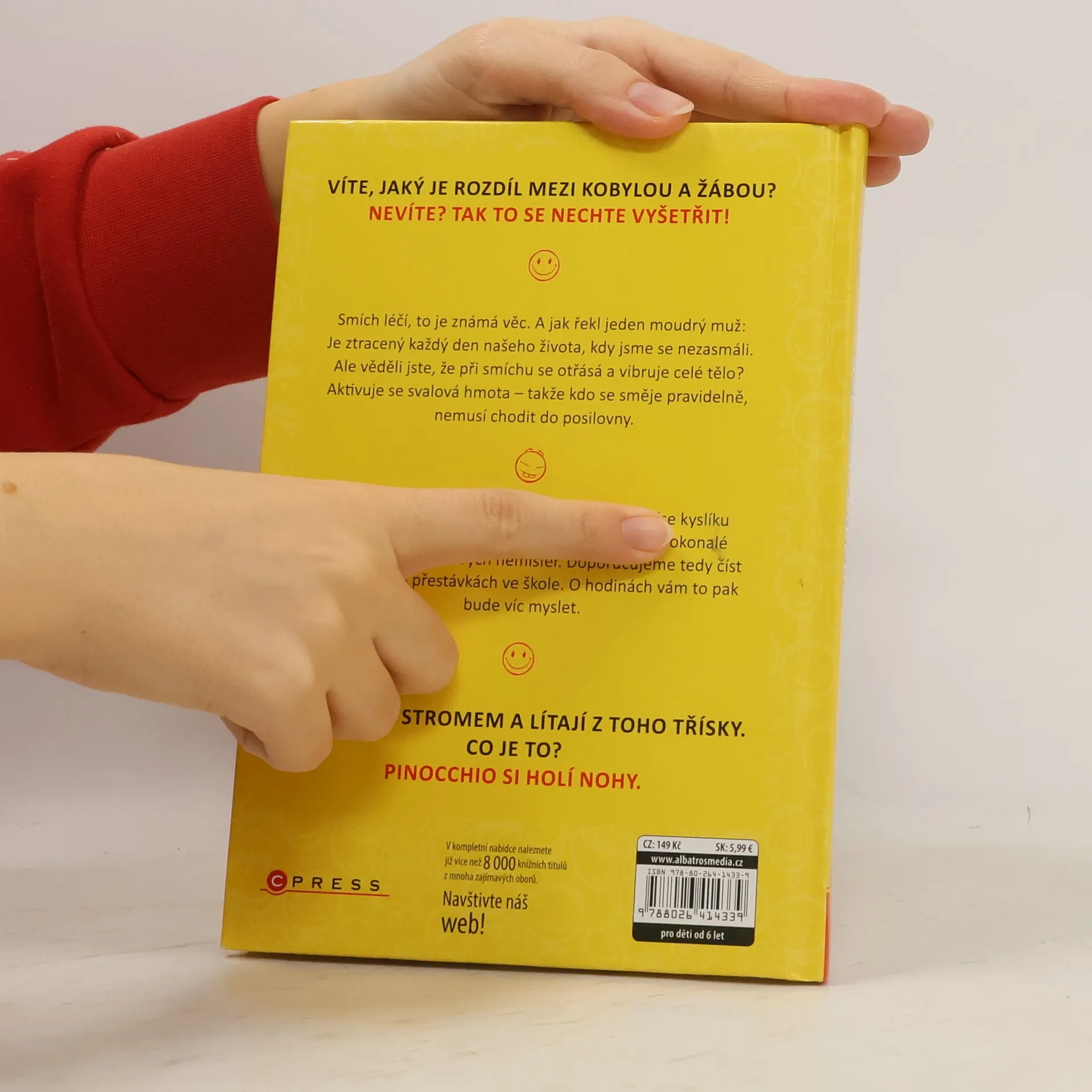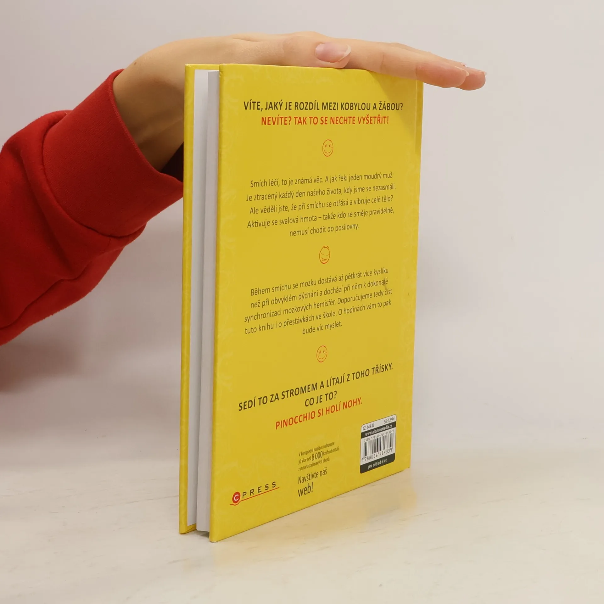Víte, jaký je rozdíl mezi kobylou a žábou? Nevíte? Tak to se nechte vyšetřit! Smích léčí, to je známá věc. A jak řekl jeden moudrý muž: Je ztracený každý den našeho života, kdy jsme se nezasmáli. Ale věděli jste, že při smíchu se otřásá a vibruje celé tělo? Aktivuje se svalová hmota – takže kdo se směje pravidelně, nemusí chodit do posilovny. Během smíchu se mozku dostává až 5 x více kyslíku než při obvyklém dýchání a dochází při něm k dokonalé synchronizaci mozkových hemisfér. Doporučujeme tedy číst tuto knihu i o přestávkách ve škole. O hodinách vám to pak bude víc myslet.