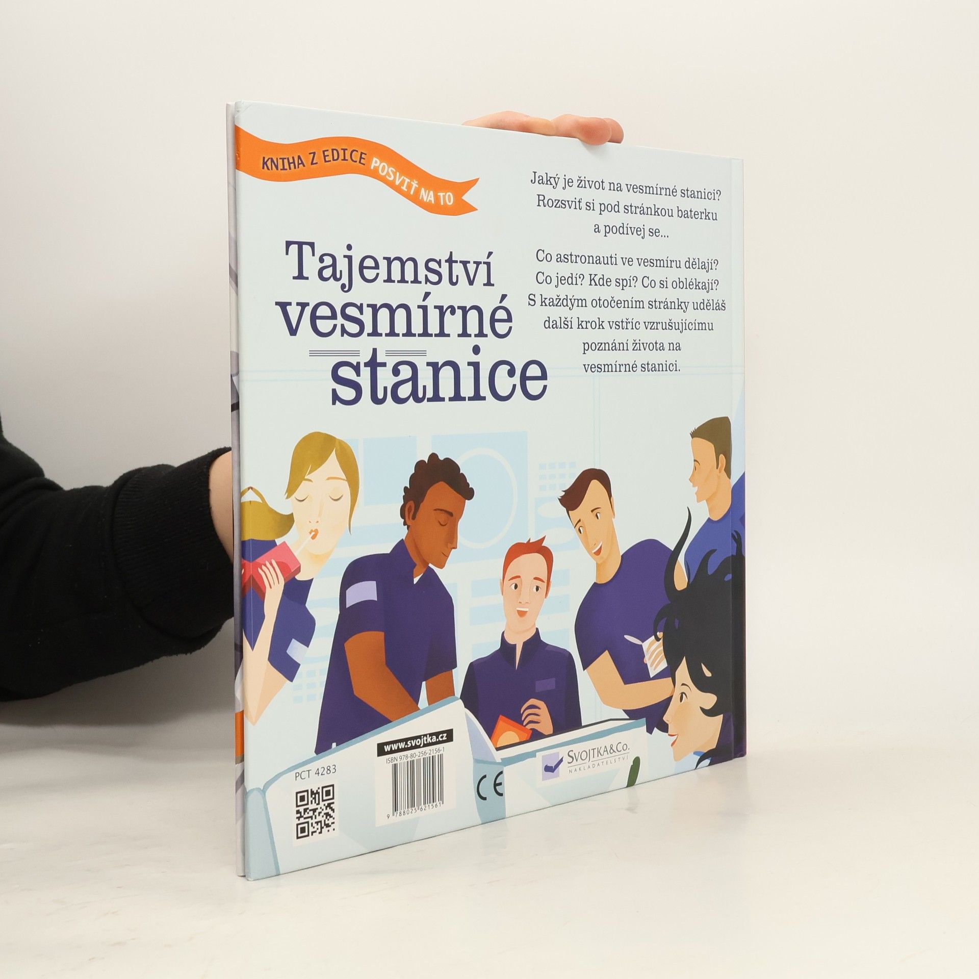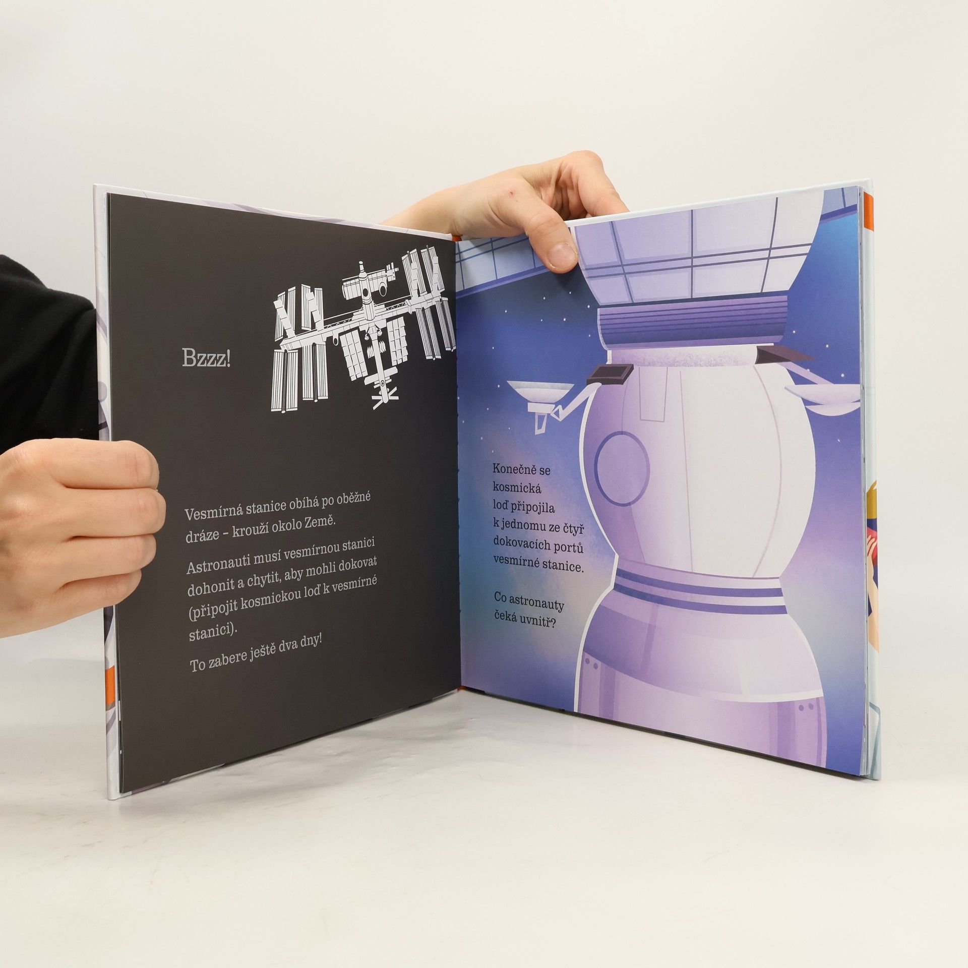 Jaký je život na vesmírné stanici? Rozsviť si pod stránkou baterku a podívej se… Co astronauti ve vesmíru dělají? Co jedí? Kde spí? Co si oblékají? S každým otočením stránky uděláš další krok vstříc vzrušujícímu poznání života na vesmírné stanici. Vesmírná stanice létá nad Zemí – vydej se na výlet raketou daleko od naší planety a navštiv astronauty, kteří žijí a pracují na vesmírné stanici. Rozsviť si pod stránkou baterku nebo stránku přidrž proti světlu a odhal, co je ukryto uvnitř vesmírné stanice a okolo ní. Deset, devět, osm, sedm... Tvá raketa za chvíli startuje. Nasaď si helmu, připrav si svítilnu a vydej se mezi opravdové astronauty objevovat vesmír plný velkých překvapení. Ideální čtení pod peřinu!