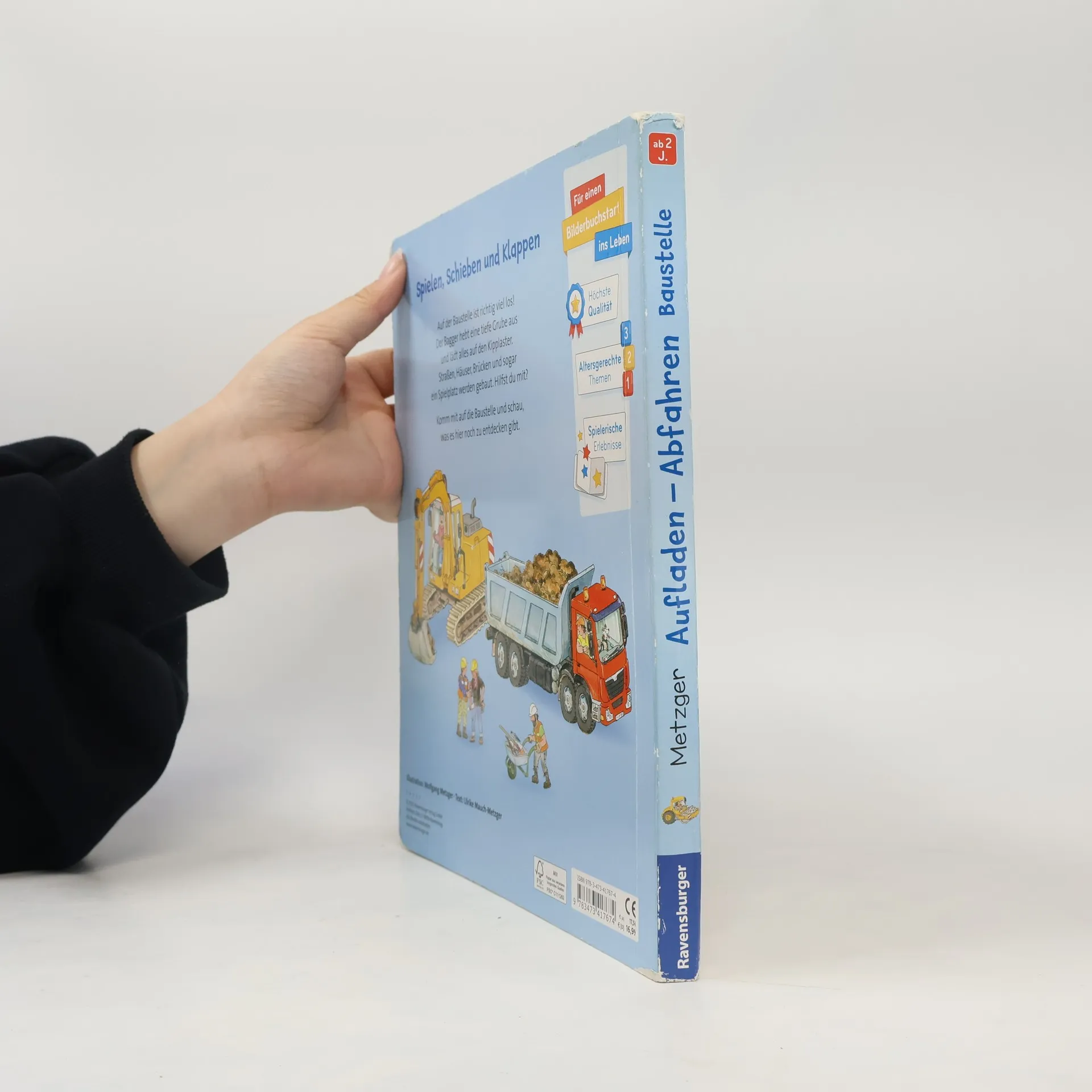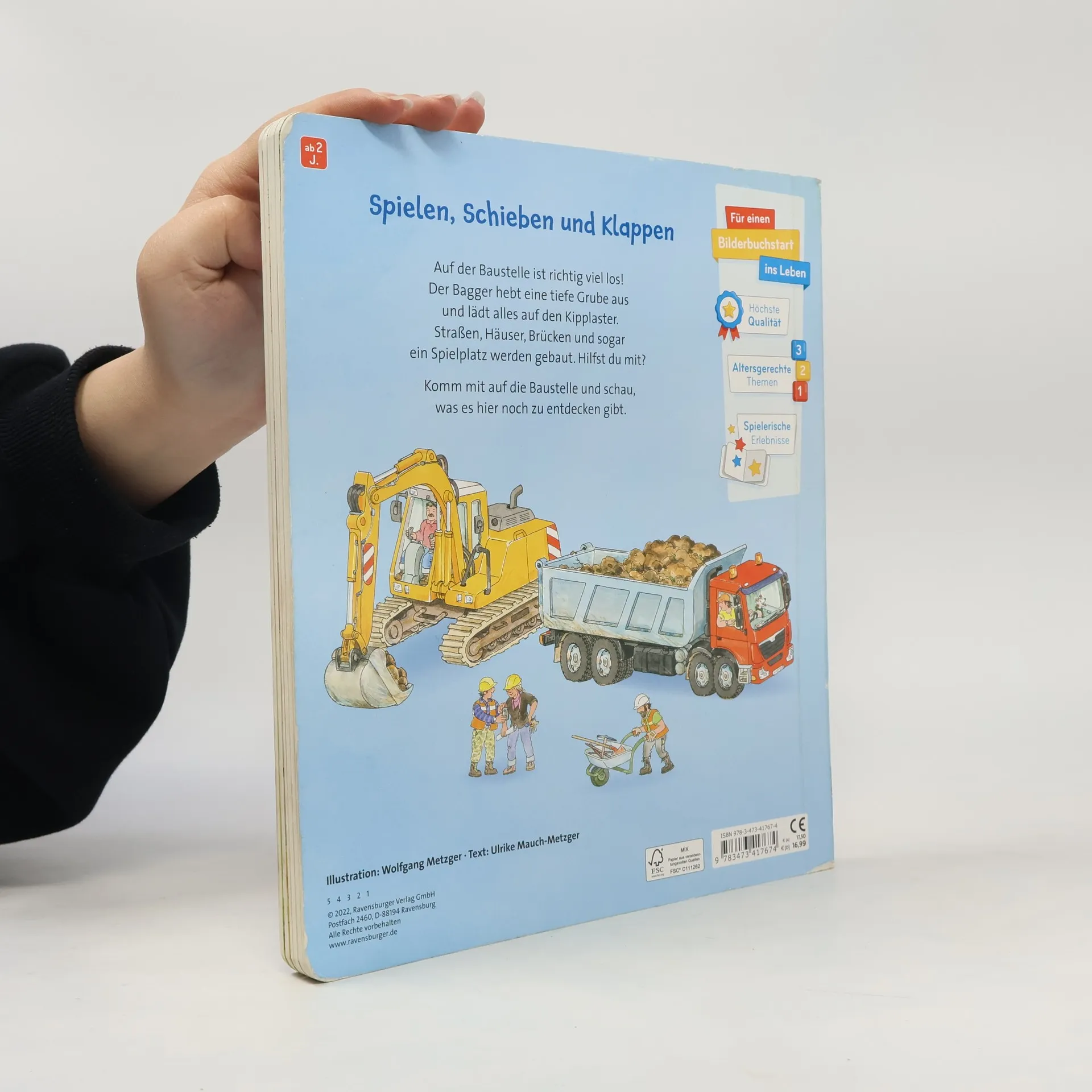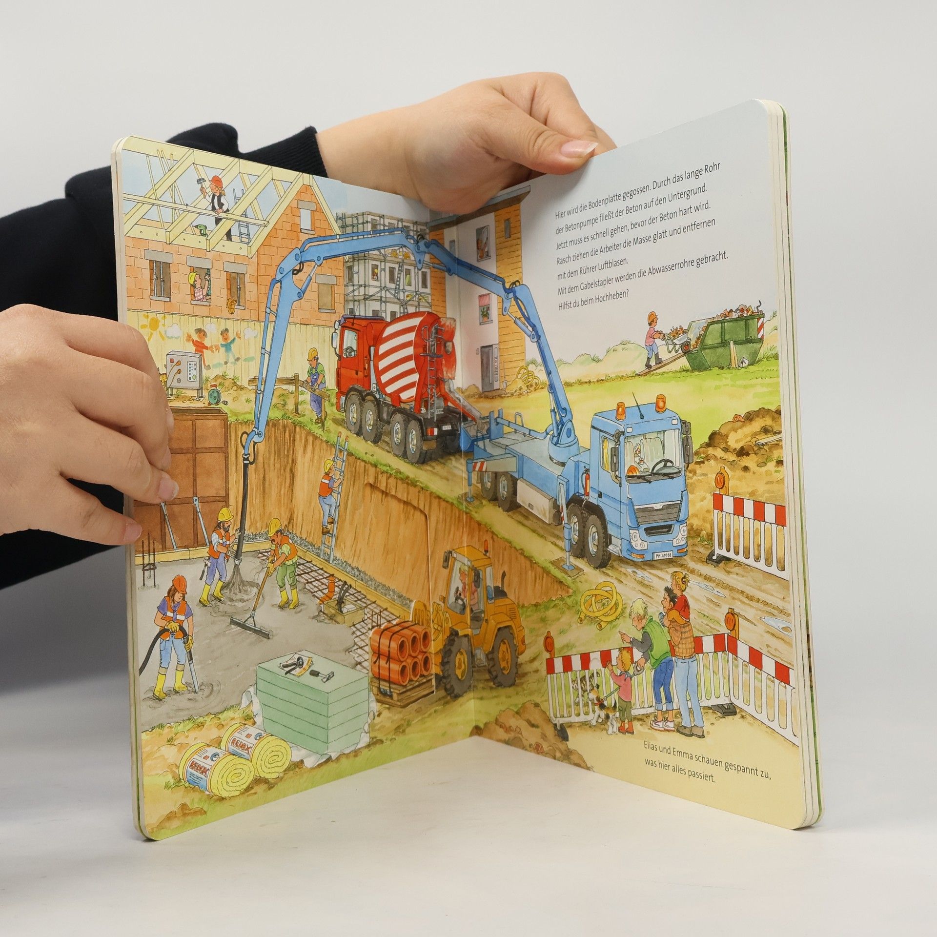 Großes Spielbuch für kleine Baustellen-Fans ab 2 Jahren Auf der Baustelle ist ganz schön was los: Der Bagger lädt Erde auf den Kipplaster, der Betonmischer bringt den Beton und die Straßenwalze presst den Schotter zusammen. Dieses Spielbuch im großen Format bietet 5 abwechslungsreiche Baustellen-Szenen zum Mitmachen. Dank spannender Schieber und Klappen erwecken hier schon Kinder ab 2 Jahren ihre liebsten Fahrzeuge zum Leben. Schöne Vorlesetexte erzählen kleine Geschichten und vermitteln nebenbei allererstes Sachwissen. In diesem Spielbuch sind auf fünf großen Seiten viele spannende Baustellen-Fahrzeuge abgebildet. Tolle Schiebeeffekte und zahlreiche Klappen machen dieses Buch besonders: Schon kleine Kinderhände bewegen die leichtgängigen Schieber hin und her oder öffnen die versteckten Klappen im Bild. Dann lädt der Bagger die Erde auf den Kipplaster und der Aufzug transportiert die Ziegel aufs Dach. Kindgerechte Texte vermitteln zu jeder Szene spannende Sachinfos. Ein großer Mitmachspaß für Fahrzeug-Fans ab 2 Jahren. Abwechslungsreiche Baustellen werden gezeigt: Eine Baugrube wird ausgehoben, das Fundament wird gegossen, Häuser werden gebaut und ein Spielplatz fertig gestellt. Kannst du mit dem Kran die Stahlträger transportieren? Bringst du die Mauersteine? Auf dem Spielplatz kannst du den Sandkasten befüllen und ein Bäumchen pflanzen. All das kann nur mit deiner Hilfe fertig werden!