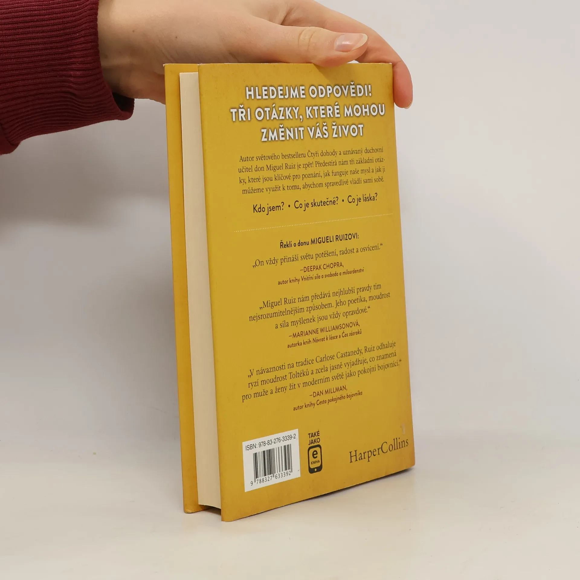 Hledejme odpovědi. Tři otázky, které mohou změnit váš život. • Kdo jsem? • Co je skutečné? • Co je láska? Autor světového bestselleru Čtyři dohody a uznávaný duchovní učitel don Miguel Ruiz nám předkládá tři základní otázky, které jsou klíčové pro poznání, jak funguje naše mysl a jak ji můžeme využít k tomu, abychom spravedlivě vládli sami sobě. Prostřednictvím těchto jednoduchých, ale nanejvýš důležitých otázek Miguel Ruiz postupně odkrývá nejrůznější klamy a sebeklamy, jimiž jako jednotlivci i jako lidstvo podléháme a jež jsou permanentním ( a podle všeho zbytečným) zdrojem naší duševní a tělesné nepohody či dokonce až utrpění.