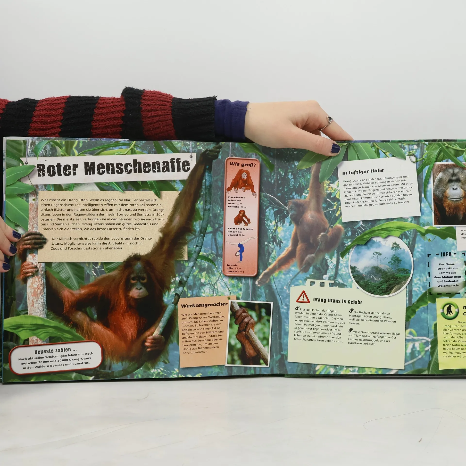 Viele Tausend Tierarten sind vom Aussterben bedroht, und in diesem opulent ausgestatteten Sachbuch werden 12 von ihnen porträtiert – ihre Lebensweise, Gefahren und menschliche Schutzmaßnahmen. Eine Welt ohne Tiger, Elefant und Co. ist unvorstellbar, doch die Bedrohung, dass viele Tiere bald nicht mehr existieren, ist alarmierend. Der Mensch trägt maßgeblich dazu bei, dass immer mehr Arten verschwinden. Doch welche Tiere sind betroffen, wo leben sie und warum stehen sie auf der roten Liste? Der Band „SOS - Tiere“ ist reich an Fotos, Informationen und faszinierenden Details. Das auffällige Cover mit einem Wackelbild zeigt je nach Lichteinfall den bedrohten Gorilla oder die Erde. Die übersichtliche Gestaltung ermöglicht es Kindern, sich schnell zurechtzufinden und ihren Interessen zu folgen. Info-Kästchen präsentieren überraschende Neuigkeiten, die auch Erwachsene erstaunen könnten, wie zum Beispiel das Gewicht eines Elefantenbackenzahns, das dem eines Ziegelsteins entspricht. Ein Quiz ermöglicht es, den eigenen Wissensstand zu überprüfen, während kleine Merkzettel Ideen für den persönlichen Beitrag zum Tierschutz festhalten. Energiesparen oder die Unterstützung einer Schutzorganisation sind nur zwei der vielen Möglichkeiten, wie jeder helfen kann.