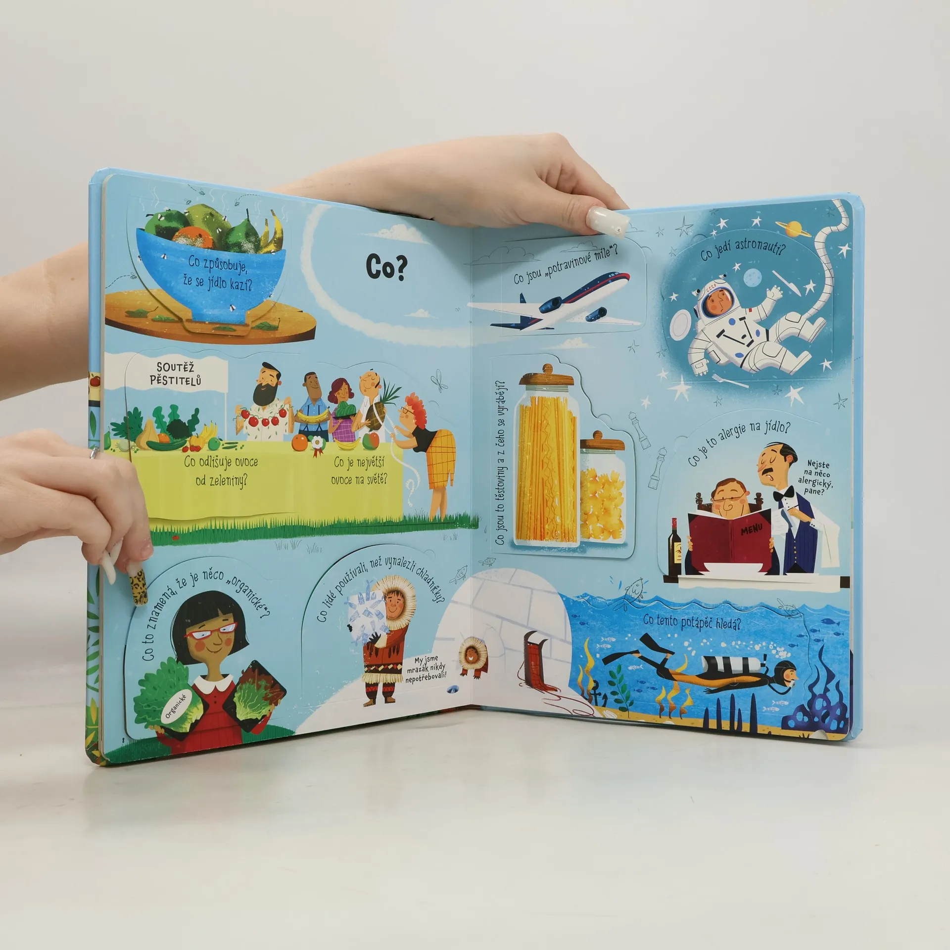 Jeho výroba nebo zpracování je zdrojem obživy pro mnoho lidí na světě. Několikrát denně s ním přijde do styku úplně každý. Co je to? Přece JÍDLO! Chcete se dozvědět něco víc o tom, odkud se berou potraviny, které jíme? Ne, jídlo opravdu nepochází ze supermarketu. Vydejte se s touto knížkou s odklápěcími okénky na cestu plnou poznání, na jejímž konci budete mj. vědět, jak se vyrábí čokoláda, proč některé sýry zavánějí, zda byly mrkve vždy oranžové, kdo je vegetarián a kdo alergik, odkud pochází quinoa… Svět potravin je fascinující a skrývá mnohá nečekaná tajemství. Je čas odklopit okénka a všechna je objevit!