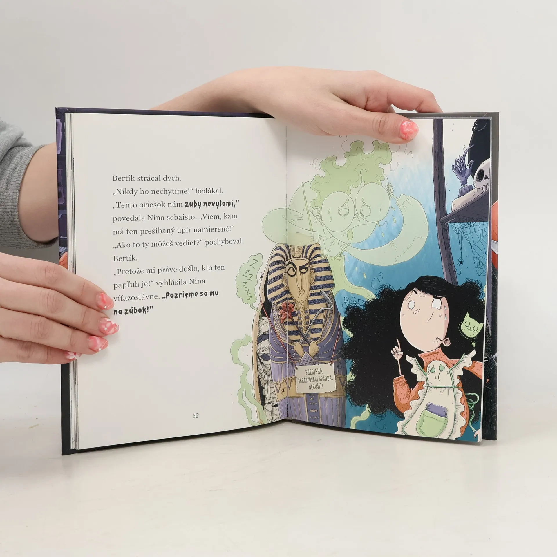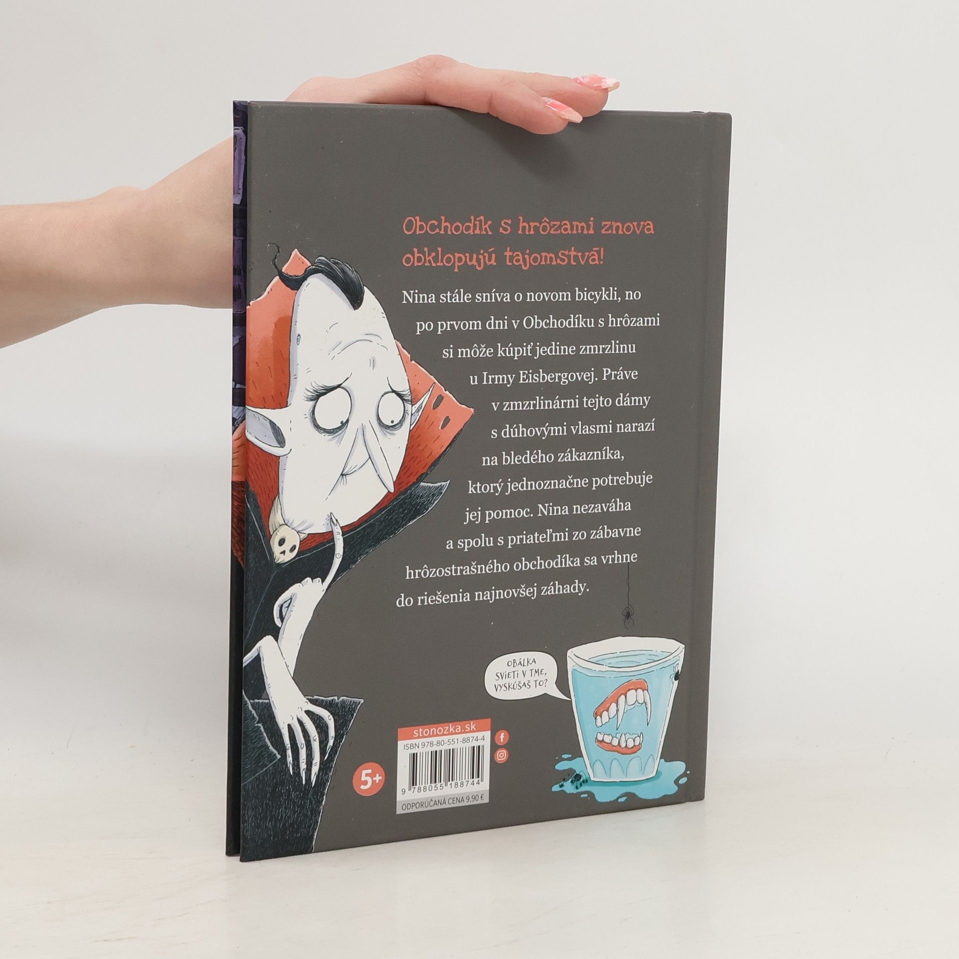 Obchodík s hrôzami znova obklopujú tajomstvá! Nina stále sníva o novom bicykli, no po prvom dni v Obchodíku s hrôzami si môže kúpiť jedine zmrzlinu u Irmy Eisbergovej. Práve v zmzrlinárni tejto dámy s dúhovými vlasmi narazí na bledého zákazníka, ktorý jednoznačne potrebuje jej pomoc. Upír Silvester predsa nemôže zostať bez zubov! Aj v obchodíku sa dejú čudesné veci – skrýva sa za krádežou cesnaku a Čudodedovej peleríny práve nešťastný bezzubý bleďoch? Nina nezaváha a spolu s priateľmi zo zábavne hrôzostrašného obchodíka sa vrhne do riešenia najnovšej záhady. Obálka svieti v tme, vyskúšaj to! Z fínskeho originálu preložila Alexandra Salmela. Pred deti od 5 rokov