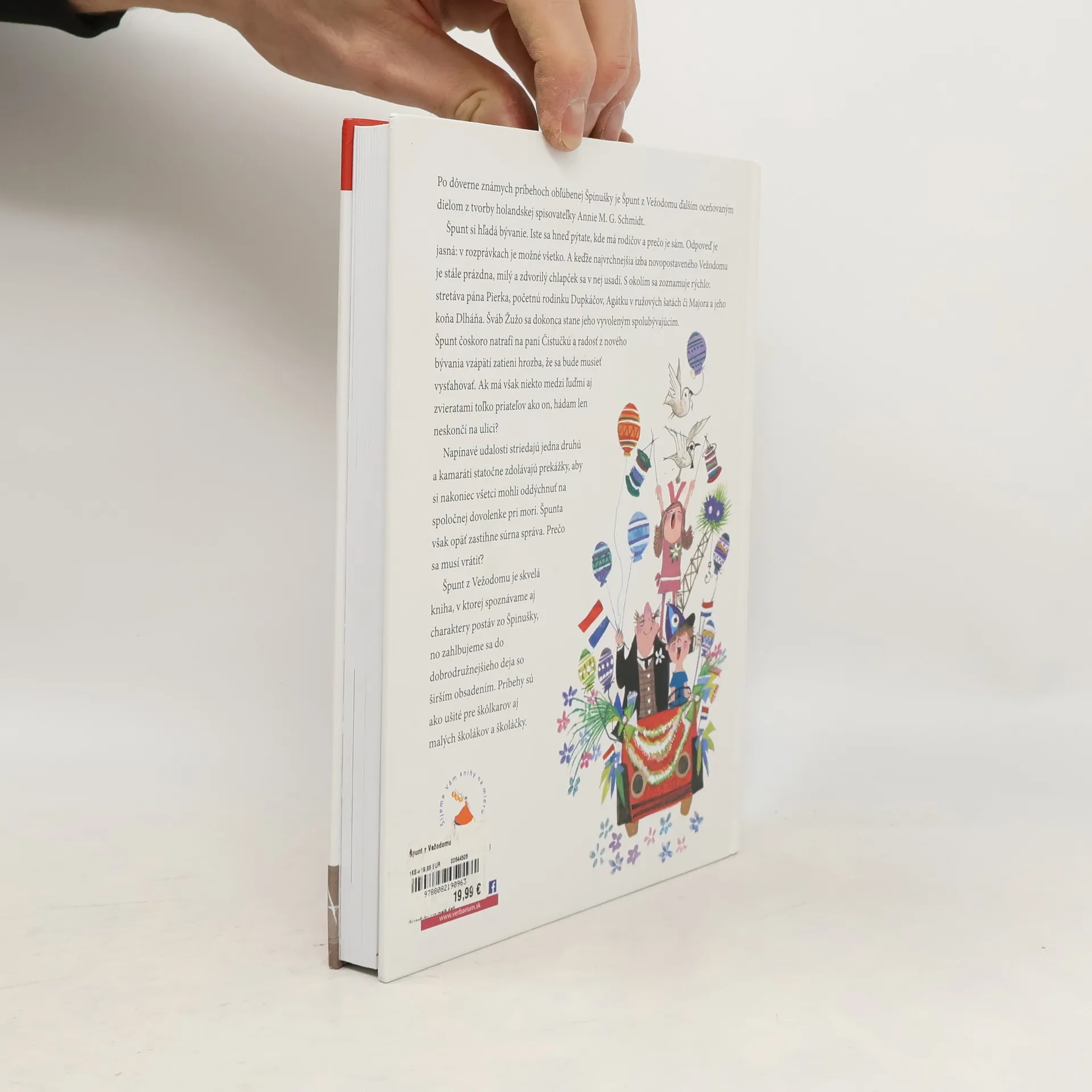 Po dôverne známych príbehoch obľúbenej Špinušky je Špunt z Vežodomu ďalším oceňovaným dielom z tvorby holandskej poetky a spisovateľky Annie M. G. Schmidt. Špunt si hľadá bývanie. Iste sa hneď pýtate, kde má rodičov a prečo je sám. Odpoveď je jasná: v rozprávkach je možné všetko. A keďže najvrchnejšia izba novopostaveného Vežodomu je stále prázdna, milý a zdvorilý chlapček sa v nej usadí. S okolím sa zoznamuje rýchlo: stretáva pána Pierka, početnú rodinku Dupkáčov, Agátku v ružových šatách či Majora a jeho koňa Dlháňa. Šváb Žužo sa dokonca stane jeho vyvoleným spolubývajúcim. Neobvyklé nápady nového obyvateľa domu sa však nie každému páčia. Špunt čoskoro natrafí na pani Čistučkú a radosť z nového bývania vzápätí zatieni hrozba, že Špunt sa bude musieť vysťahovať. Ak má však niekto medzi ľuďmi aj zvieratami toľko priateľov ako on, hádam len neskončí na ulici? Napínavé udalosti striedajú jedna druhú a kamaráti statočne zdolávajú prekážky, aby si nakoniec všetci mohli oddýchnuť na spoločnej dovolenke pri mori. Špunta však opäť zastihne súrna správa. Prečo sa musí vrátiť? Hoci Annie M. G. Schmidt napísala tieto príbehy pred mnohými rokmi, stále chytajú za srdce nové čitateľské generácie, sú vzrušujúce a plné iskrivého humoru. Autorka v nich neúnavne podpichuje dospelých pre ich obmedzený pohľad na život a citlivo vykresľuje deti ako vynaliezavé, životaschopné a slobodné bytosti, pripravené kedykoľvek pomôcť. Špunt z Vežodomu je skvelá kniha, v ktorej spoznávame aj charaktery postáv zo Špinušky, no zahlbujeme sa do dobrodružnejšieho deja so širším obsadením. Príbehy sú ako ušité pre škôlkarov aj malých školákov a školáčky. Smejme sa spolu, žasnime a pevne stojme pri skutočne odvážnom hrdinovi!