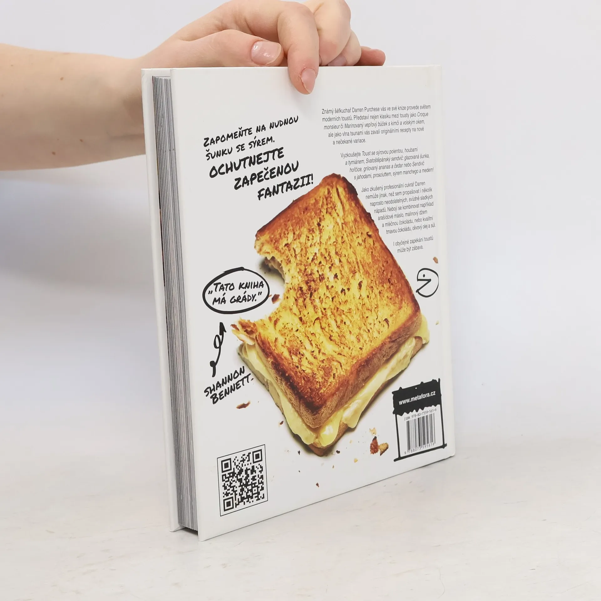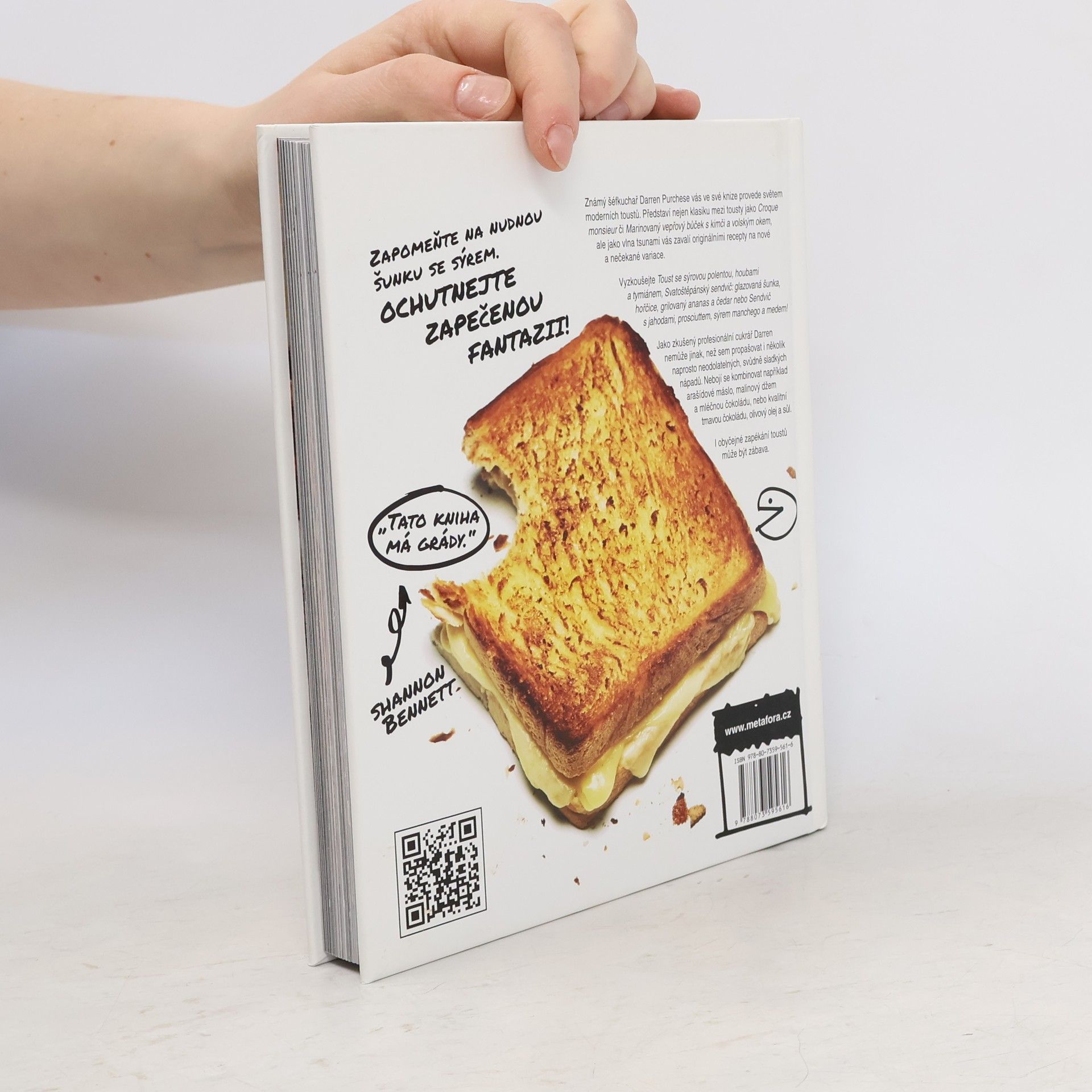 Známý šéfkuchař Darren Purchese vás ve své knize provede světem moderních toustů. Představí nejen klasiku mezi tousty jako Croque monsieur či Marinovaný vepřový bůček s kimči a volským okem, ale jako vlna tsunami vás zavalí originálními recepty na nové a nečekané variace. Vyzkoušejte Toust se syrovou polentou, houbami a tymiánem, Svatoštěpánský sendvič: glazovaná šunka, hořčice, grilovaný ananas a čedar nebo Sendvič s jahodami, prosciuttem, sýrem manchego a medem! Jako zkušený profesionální cukrář Darren nemůže jinak, než sem propašovat i několik naprosto neodolatelných, svůdně sladkých nápadů. Nebojí se kombinovat například arašídové máslo, malinový džem a mléčnou čokoládu, nebo kvalitní tmavou čokoládu, olivový olej a sůl.