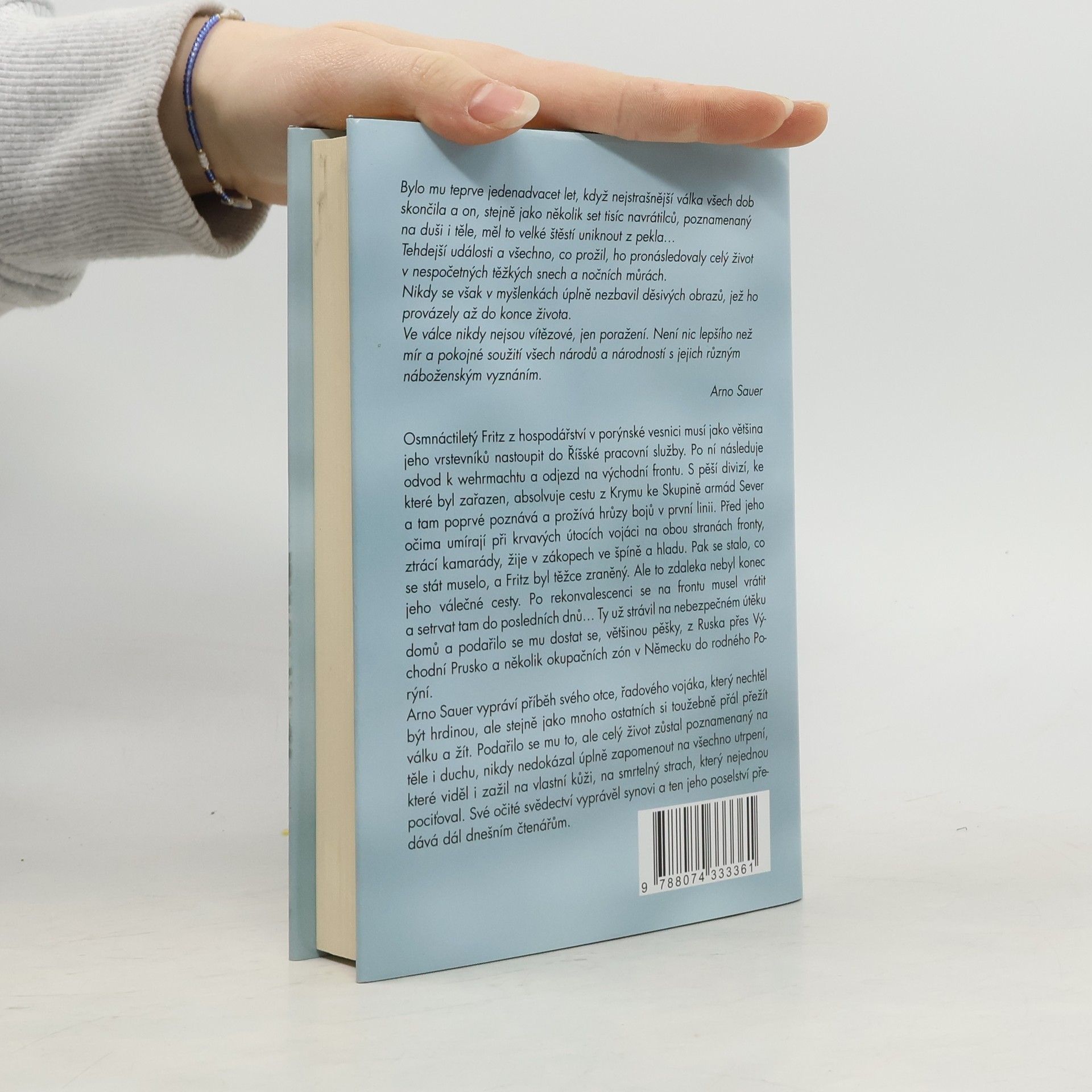 Osmnáctiletý Fritz z hospodářství v porýnské vesnici musí jako většina jeho vrstevníků nastoupit do Říšské pracovní služby. Po ní následuje odvod k wehrmachtu a odjezd na východní frontu. S pěší divizí, ke které byl zařazen, absolvuje cestu z Krymu ke Skupině armád Sever a tam poprvé poznává a prožívá hrůzy bojů v první linii. Před jeho očima umírají při krvavých útocích vojáci na obou stranách fronty, ztrácí kamarády, žije v zákopech ve špíně a hladu. Pak se stalo, co se stát muselo, a Fritz byl těžce zraněný. Ale to zdaleka nebyl konec jeho válečné cesty. Po rekonvalescenci se na frontu musel vrátit a setrvat tam do posledních dnů… Ty už strávil na nebezpečném útěku domů a podařilo se mu dostat se, většinou pěšky, z Ruska přes Východní Prusko a několik okupačních zón v Německu do rodného Porýní. Arno Sauer vypráví příběh svého otce, řadového vojáka, který nechtěl být hrdinou, ale stejně jako mnoho ostatních si toužebně přál přežít válku a žít. Podařilo se mu to, ale celý život zůstal poznamenaný na těle i duchu, nikdy nedokázal úplně zapomenout na všechno utrpení, které viděl i zažil na vlastní kůži, na smrtelný strach, který nejednou pociťoval. Své očité svědectví vyprávěl synovi a ten jeho poselství předává dál dnešním čtenářům.