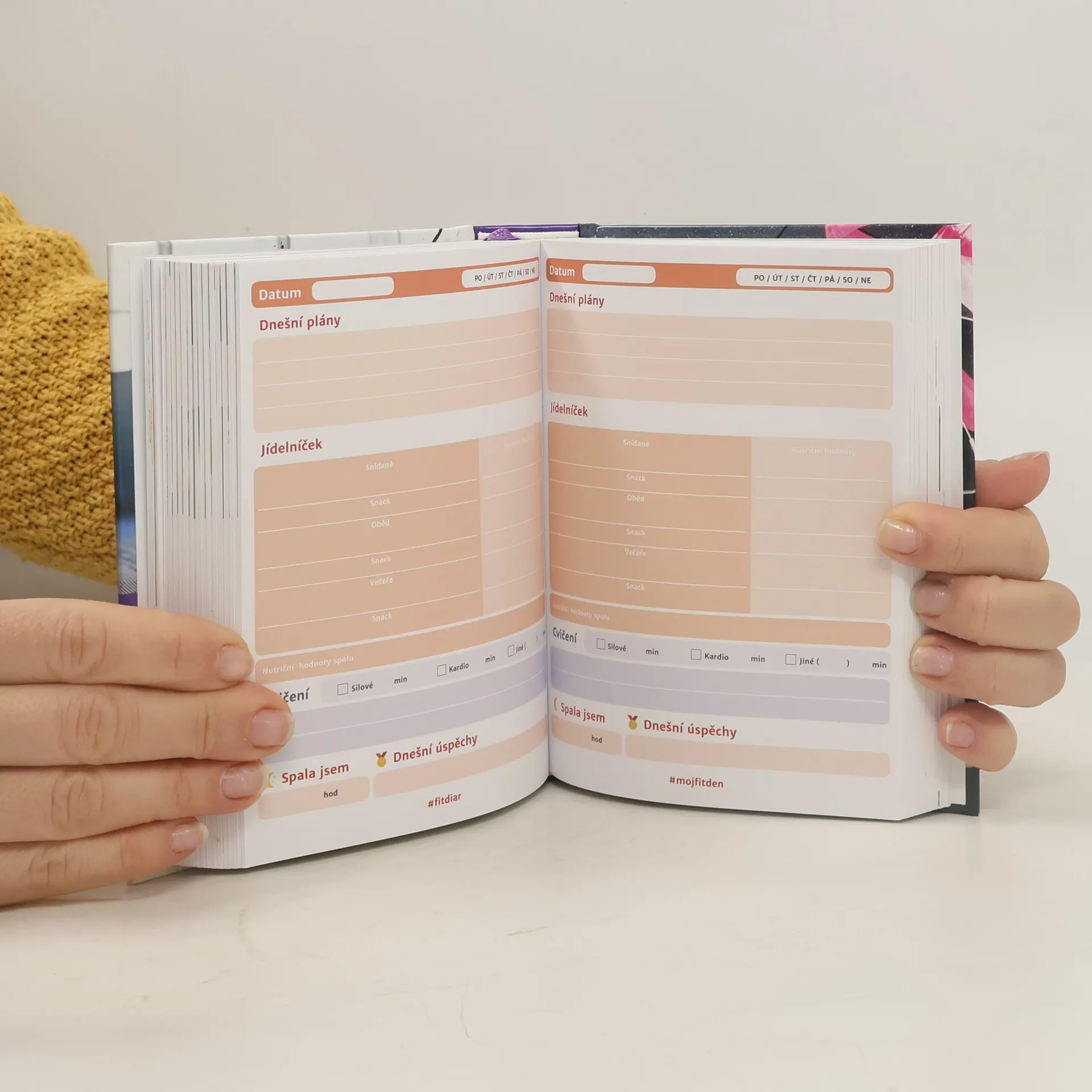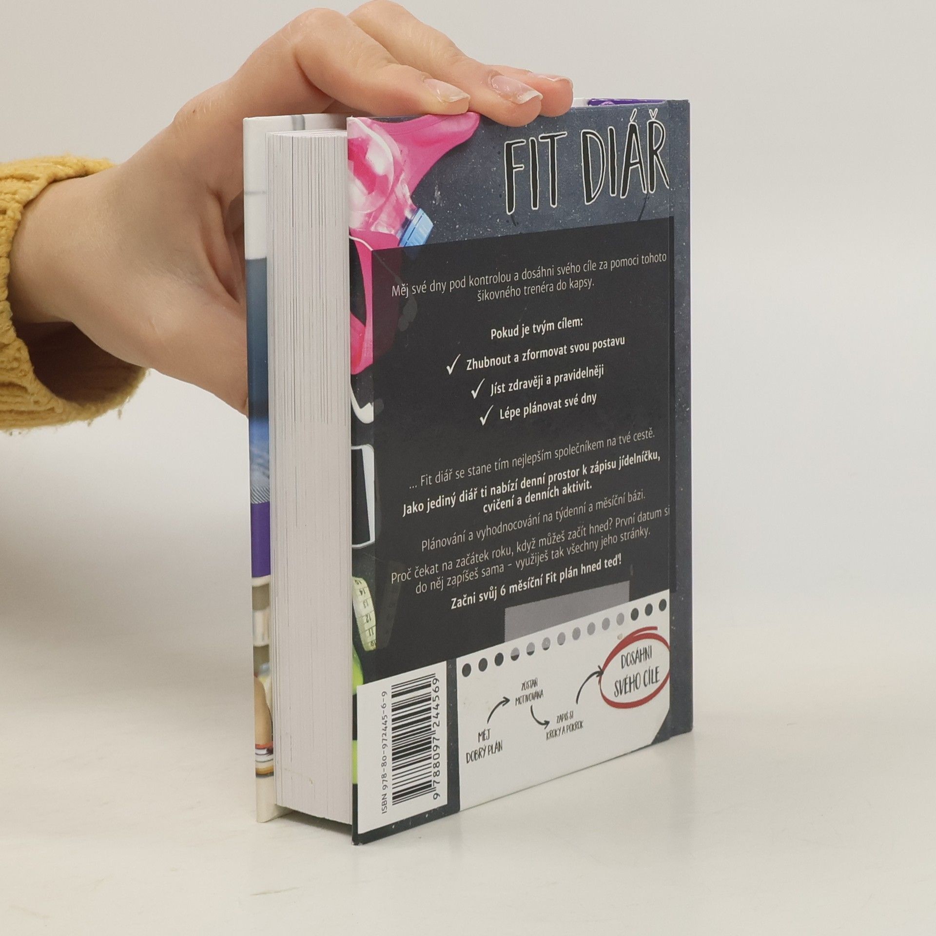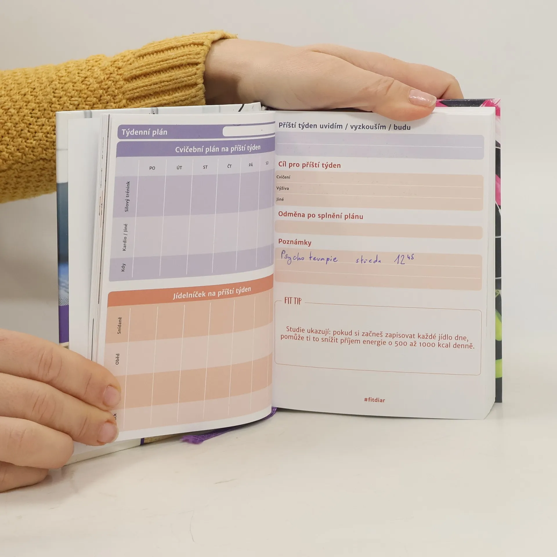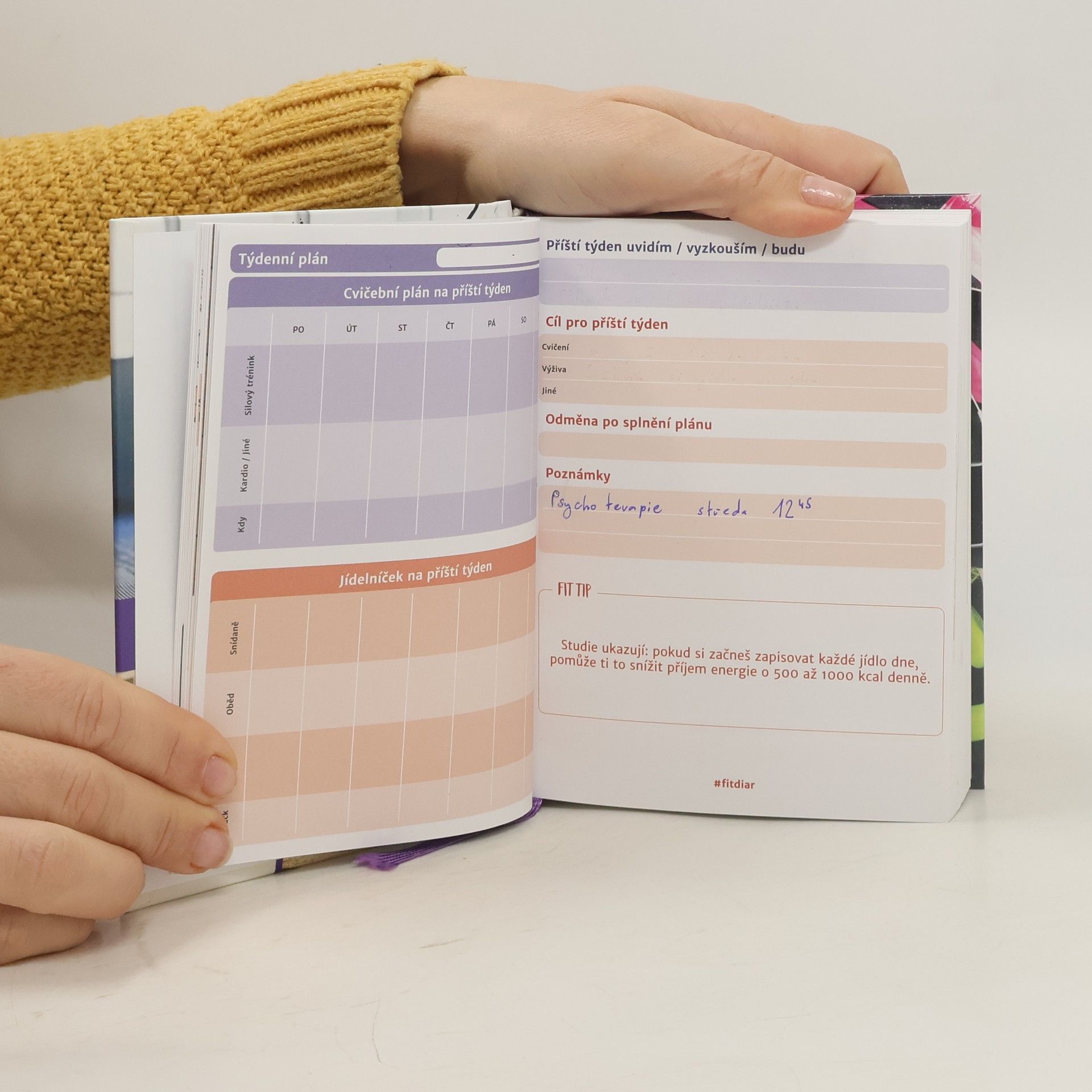 Myslíš to se svými cíli vážně? Fit diář ti pomůže s plánováním, monitorováním a vyhodnocováním tvé cesty k dosažení cílů. Pokud chceš zhubnout, jíst zdravěji nebo lépe plánovat, tento diář se stane tvým nejlepším společníkem. Nabízí denní prostor pro zápis jídelníčku, cvičení a aktivit. S Fit diářem si můžeš zapsat kroky a pokrok, zůstat motivovaná a dosáhnout svých cílů. Obsahuje tipy na úspěšné plánování, motivaci prostřednictvím odměn a sledování pokroku, a výzvy k novým aktivitám. Můžeš hodnotit své pokroky na týdenní a měsíční bázi a zjistit, co ve své rutině změnit. Začít můžeš kdykoli, protože si data zapisuješ sama, což ti umožní využít všechny stránky. Fit diář také nabízí zdravé recepty s nutričními hodnotami, týdenní fit tipy a denní monitorování spánku a úspěchů. Obsahuje články a rady pro zdravý životní styl a interaktivní QR kódy pro recepty. Jeho praktický formát ti umožní mít diář stále při sobě, a navíc obsahuje komunitní podporu na sociálních sítích. Zapisování na papír je prokazatelně účinnější než digitální metody, což zvyšuje pravděpodobnost, že diář skutečně využiješ.