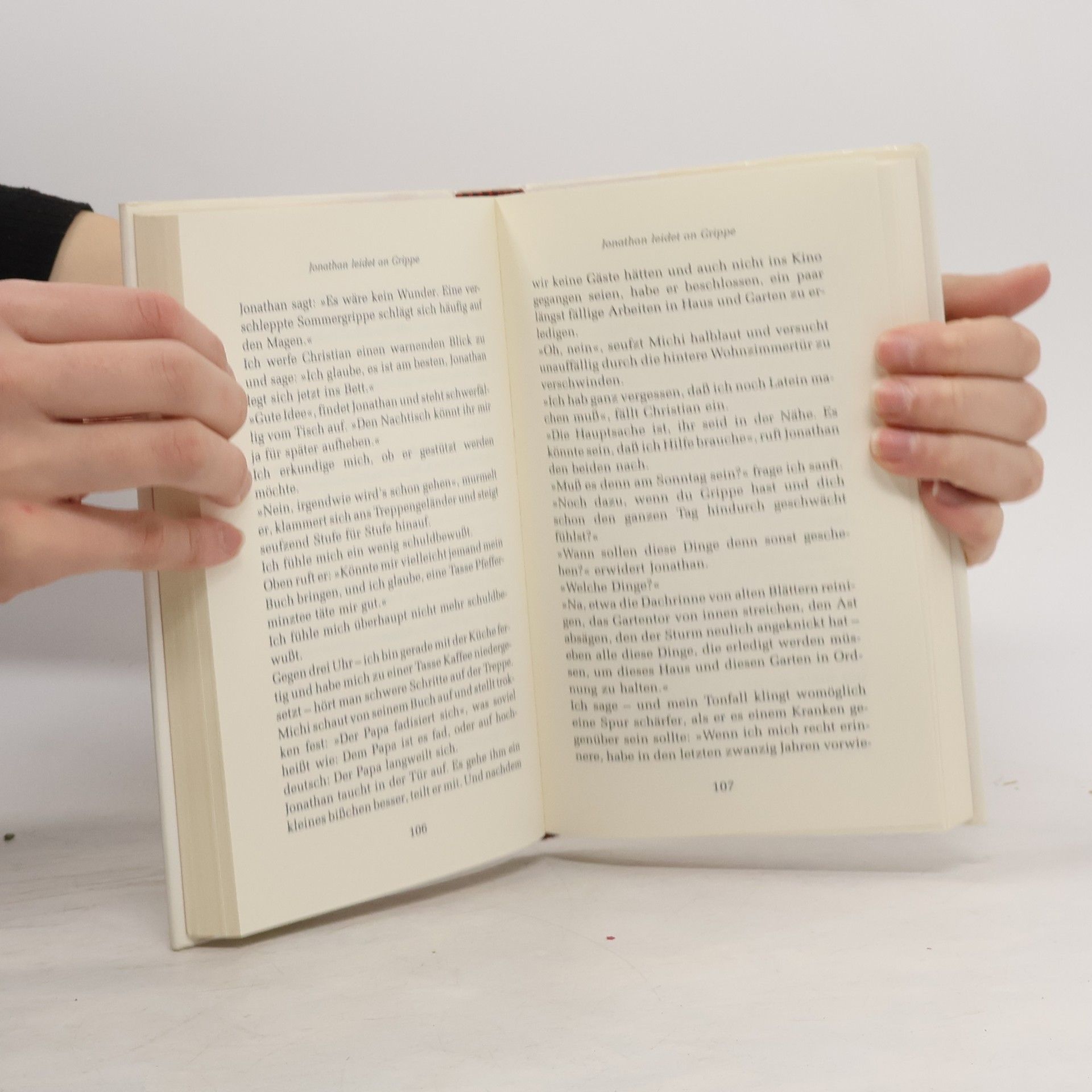 Es handelt von Situationen aus dem ehelichen Alltag, die jeder Betroffene in irgendeiner Form schon einmal erlebt hat, die aber kaum jemals auf einen Punkt gebracht wurden wie hier. Jonathan, der Männliche Held dieser heiteren Szenen einer Ehe, wird dabei niemals der Lächerlichkeit preisgegeben.Er bleibt stets der von der Gemahlin und den beiden heranwachsenden Söhnen geliebte, wenn manchmals auch nur mit zusammengebissenen Zähnen respektierte "beste Ehemann von allen". So kann man sich auf höchstem Niveau amüsieren, wenn Helga leeb von Jonathans Sommergrippe erzählt; oder von seiner Sorge , dass man seinen Geburtstag vergessen könnte, wenn er seinen Autoschlüssel stecken lässt, was nach Jonathans Ansicht ihm eigentlich nie, seiner Frau hingegen sehr wohl passieren kann, wenn Jonathan sein Lieblingsspiel, die Planung einer Urlaubsreise mit akribischer Sorgfalt,a ber phantastischer Chaotik zum äußersten treibt. Und wenn Jonathan ein Sakko kauft, dabei sein ganzes Modebewußtsein von anno dazumal auffahren läßt. im Haus der Familie unter die Arme greift, indem er behauptet, alles zu wissen und immer wieder erklä "Das kann ich auch, ist das ebenfalls nicht ohne...