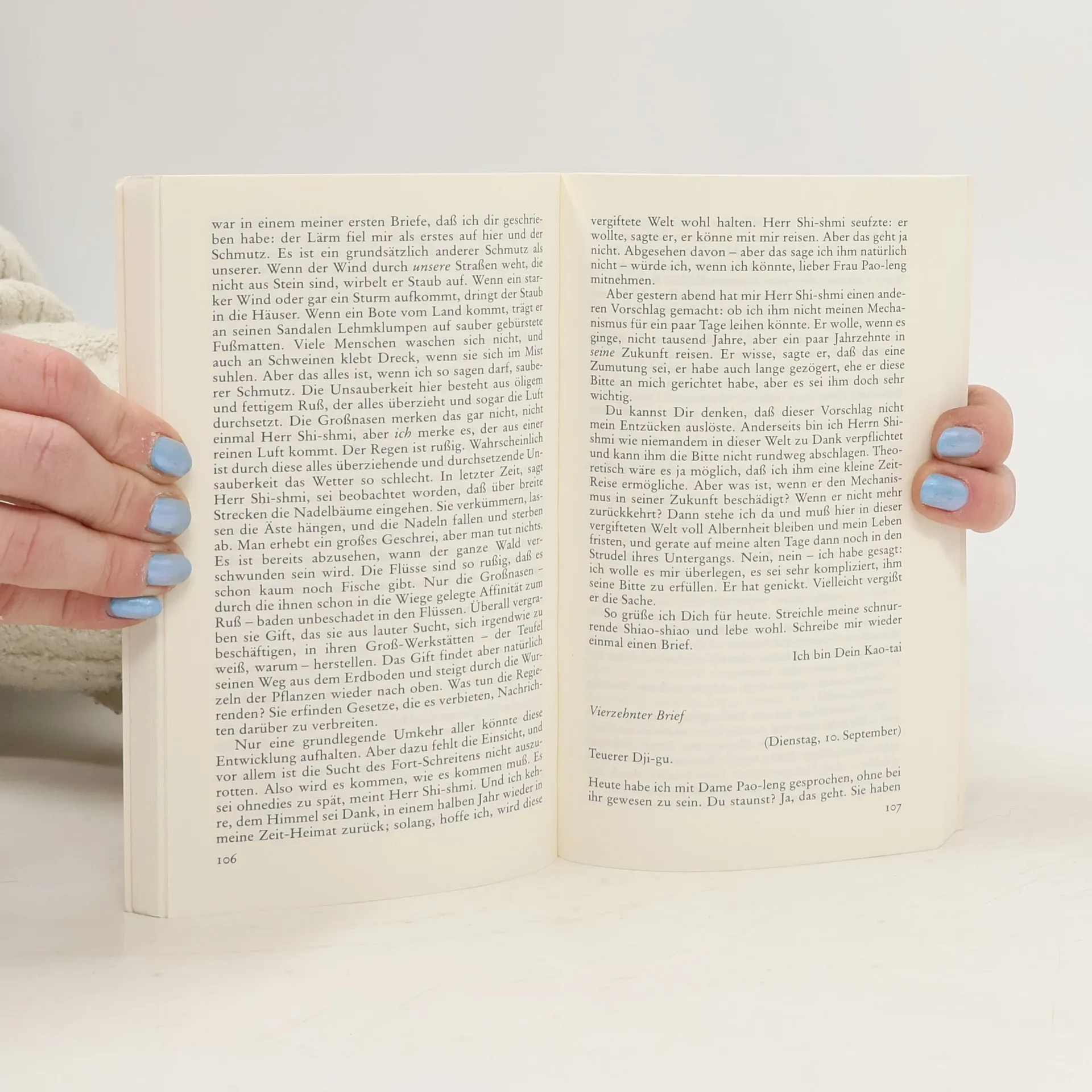 Ein Mandarin aus dem China des 10. Jahrhunderts versetzt sich mit Hilfe eines »Zeit-Reise-Kompasses« in die heutige Zeit. Er überspringt nicht nur tausend Jahre, sondern landet auch in einem völlig anderen Kulturkreis: in einer modernen Großstadt, deren Name in seinen Ohren wie Min-chen klingt und die in Ba Yan liegt. Verwirrt und wißbegierig stürzt sich Kao-tai in ein Abenteuer, von dem er nicht weiß, wie es ausgehen wird. In Briefen an seinen Freund im Reich der Mitte schildert er seine Erlebnisse und Eindrücke, erzählt vom seltsamen Leben der »Großnasen«, von ihren kulturellen und technischen Errungenschaften und versucht Beobachtungen und Vorgänge zu interpretieren, die ihm selbst zunächst unverständlich sind.