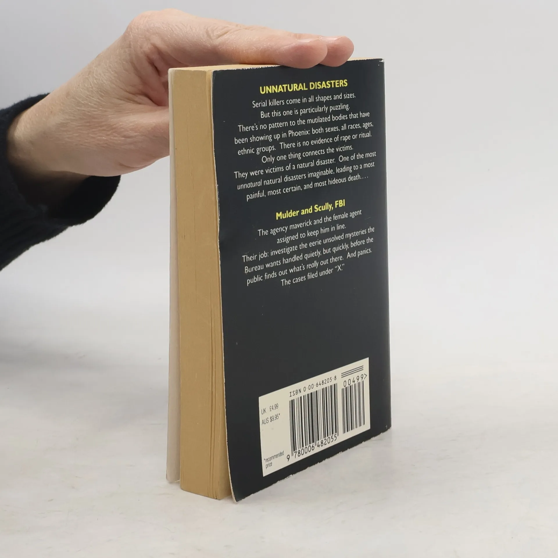UNNATURAL DISASTERS Serial killers come in all shapes and sizes. But this one is particularly puzzling. There's no pattern to the mutilated bodies that have been showing up in Phoenix: both sexes, all races, ages, ethnic groups. There is no evidence of rape or ritual. Only one thing connects the victims. They were victims of a natural disaster. One of the most unnatural natural disasters imaginable, leading to a most painful, most certain, and most hideous death… Mulder and Scully, FBI The agency maverick and the female agent assigned to keep him in line. Their job: investigate the eerie unsolved mysteries the Bureau wants handled quietly, but quickly, before the public finds out what's really out there. And panics. The cases filed under "X."