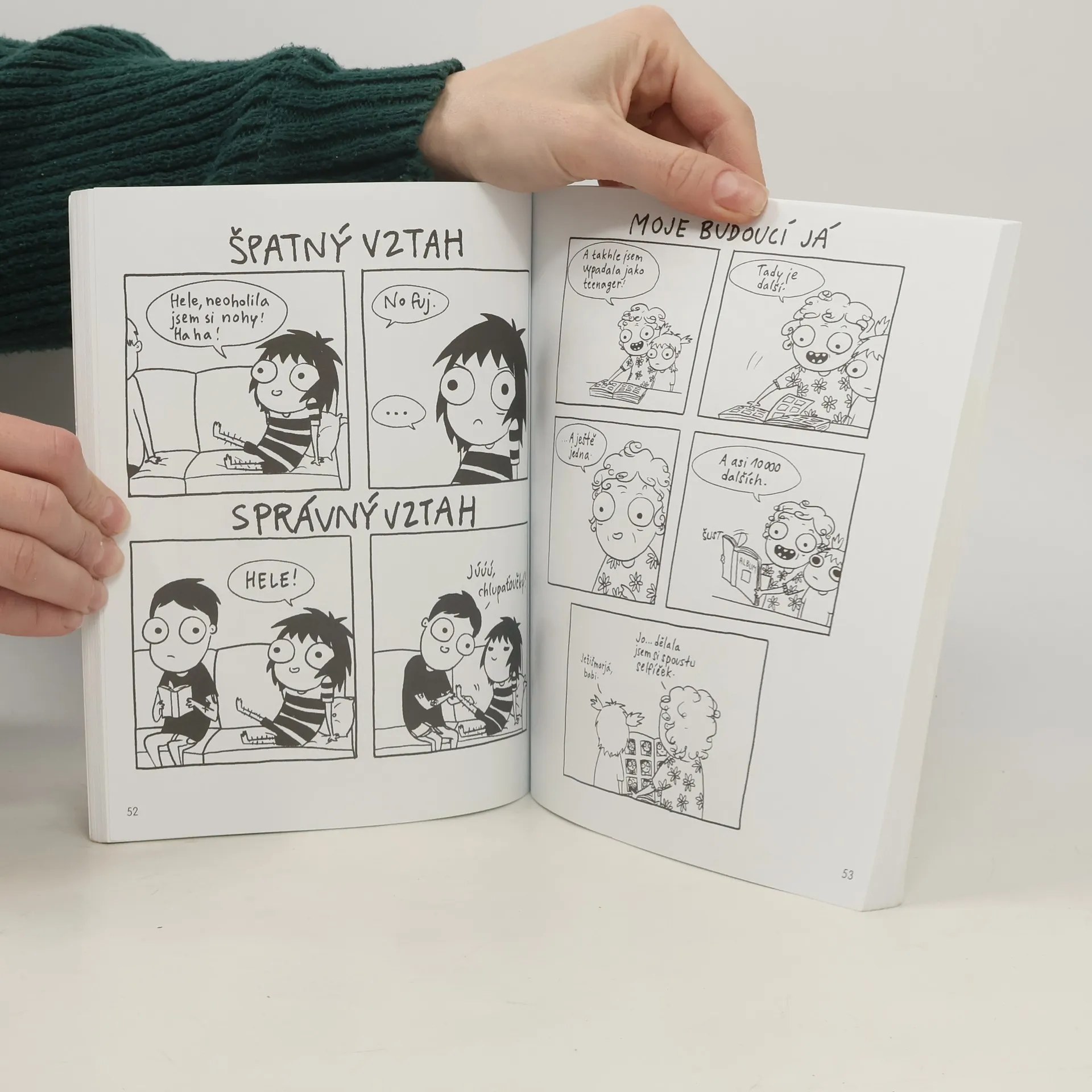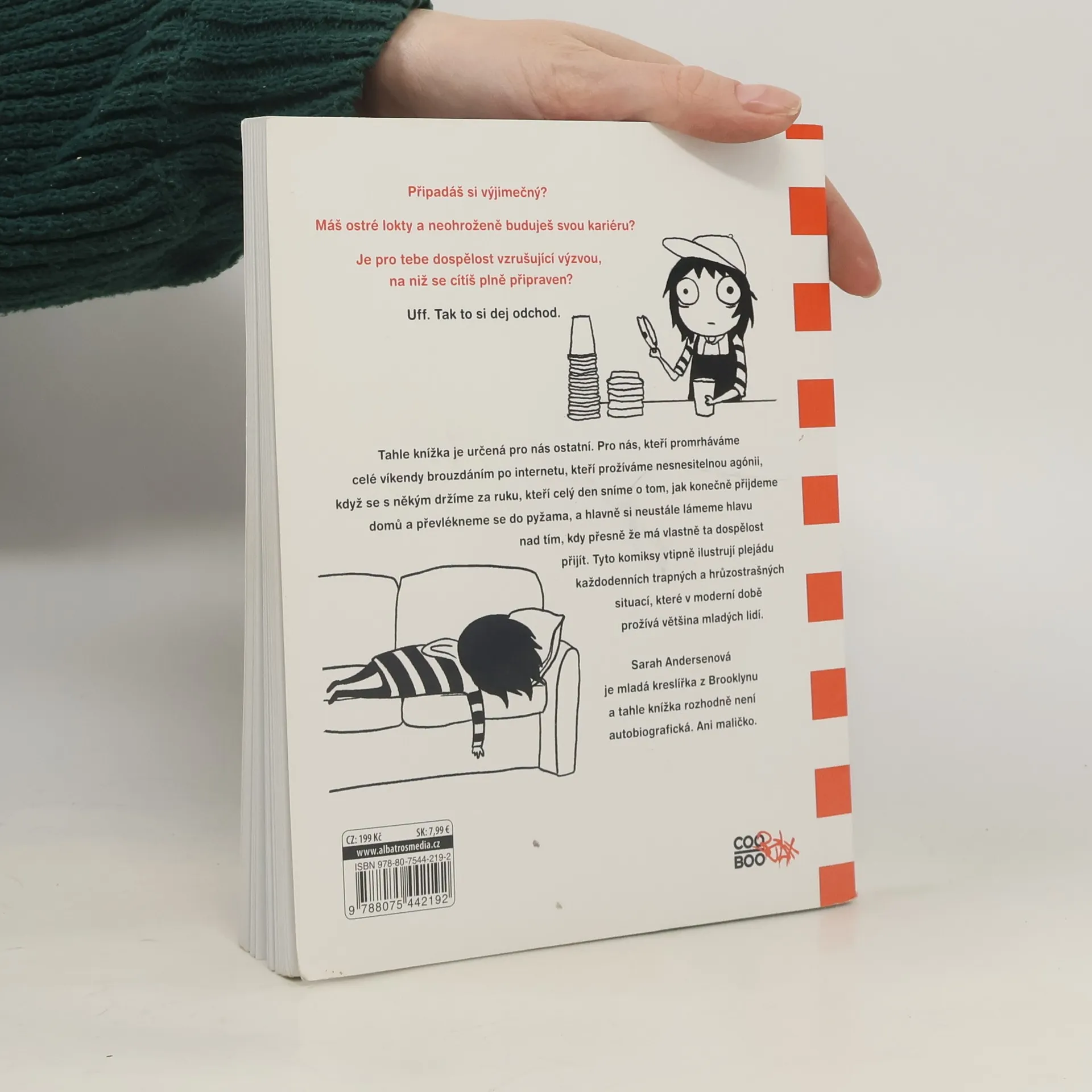 Tenhle komiks je pro všechny, kdo dokážou proflákat celé víkendy na internetu, pro které je držení se za ruce na ulici s naprosto úchvatným klukem nesnesitelná agónie, pro všechny, kdo sní o tom, že celý den zůstanou doma a budou se válet v pyžamu. A pro všechny, kdo přemýšlejí, kdy přesně vlastně ta dospělost začíná. Jinými slovy pro nás, kteří prožíváme hrůzy a trapnosti dnešního mladého života. Připadáš si výjimečný? Máš ostré lokty a neohroženě buduješ svou kariéru? Je pro tebe dospělost vzrušující výzvou, na niž se cítíš plně připravený? Uff. Tak to si dej odchod. Tahle knížka je určená pro nás ostatní, Pro nás, kteří promrháváme celé víkendy brouzdáním po internetu, kteří prožíváme nesnesitelnou agónii, když se s někým držíme za ruku, kteří celý den sníme o tom, jak konečně přijdeme domů a převlékneme se do pyžama, a hlavně si neustále lámeme hlavu nad tím, kdy přesně že má vlastně dospělost přijít. Tyto komiksy vtipně ilustrují plejádu každodenních trapných a hrůzostrašných situací, které v moderní době prožívá většina mladých lidí. Sarah Andersenová je mladá kreslířka z Brooklynu a tahle knížka rozhodně není autobiografická. Ani maličko.