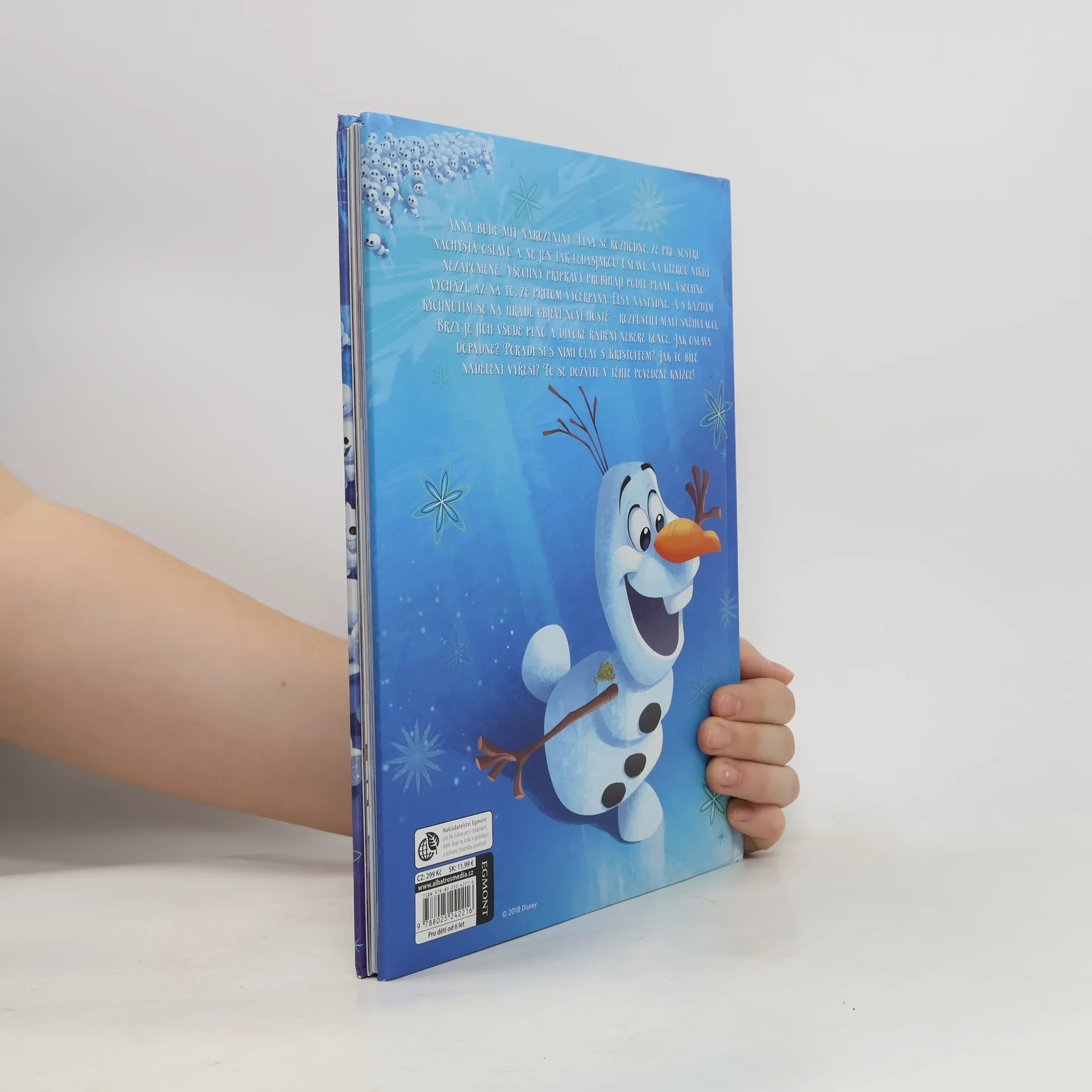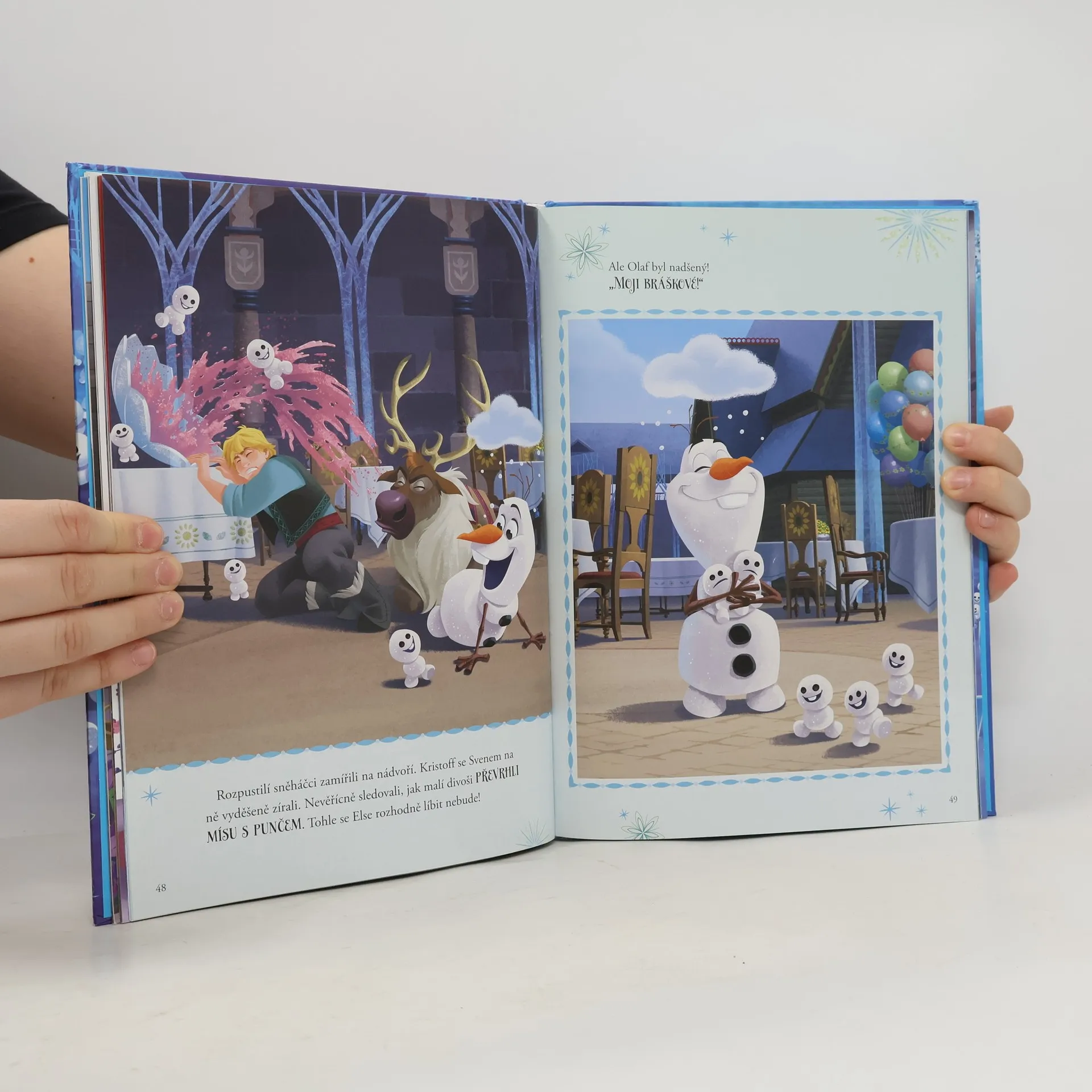 Anna bude mít narozeniny. Elsa se rozhodne, že pro sestru nachystá oslavu a ne jen tak ledasjakou! Oslavu, na kterou nikdy nezapomene. Všechny přípravy probíhají podle plánu, všechno vychází, až na to, že vyčerpaná Elsa přitom nastydne. A s každým kýchnutím se na hradě objeví noví hosté - rozpustilí malí sněhuláčci.Brzy je jich všude plno a jejich řádění nebere konce. Jak oslava dopadne? Poradí si s nimi Ol af s Kristoffem? Jak to bílé nadělení vyřeší? To se dozvíte v téhle povedené knížce!