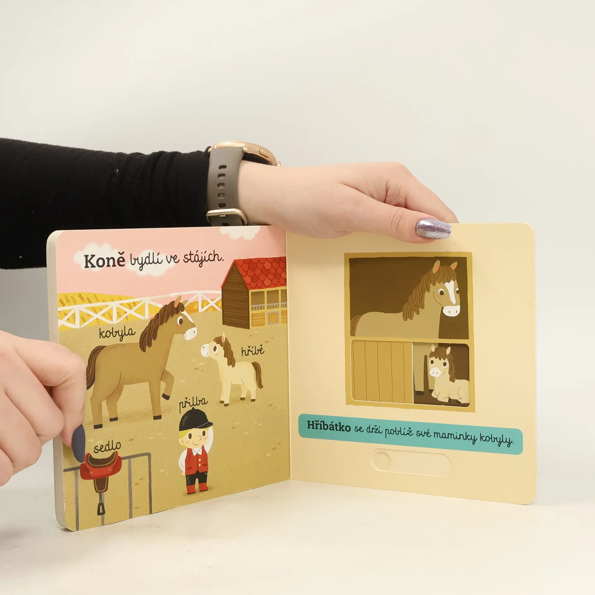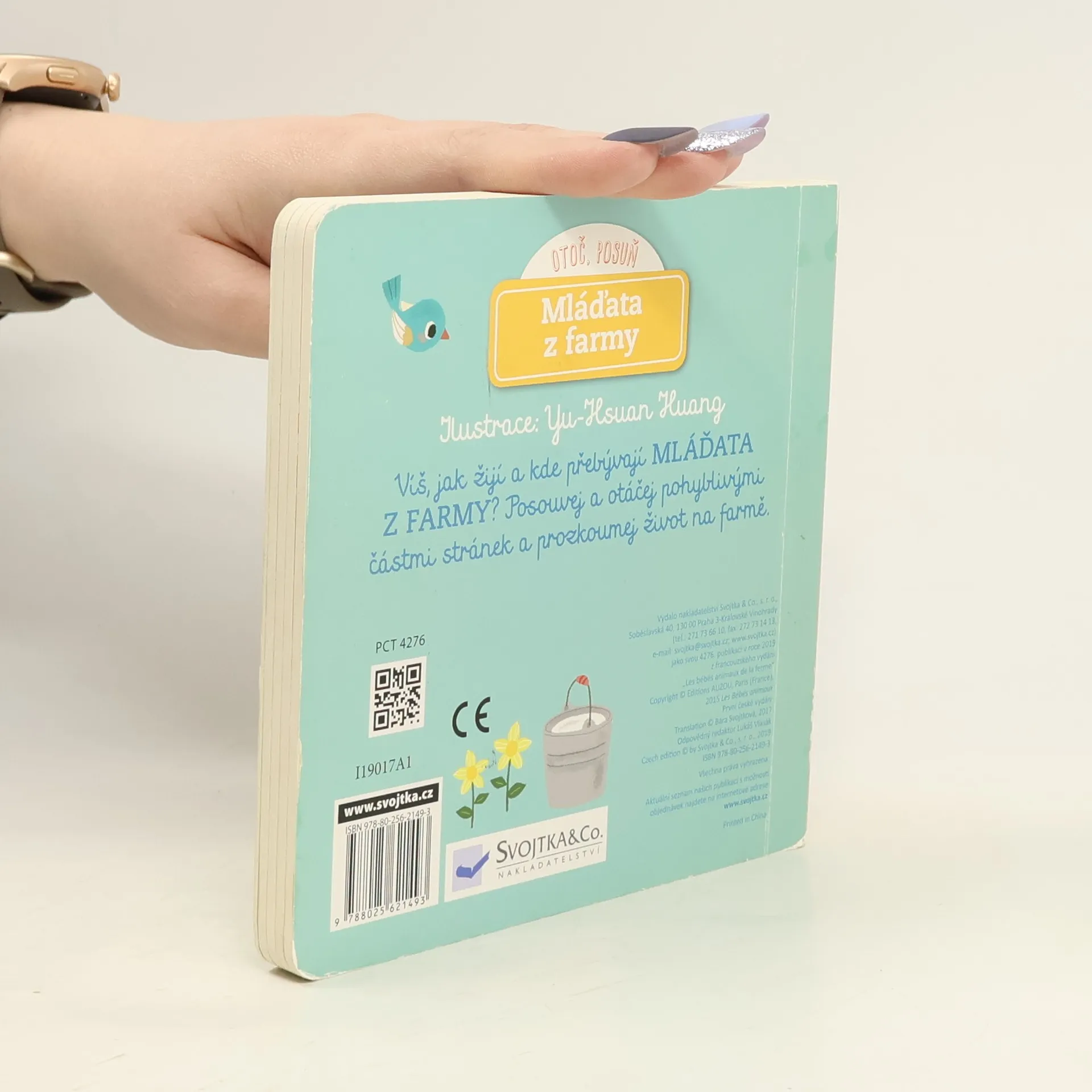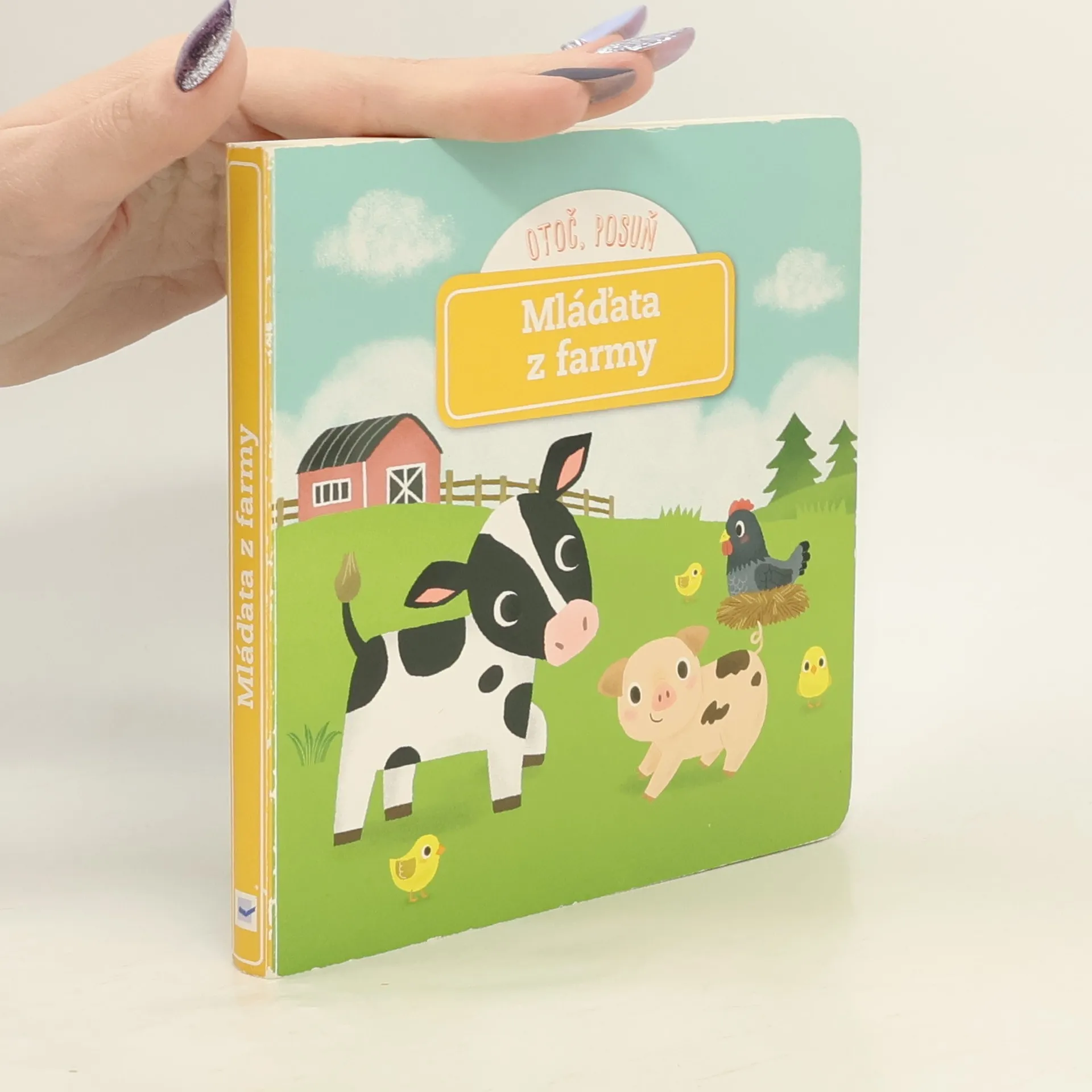 Víš, jak žijí a kde přebývají mláďata z farmy? Posouvej a otáčej pohyblivými částmi stránek a prozkoumej život na farmě. Kde má tele maminku? Přeci v kravíně! Prozkoumej, co všechno tam lze najít. Pst! Slepice spí v kurníku a kuřátko se právě klube z vajíčka. Pozoruj je! V chlívku se na tebe pro změnu těší prasnice se selátkem. A nakonec navštívíš koně ve stájích a podíváš se na krásné hříbě. Interaktivní knížka pro nejmenší rozvíjí díky pohyblivým prvkům jemnou motoriku dítěte a předává přirozenou formou poznatky o životě domácích zvířat.