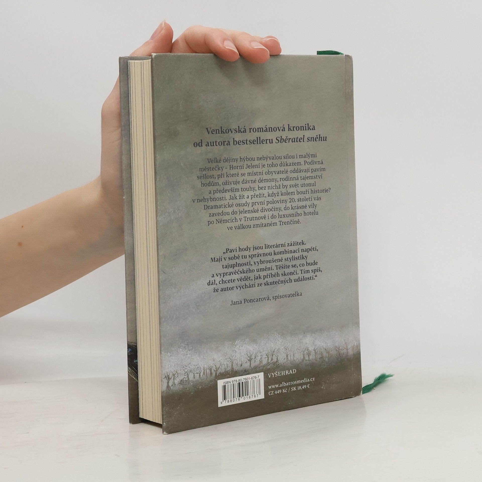 Venkovská románová kronika od autora bestselleru Sběratel sněhu Velké dějiny hýbou nebývalou silou i malými městečky – Horní Jelení je toho důkazem. Podivná sešlost, při které se místní obyvatelé oddávají pavím hodům, oživuje dávné démony, rodinná tajemství a především touhy, bez nichž by svět utonul v nehybnosti. Jak žít a přežít, když kolem bouří historie? Dramatické osudy první poloviny 20. století vás zavedou do jelenské divočiny, do krásné vily po Němcích v Trutnově i do luxusního hotelu ve válkou zmítaném Trenčíně.