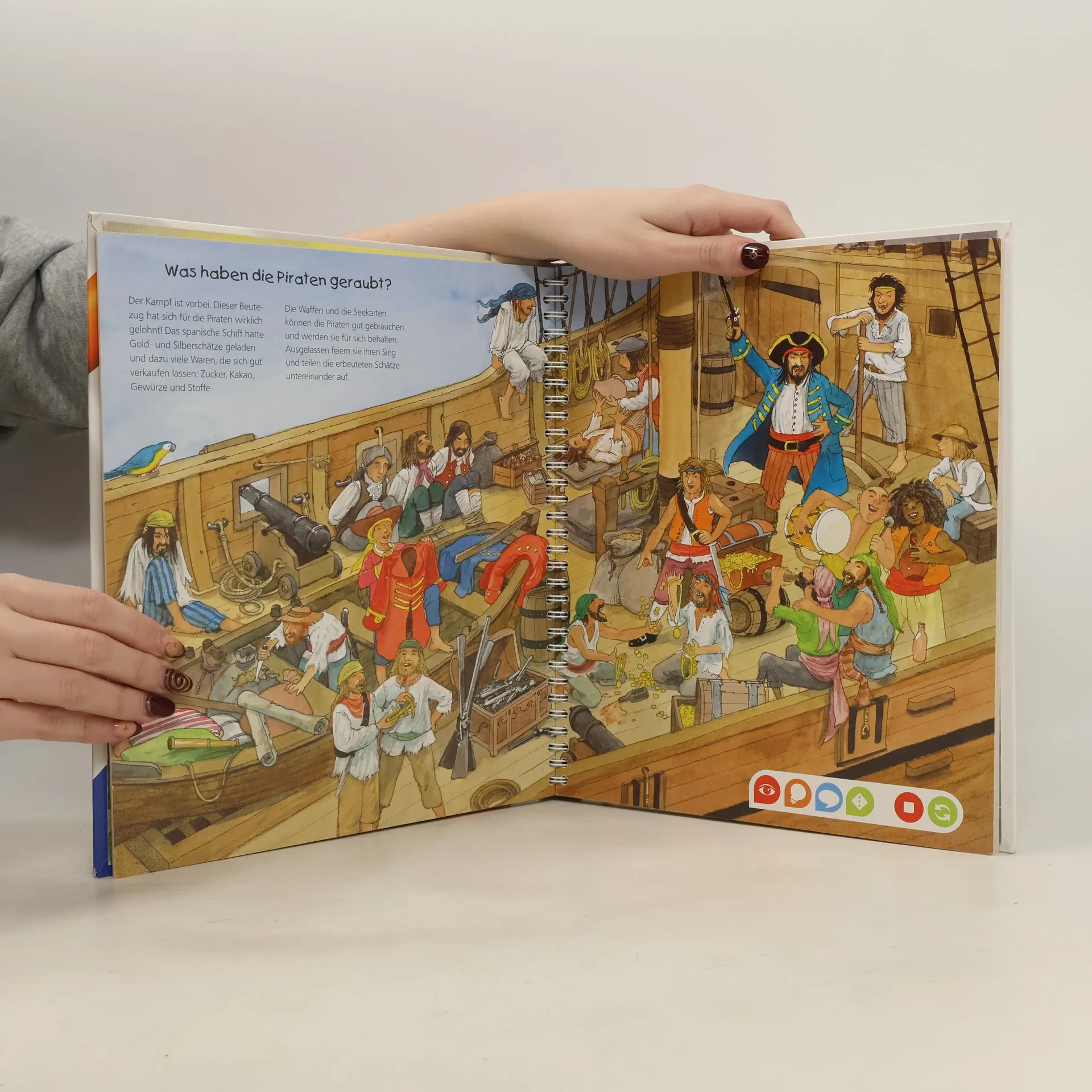 Palmzweige rauschen, Papageien schreien, Schiffsplanken knarren ... Verborgen in einer Bucht liegt das Piratenschiff vor Anker und lauert auf schwer beladene Handelsschiffe. Mit an Bord: die Buchgucker! Mit hochwertigen Illustrationen, Texten und Audioinhalten lässt tiptoi® sie am aufregenden Piratenalltag hautnah teilhaben und vermittelt gleichzeitig spannendes Hintergrundwissen.