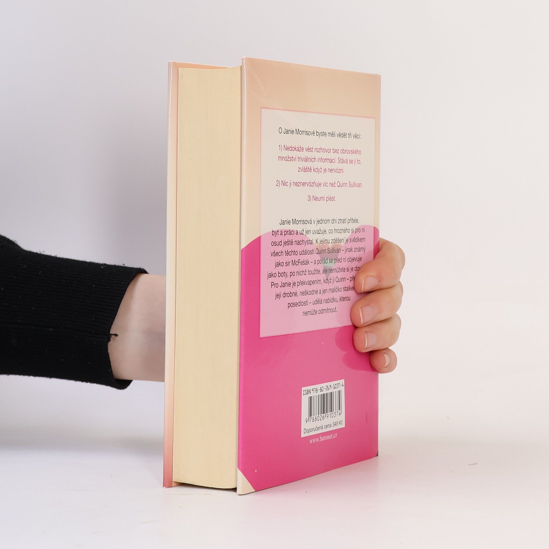 O Janie Morrisové byste měli vědět tři věci: 1) Nedokáže vést rozhovor bez obrovského množství triviálních informací. Stává se jí to, zvláště když je nervózní. 2) Nic ji neznervózňuje víc než Quinn Sullivan. 3) Neumí plést. Janie Morrisová v jeden den ztratí přítele, byt a práci a už jen uvažuje, co hrozného pro ni osud ještě chystá. K jejímu zděšení je svědkem všech těchto událostí Quinn Sullivan – jinak známý jako sir McFešák – a pořád se před ní objevuje jako boty, po nichž toužíte, ale nemůžete si je dovolit. Pro Janie je překvapením, když jí Quinn – předmět její drobné, neškodné a jen maličko stalkerské posedlosti – udělá nabídku, kterou nemůže odmítnout.