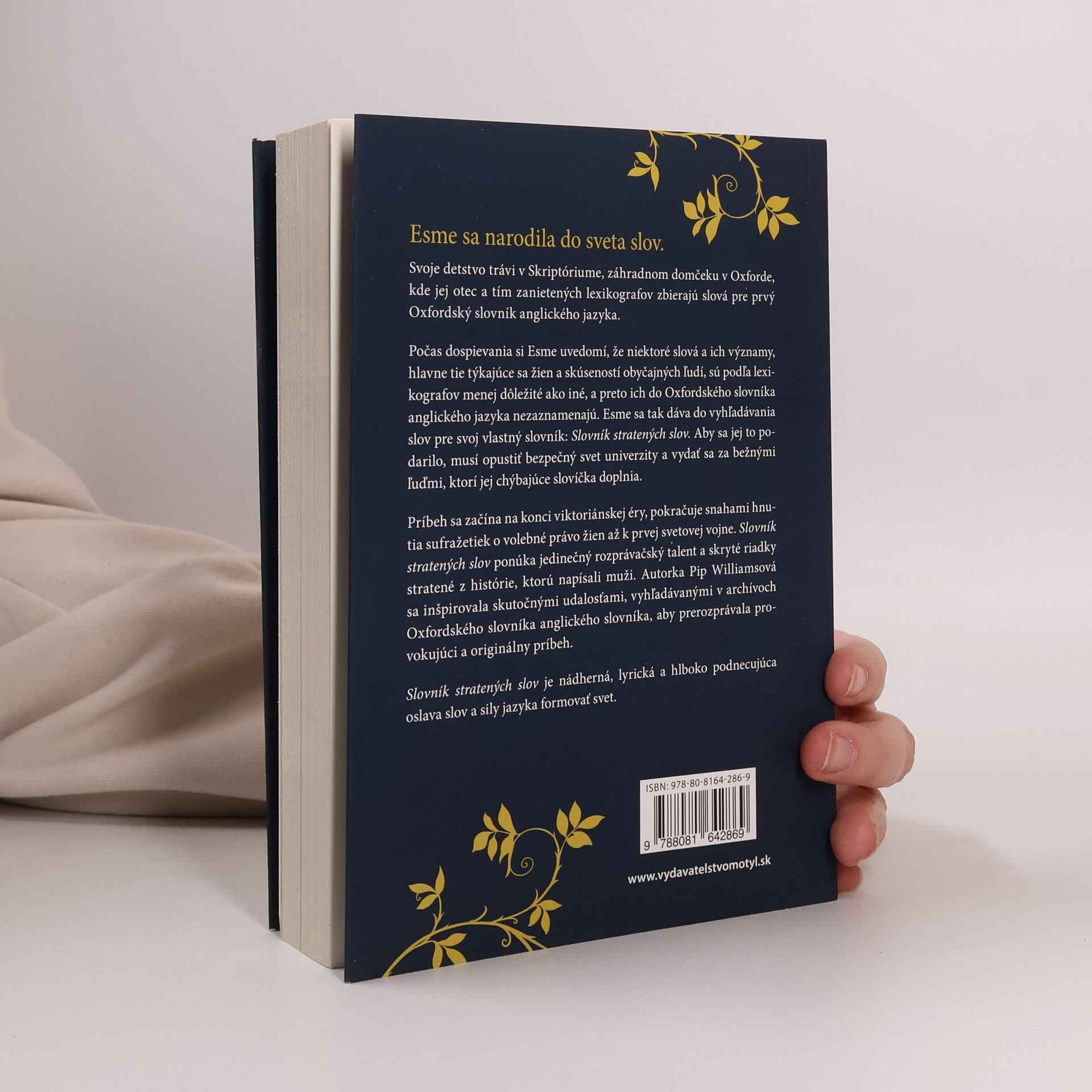 Esme sa narodila do sveta slov. Svoje detstvo trávi v Skriptóriu, záhradnom domčeku v Oxforde, kde jej otec a tím zanietených lexikografov zbierajú slová pre prvý Oxfordský slovník anglického jazyka. Počas dospievania si Esme uvedomí, že niektoré slová a ich významy, hlavne tie týkajúce sa žien a skúseností obyčajných ľudí, sú podľa lexikografov menej dôležité ako iné, a preto ich do Oxfordského slovníka anglického jazyka nezaznamenajú. Esme sa tak dáva do vyhľadávania slov pre svoj vlastný slovník: Slovník stratených slov. Aby sa jej to podarilo, musí opustiť bezpečný svet univerzity a vydať sa za bežnými ľuďmi, ktorí jej chýbajúce slovíčka doplnia. Príbeh sa začína na konci viktoriánskej éry, pokračuje snahami hnutia sufražetiek o volebné právo žien až k prvej svetovej vojne. Slovník stratených slov ponúka jedinečný rozprávačský talent a skryté riadky stratené z histórie, ktorú napísali muži. Autorka Pip Williamsová sa inšpirovala skutočnými udalosťami, vyhľadávanými v archívoch Oxfordského anglického slovníka, aby prerozprávala provokujúci a originálny príbeh. Slovník stratených slov je nádherná, lyrická a hlboko podnetná oslava slov a sily jazyka formovať svet.