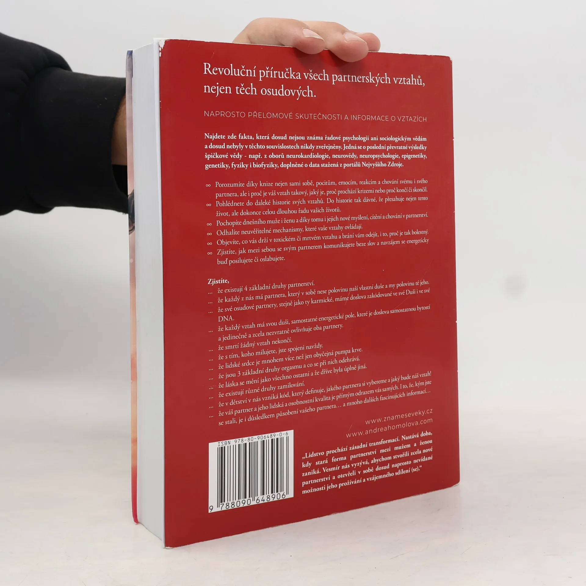 Kniha o vztazích, která změní váš život. Revoluční příručka všech partnerských vztahů, včetně těch osudových. Najdete zde naprosto přelomové skutečnosti a informace týkající se vztahů, fakta, která dosud nejsou známa řadové psychologii, ani sociologickým vědám, a dosud nebyla v těchto souvislostech nikdy zveřejněna. Jedná se nejen o poslední převratné výsledky špičkové světové vědy - např. z oborů neurokardiologie, neurovědy, neuropsychologie, epigenetiky, genetiky, fyziky a biofyziky, související se vztahy, ale i skutečnosti a souvislosti z duchovních věd. Kniha je výjimečná syntézou obou pramenů poznání a také tím, že vám zodpoví všechny otázky na téma partnerství, na které jste dosud hledali odpovědi, ale nenalezli je. Dozvíte se například, že DNA je neuroplastická, neboli že začínáme být schopni ji sami přepisovat svým vlastním vědomím. Že v DNA je uložen kód našich partnerů. Že žádný vztah nikdy neskončí, ani smrtí jednoho z partnerů. Že pouhou myšlenkou, i na vzdálenost tisíců kilometrů, ovlivňujeme tepovou frekvenci toho, na nějž s láskou pomyslíme a mnoho podobných převratných informací, které nebyly dosud zveřejněny v těchto souvislostech. Lze koupit na www.znameseveky.cz