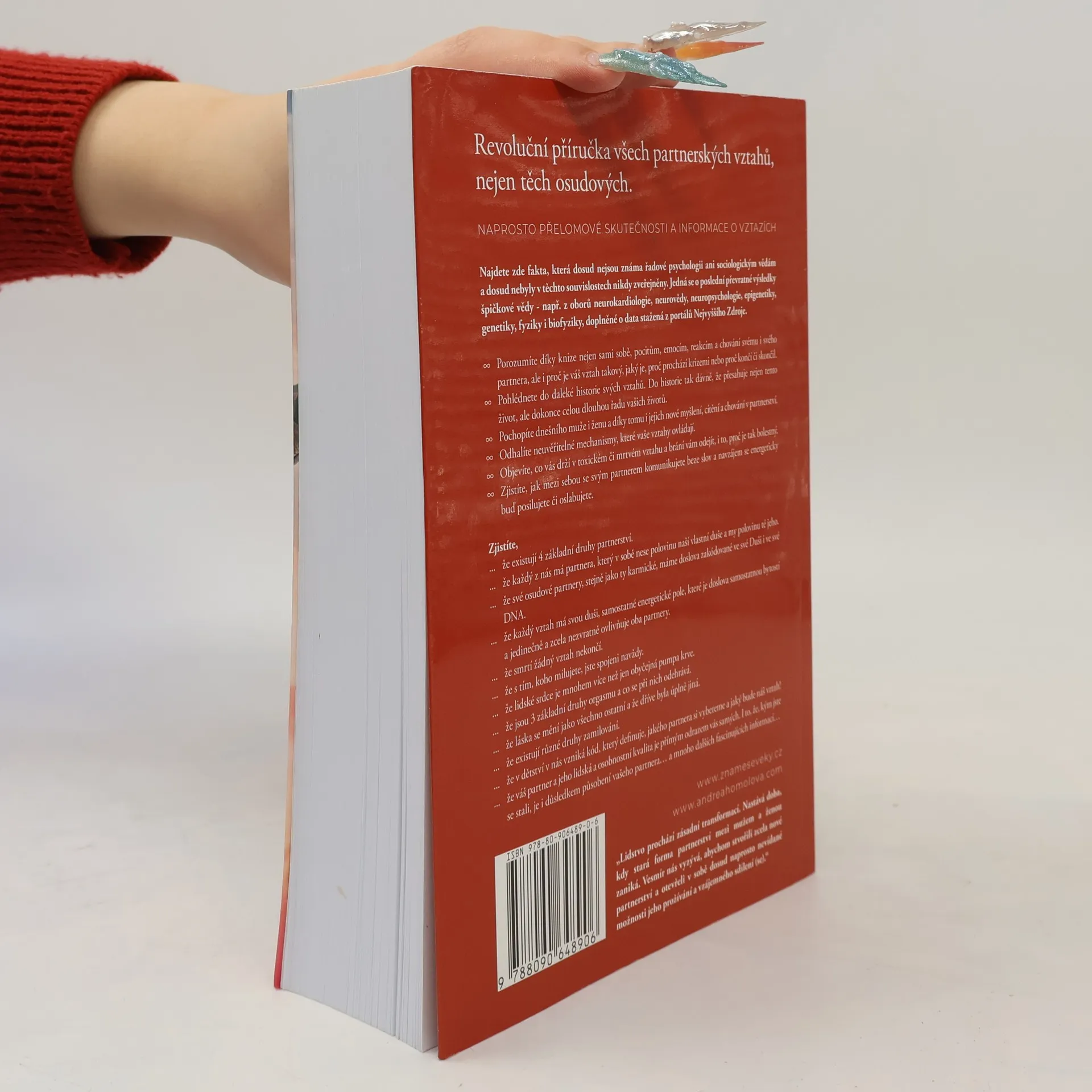 Kniha o vztazích, která změní váš život. Revoluční příručka všech partnerských vztahů, včetně těch osudových. Najdete zde naprosto přelomové skutečnosti a informace týkající se vztahů, fakta, která dosud nejsou známa řadové psychologii, ani sociologickým vědám, a dosud nebyla v těchto souvislostech nikdy zveřejněna. Jedná se nejen o poslední převratné výsledky špičkové světové vědy - např. z oborů neurokardiologie, neurovědy, neuropsychologie, epigenetiky, genetiky, fyziky a biofyziky, související se vztahy, ale i skutečnosti a souvislosti z duchovních věd. Kniha je výjimečná syntézou obou pramenů poznání a také tím, že vám zodpoví všechny otázky na téma partnerství, na které jste dosud hledali odpovědi, ale nenalezli je. Dozvíte se například, že DNA je neuroplastická, neboli že začínáme být schopni ji sami přepisovat svým vlastním vědomím. Že v DNA je uložen kód našich partnerů. Že žádný vztah nikdy neskončí, ani smrtí jednoho z partnerů. Že pouhou myšlenkou, i na vzdálenost tisíců kilometrů, ovlivňujeme tepovou frekvenci toho, na nějž s láskou pomyslíme a mnoho podobných převratných informací, které nebyly dosud zveřejněny v těchto souvislostech. Lze koupit na www.znameseveky.cz