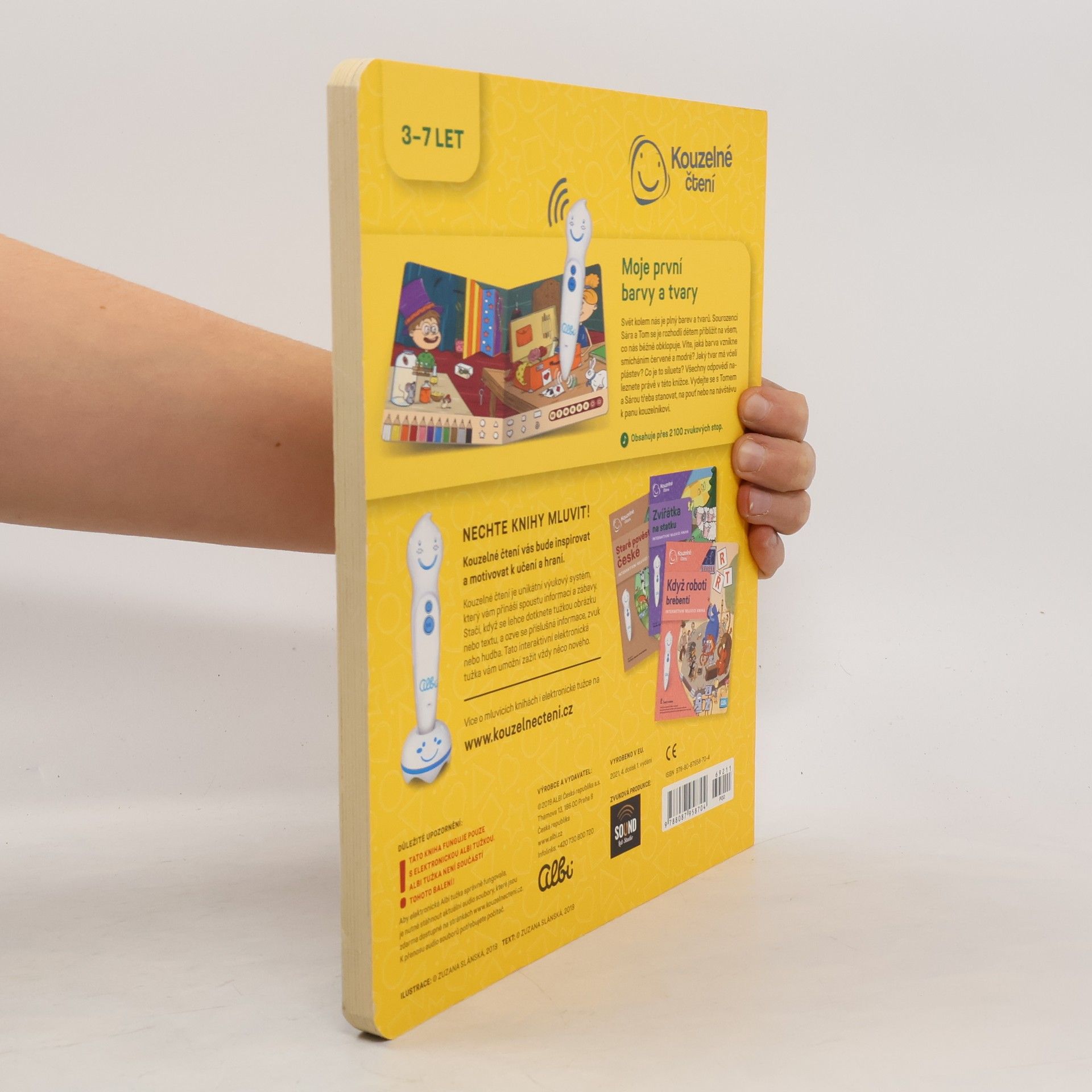Interaktivní mluvící kniha Moje první barvy a tvary z edice Kouzelné čtení provede děti od 3 let světem kolem nás a ukáže jim, jak již název napovídá, všemožné barvy a tvary. Průvodci se stanou sourozenci Sára a Tom a poví dětem například jaká barva vznikne smícháním červené a modré, jaký tvar má včelí plástev a co je silueta.Kniha je plná dialogů a zvuků, které děti zaujmou. Nechybí ani oblíbené zábavné kvízy ve 3 úrovních obtížnosti.Kniha Moje první barvy a tvary obsahuje přes 2100 zvuků a textů.