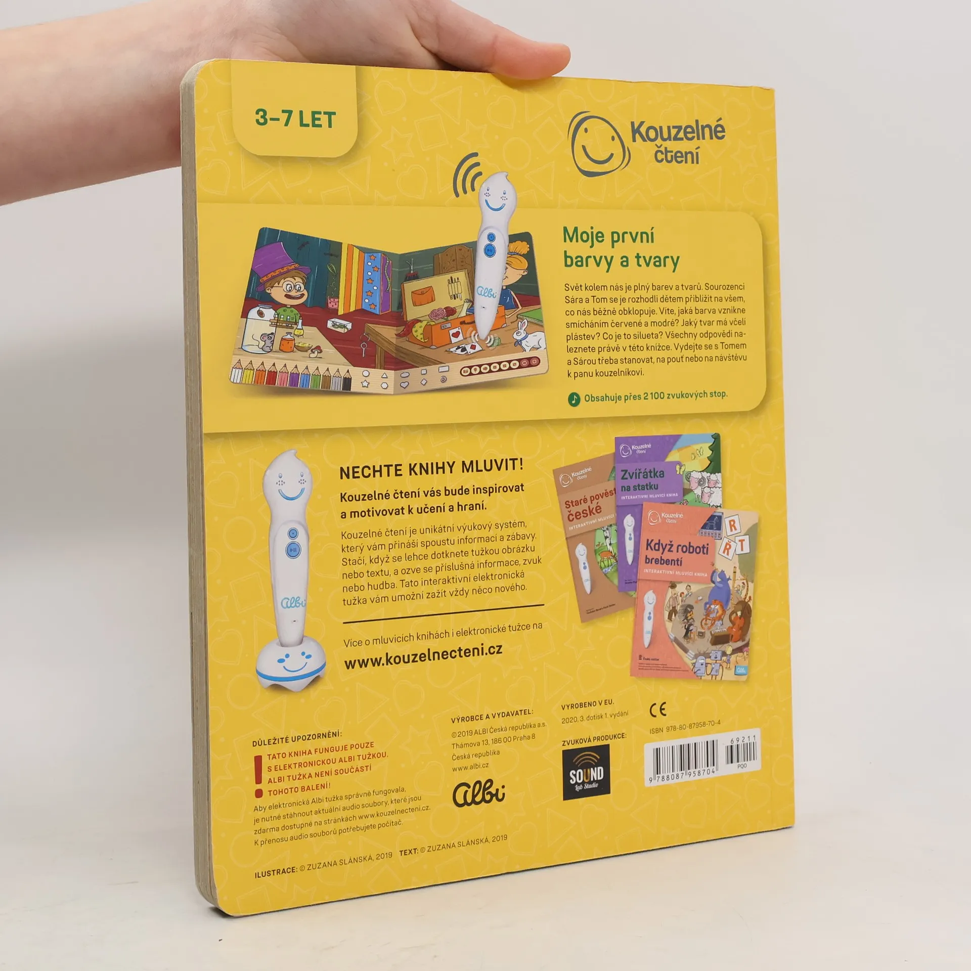 Interaktivní mluvící kniha Moje první barvy a tvary z edice Kouzelné čtení provede děti od 3 let světem kolem nás a ukáže jim, jak již název napovídá, všemožné barvy a tvary. Průvodci se stanou sourozenci Sára a Tom a poví dětem například jaká barva vznikne smícháním červené a modré, jaký tvar má včelí plástev a co je silueta.Kniha je plná dialogů a zvuků, které děti zaujmou. Nechybí ani oblíbené zábavné kvízy ve 3 úrovních obtížnosti.Kniha Moje první barvy a tvary obsahuje přes 2100 zvuků a textů.