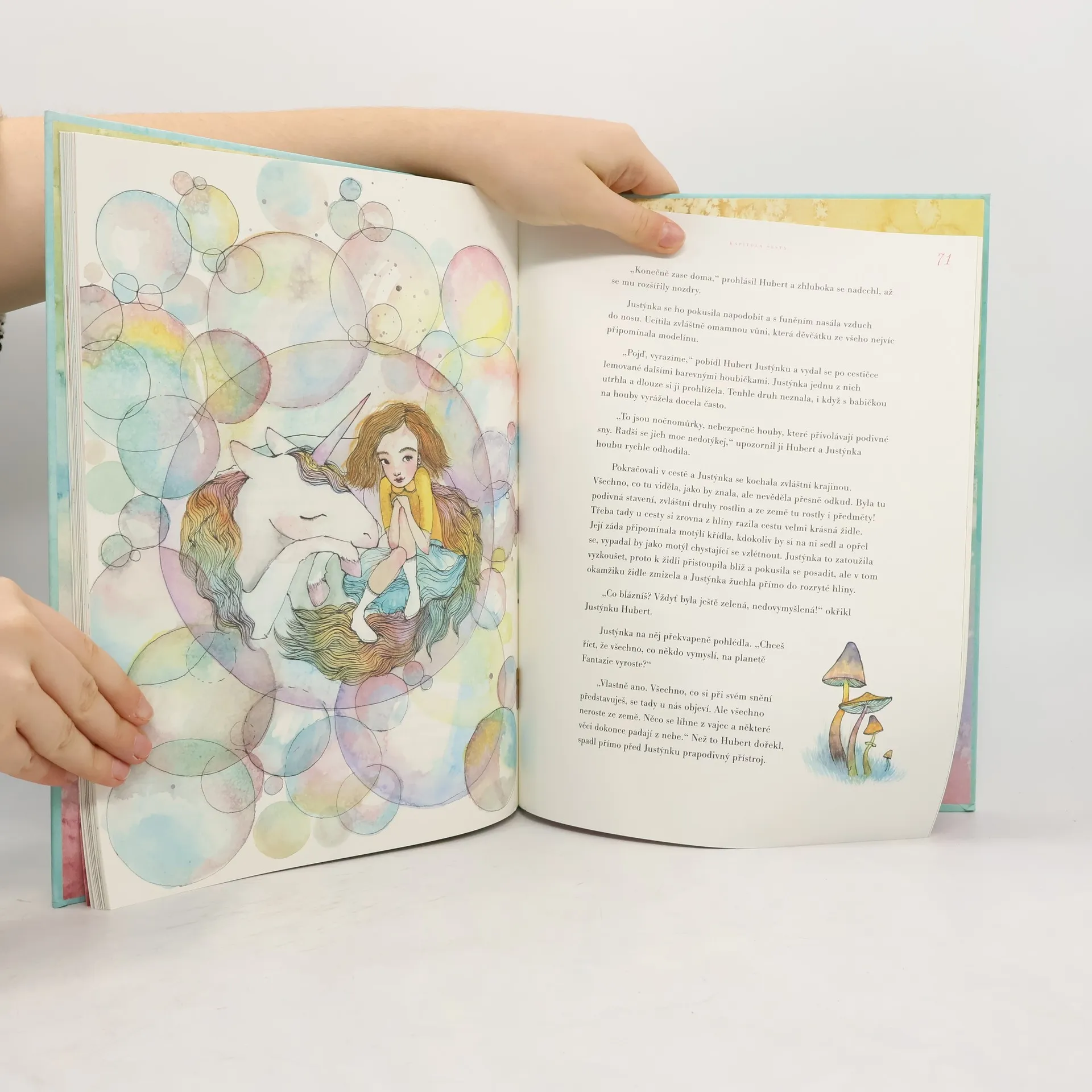 Justýnka je docela obyčejná holčička, které ale dočista chybí fantazie. Svět vidí docela nudně, šedivě, úplně bez nápadu. Naštěstí se jí dostane pomoci od asistenčního jednorožce Huberta. Ten ji za pouhých šest dní naučí věci kolem sebe vidět úplně jinak – najednou je svět kolem ní barevný, plný dobrodružství a zážitků.