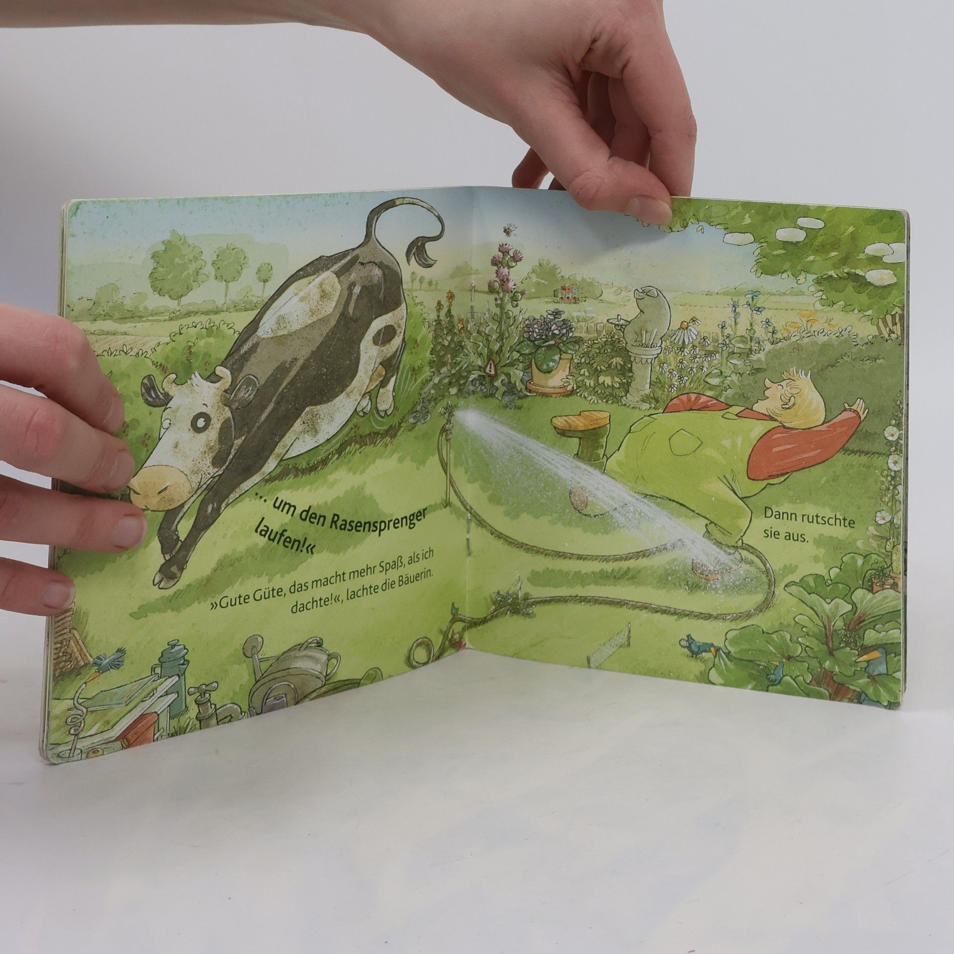 In diesem turbulenten Abenteuer muss die Kuh Lieselotte vor dem Schlafengehen in die Badewanne. Gemeinsam mit den Bauernhoftieren sorgt sie für viel Spaß mit dem Rasensprenger und Gartenschlauch. Am Ende landet sogar die Bäuerin in der Badewanne. Ein lustiges Bilderbuch voller Wasserschlachten und verrückter Hühner.