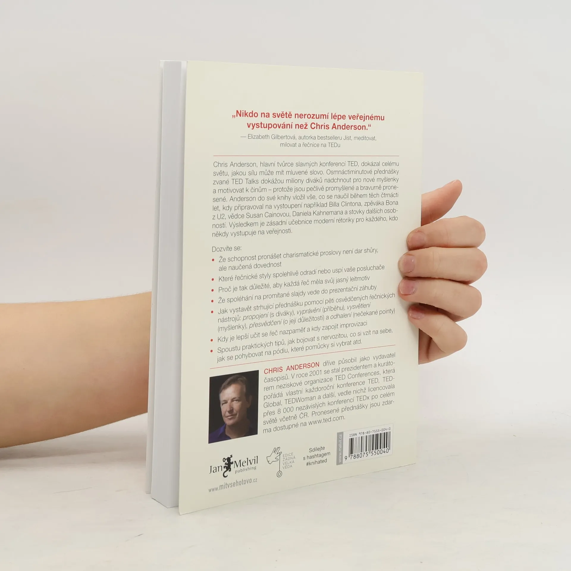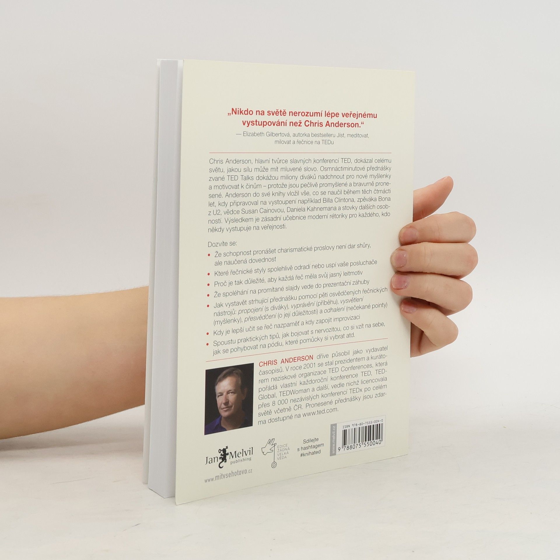 Chris Anderson, hlavní tvůrce TED konferencí, ukazuje sílu mluveného slova prostřednictvím osmnáctiminutových TED Talks, které inspirují miliony lidí po celém světě. Tyto přednášky dokážou změnit postoje a motivovat k činům, přičemž důkazem je, že mluvená řeč může být silnější než psaný text, pokud je pečlivě promyšlená a bravurně pronesená. Anderson se rozhodl proměnit posluchače v rétory a do své knihy zahrnul zkušenosti z čtrnáctileté praxe, během níž připravoval vystoupení známých osobností jako Bill Clinton, Bono či Kenneth Robinson. Naučil se, jak efektivně uchopit téma, pracovat s pozorností diváků a vystavět pointu. Elizabeth Gilbertová, spisovatelka a řečnice na TEDu, mu vzdává hold jako expertovi na veřejný projev. V této stručné, ale hutné knize odhaluje pět klíčových technik úspěšného řečníka: spojení s publikem, vyprávění příběhu, objasnění myšlenky, přesvědčení o její síle a odhalení pointy. Dále varuje před běžnými chybami a odpovídá na praktické otázky, jako co si obléct nebo jak se zbavit nervozity. Mottem TED konference je „Myšlenky, které stojí zato šířit“. Andersonův průvodce vám ukáže, jak šířit ty vlastní.