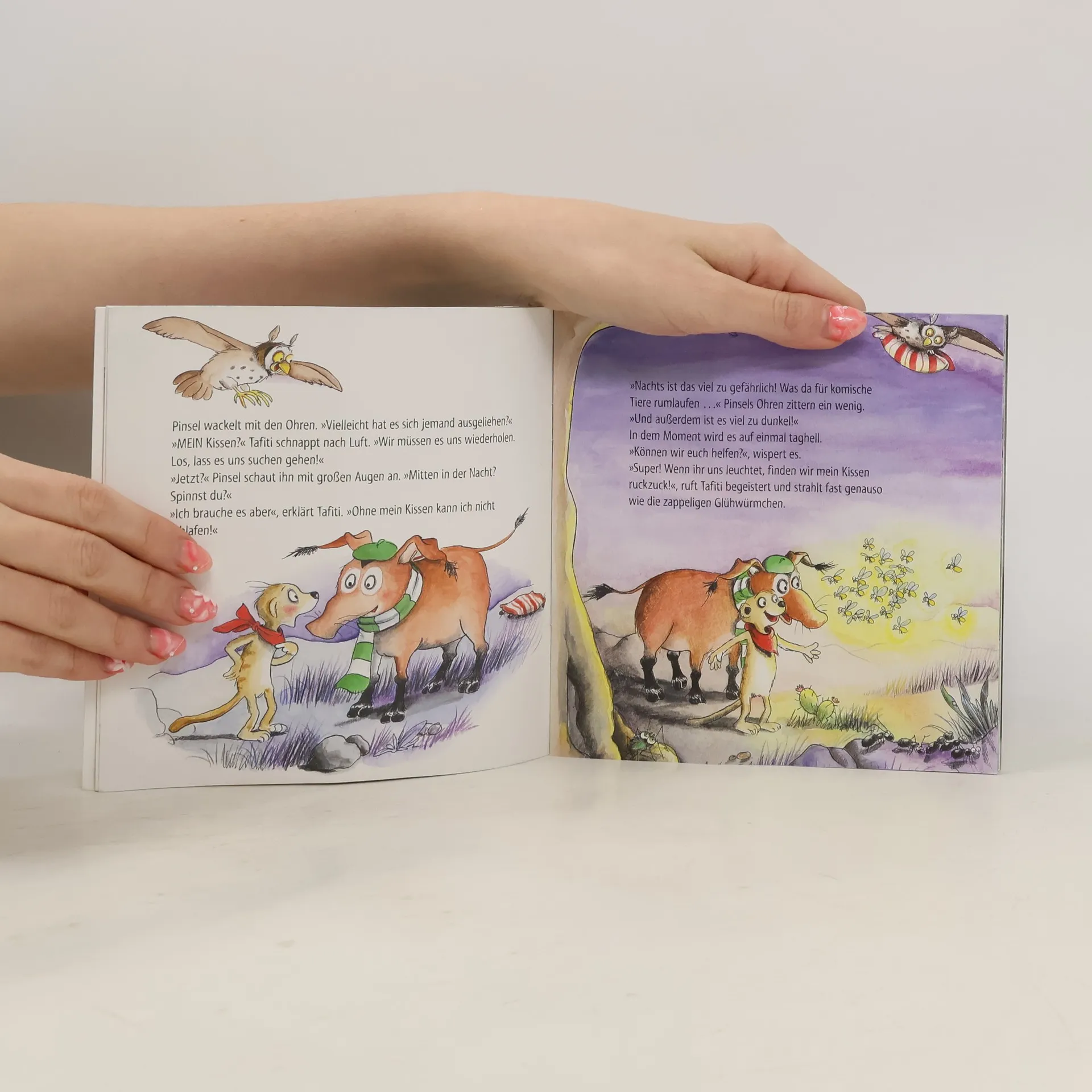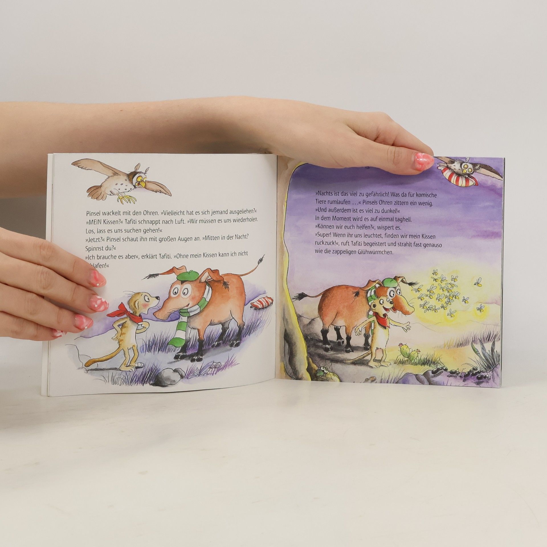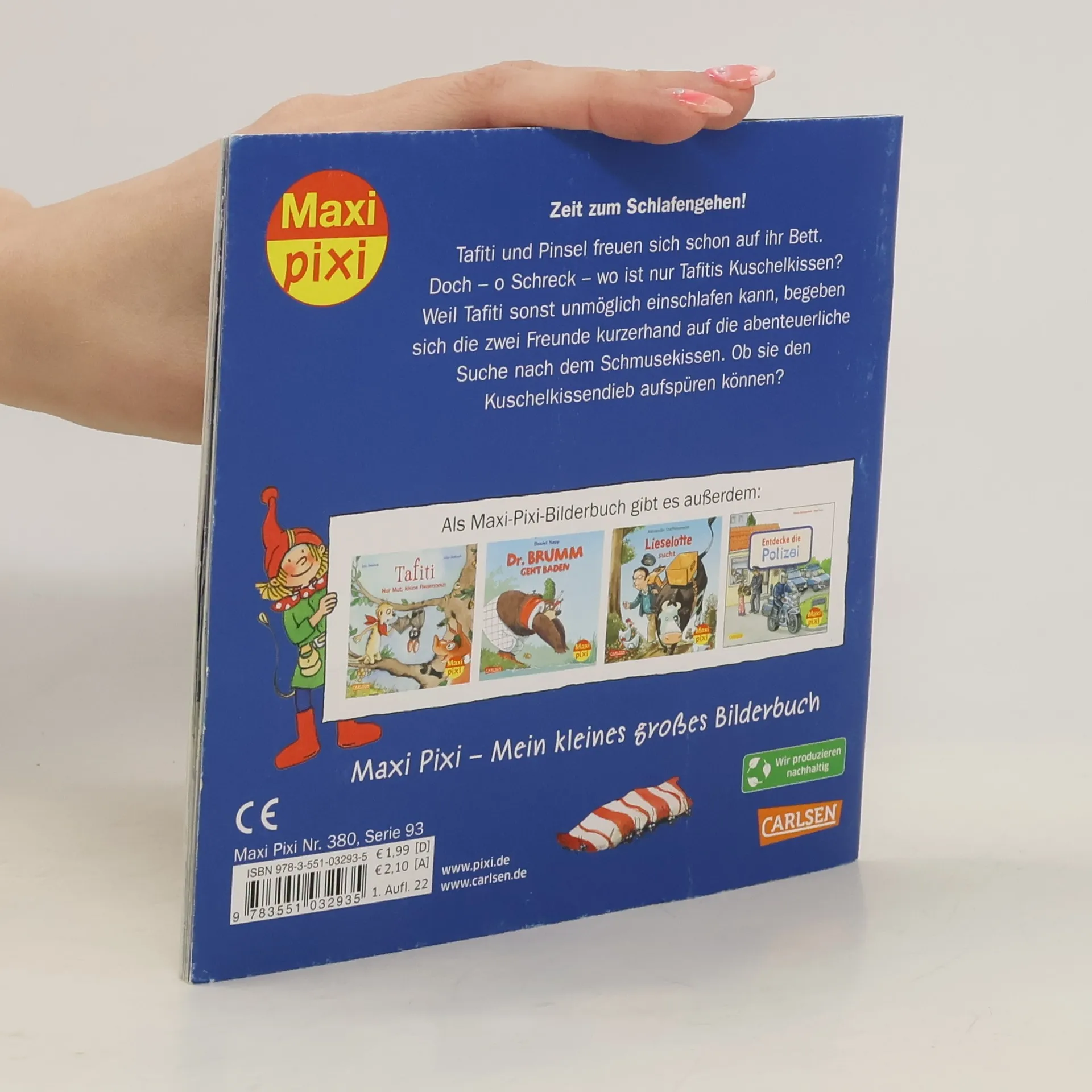 Tafiti und Pinsel machen sich auf die abenteuerliche Suche nach Tafitis Kuschelkissen, das verschwunden ist. Ohne das Kissen kann Tafiti nicht einschlafen. Eine herzerwärmende Geschichte über das Einschlafen und das Teilen. Teil der Maxi Pixi Reihe – kleine große Bilderbücher im Softcover.