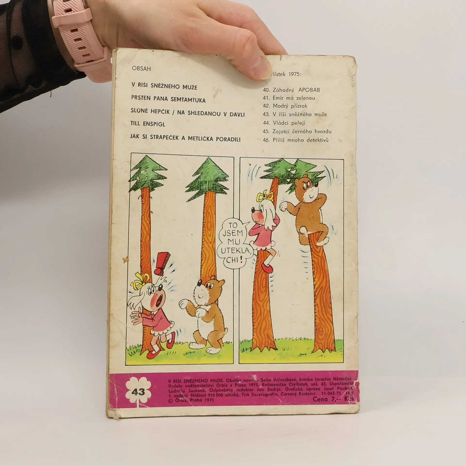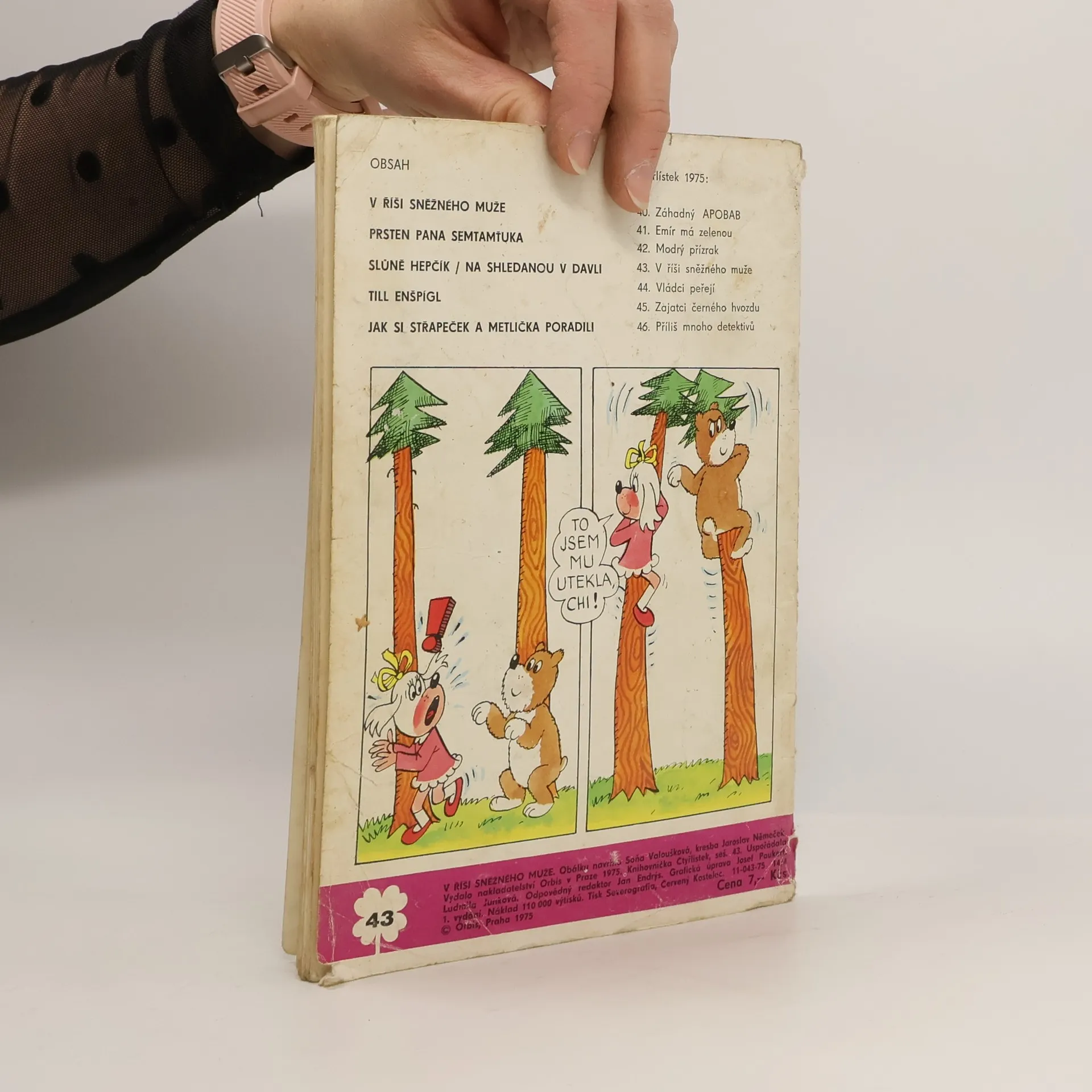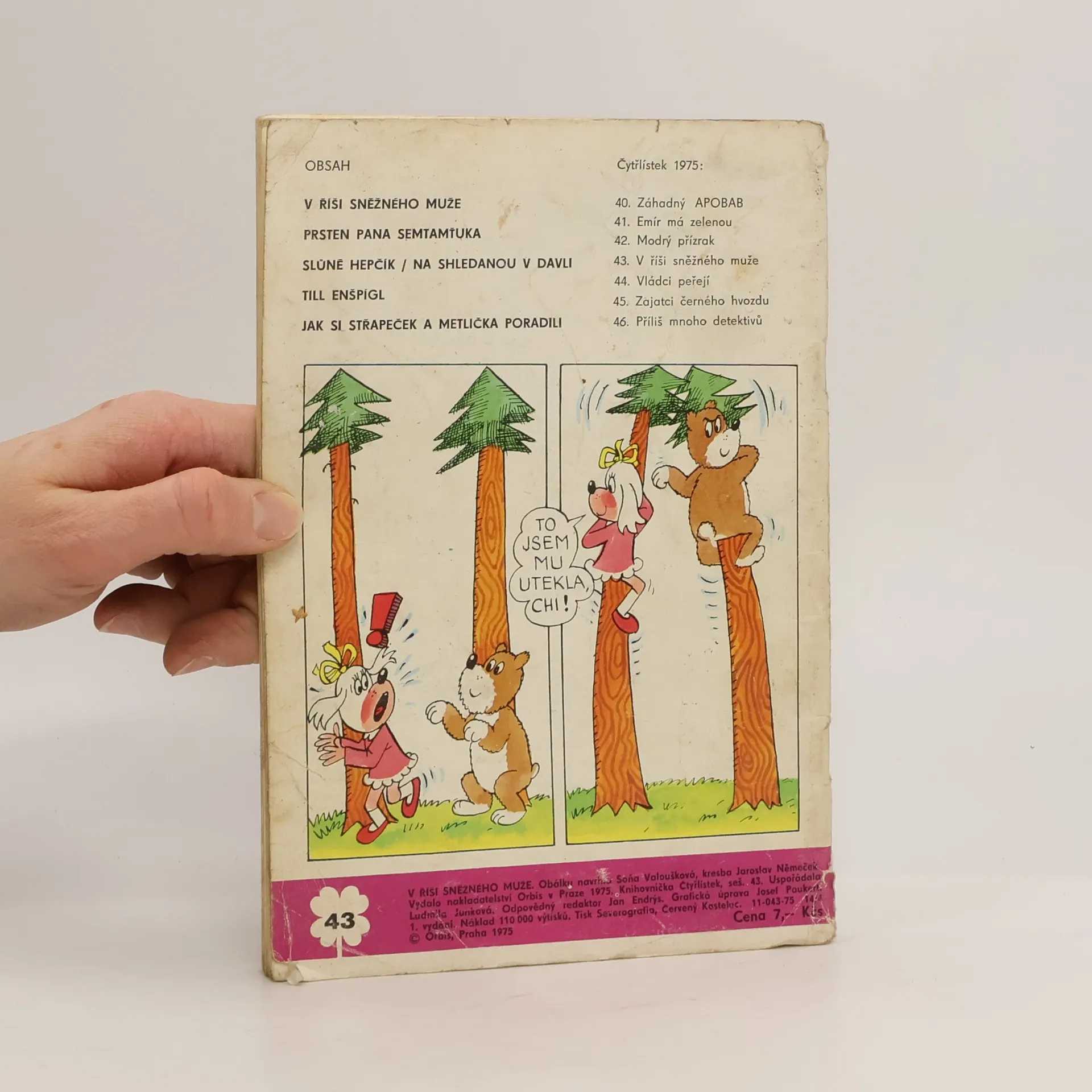 43. díl série. V říši sněžného muže - Ljuba Štíplová, Jaroslav Němeček. Prsten pana Semtamťuka - Svatopluk Hrnčíř, Adolf Born. Slůně Hepčík - Na shledanou v Davli - Petr Karmín, Rudolf Němec. Till Enšpígl - Charles de Coster, Jan Matěják. Jak si Střapeček a Metlička poradili - Bronislav Liberda.