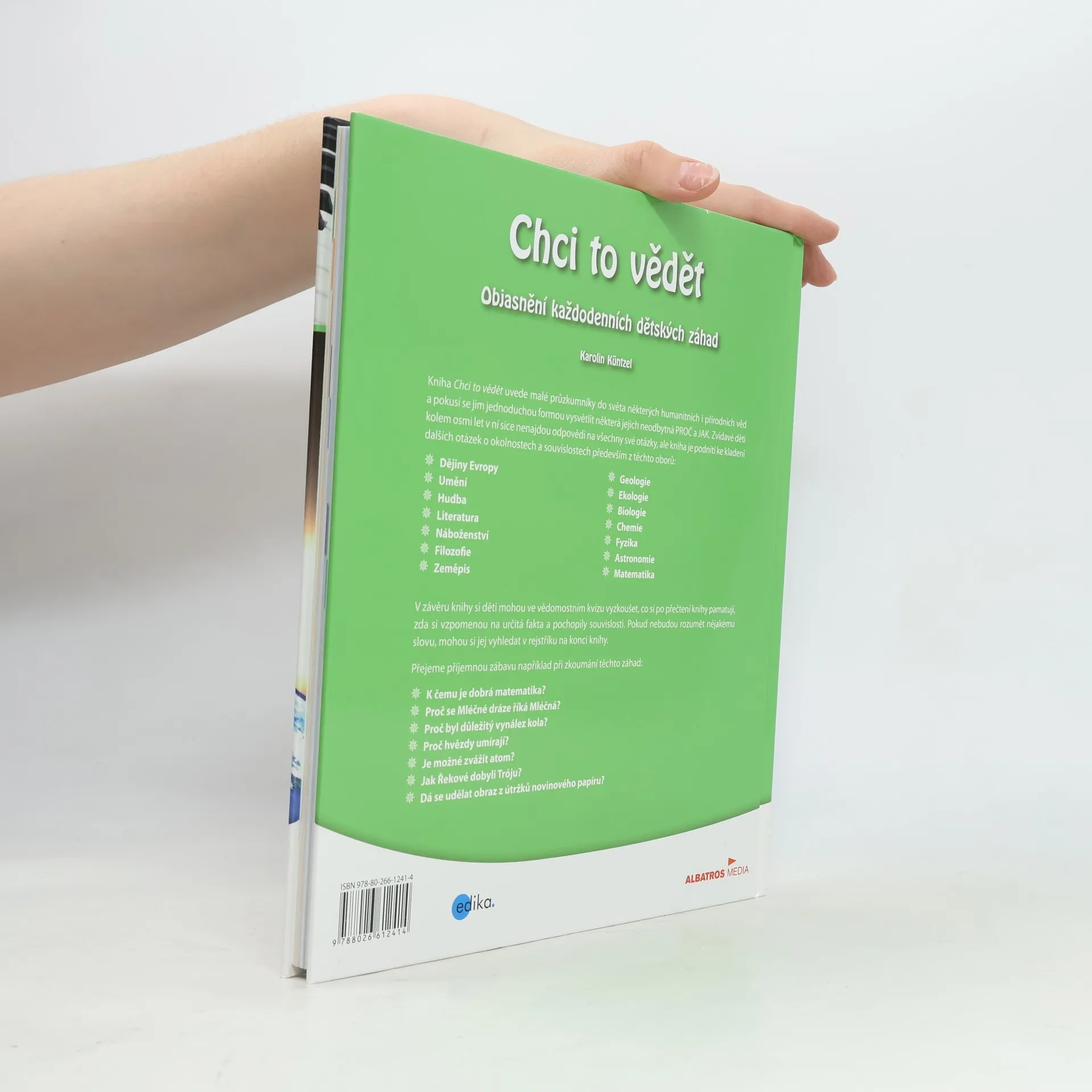 Kniha Chci to vědět uvede malé průzkumníky do světa některých humanitních i přírodních věd, pokusí se jim jednoduchou formou vysvětlit některá jejich neodbytná PROČ a JAK. Zvídavé děti kolem osmi let v ní sice nenajdou odpovědi na všechny své otázky, kniha je spíše podnítí k dalšímu dotazování se po okolnostech a souvislostech především z těchto oborů: Dějiny Evropy Umění Hudba Literatura Náboženství Filozofie Zeměpis Geologie Ekologie Biologie Chemie Fyzika Astronomie Matematika V závěru knihy si děti ve vědomostním kvízu mohou vyzkoušet, co si po přečtení knihy pamatují, zda si vzpomenou na určitá fakta a pochopily souvislosti. Pokud nebudou rozumět nějakému slovu, mohou si jej vyhledat v rejstříku na konci knihy. Přejeme příjemnou zábavu při zkoumání záhad: K čemu je matematika dobrá? Proč se Mléčné dráze říká mléčná? Proč byl důležitý vynález kola? Proč hvězdy umírají? Je možné zvážit atom? Jak dobyli Řekové Tróju? Dá se udělat obraz z útržků novinového papíru?