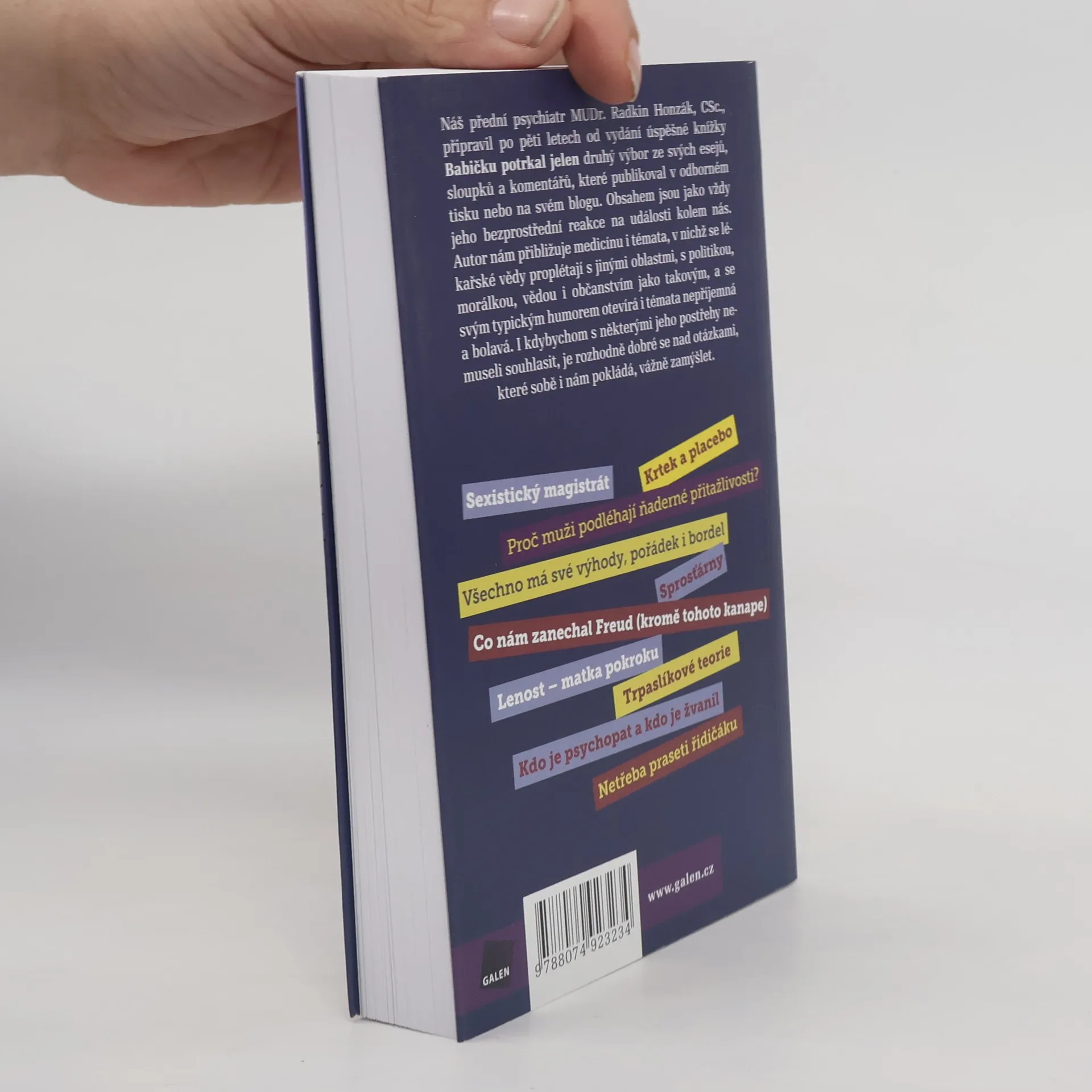 Náš přední psychiatr MUDr. Radkin Honzák, CSc. (* 1939), připravil po pěti letech od vydání knížky Babičku potrkal jelen druhý výbor ze svých esejů, sloupků, komentářů i zamyšlení, které publikoval v odborných časopisech nebo na svém blogu. Obsahem jsou jako vždy jeho bezprostřední reakce na události kolem nás. Autor nám přibližuje medicínu i témata, v nichž se lékařské vědy proplétají s jinými oblastmi, s politikou, morálkou, vědou i občanstvím jako takovým, a se svým typickým humorem otevírá i témata nepříjemná a bolavá. I kdybychom s některými jeho postřehy nemuseli souhlasit, je rozhodně dobré se nad otázkami, které sobě i nám pokládá, vážně zamýšlet.
