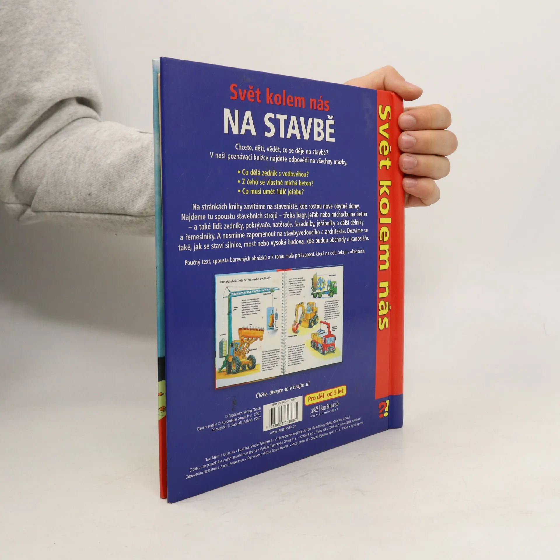 Na stránkách knihy zavíráme na staveniště.l, kde rostou nové obytné domy. Najdeme tu spoustu stavebních strojů a také lidi. Dozvíme se také, jak se staví silnice, most nebo vysoká budova.